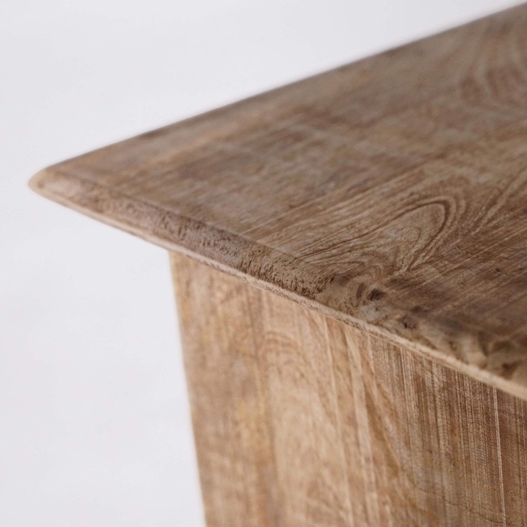 Diese Arbeit der Reduktion hat uns dazu geführt, bei diesem Beistelltisch aus Massivholz eher mit großzügigen Flächen als mit komplexen Formen zu arbeiten. Leicht softened Kanten, sanft gebrochene Ecken und die natürliche Holzoberfläche zeugen von handwerklicher Fertigung. Jeder unserer Handwerker stimmt Farbton und die lichte Patina ab, um den lebendigen Charakter des Mangoholzes dieses Beistelltisches aus Massivholz zu bewahren – und zugleich eine stabile, langlebige Oberfläche zu gewährleisten.