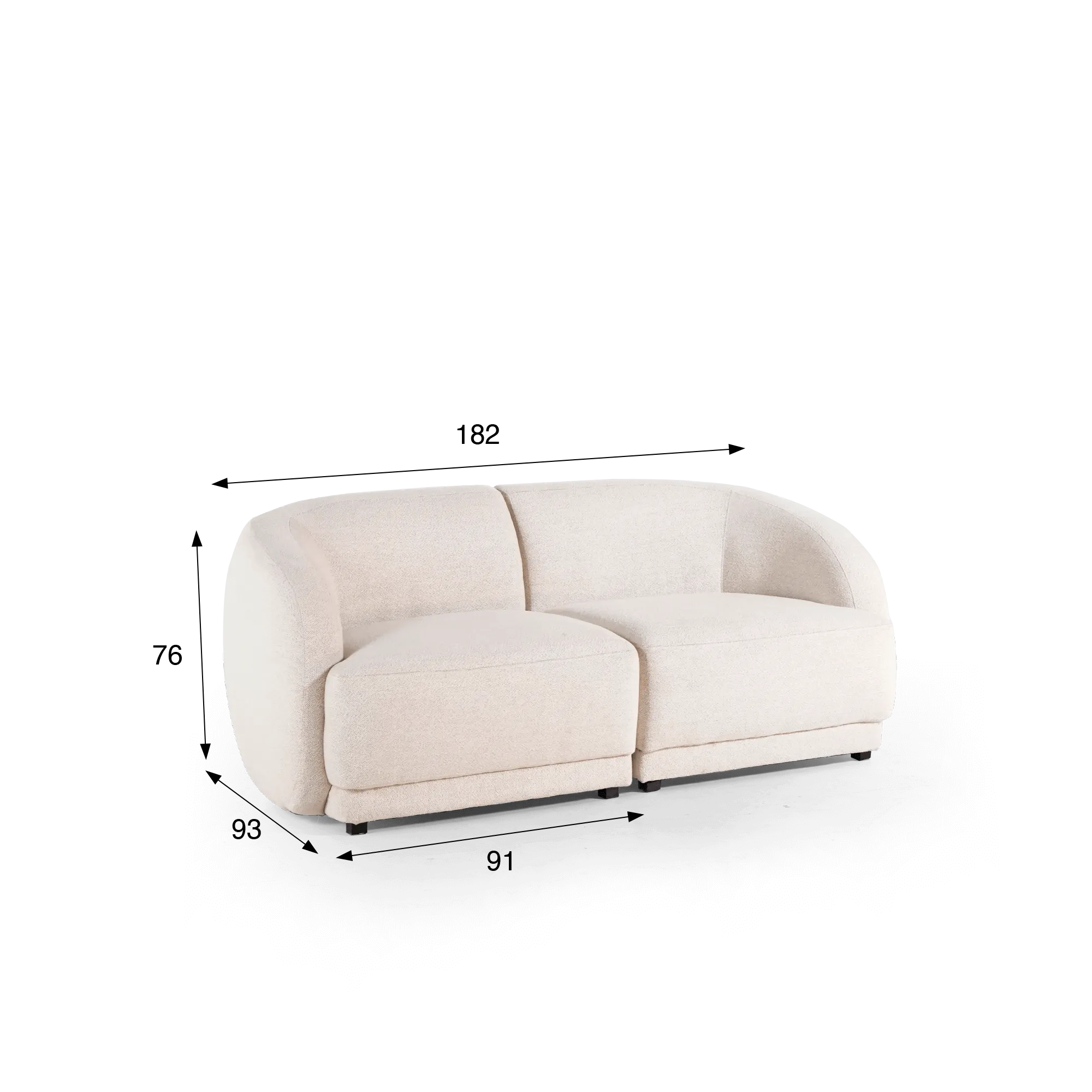 Von unseren Designern als zugleich skulptural und einladend konzipiert, verkörpert das Design-2-Sitzer-Sofa Elora die Eleganz organischer Linien und den Geist des modernen Minimalismus. Seine abgerundeten Formen und die niedrige Silhouette vermitteln sofort eine Sanftheit, die jedes Wohnzimmer in einen Ort der Ruhe und des Miteinanders verwandeln kann. Mit seinen ausgewogenen Proportionen – 182 cm breit, 93 cm tief und 76 cm hoch – fügt sich dieses 2-Sitzer-Sofa harmonisch sowohl in eine städtische Wohnung als auch in ein großzügigeres Zuhause ein.