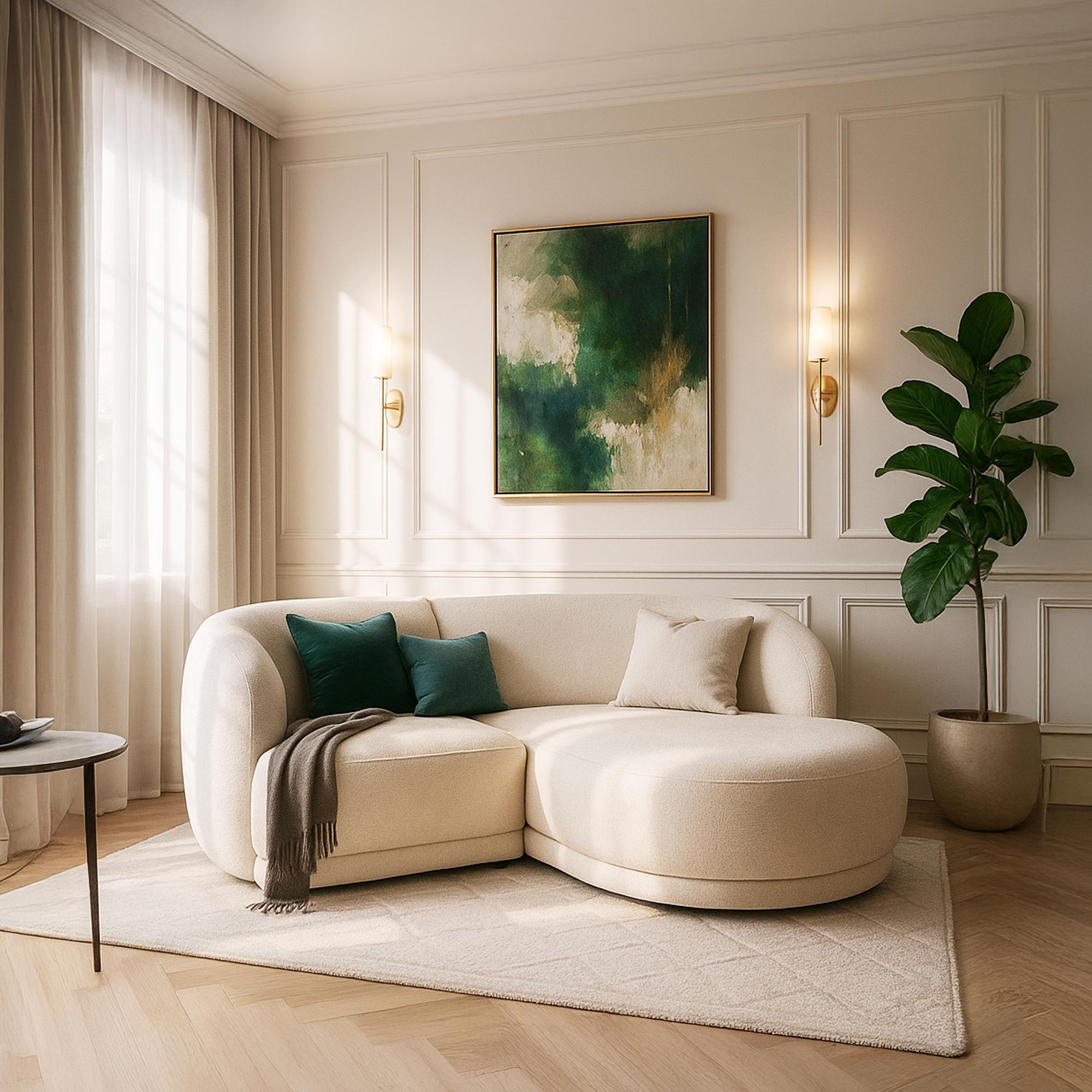 Jedes Detail dieses 3-Sitzer-Ecksofas mit rechter Récamiere wurde durchdacht, um Ästhetik und Funktionalität in Einklang zu bringen: von den sanft geschwungenen Rückenlehnen, die sich der Körperform anpassen, bis hin zu den großzügigen Kissen, die Ruhe versprechen. Wir wollten, dass dieses Sofa sich durch seine handwerkliche Verarbeitung und seine Fähigkeit, ein Interieur zu verwandeln, auszeichnet. In einem hellen Wohnzimmer mit klaren Linien platziert, wird es zum Mittelpunkt des Raumes und schafft eine warme, zeitgemäße Atmosphäre.