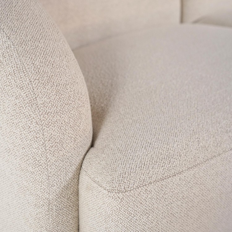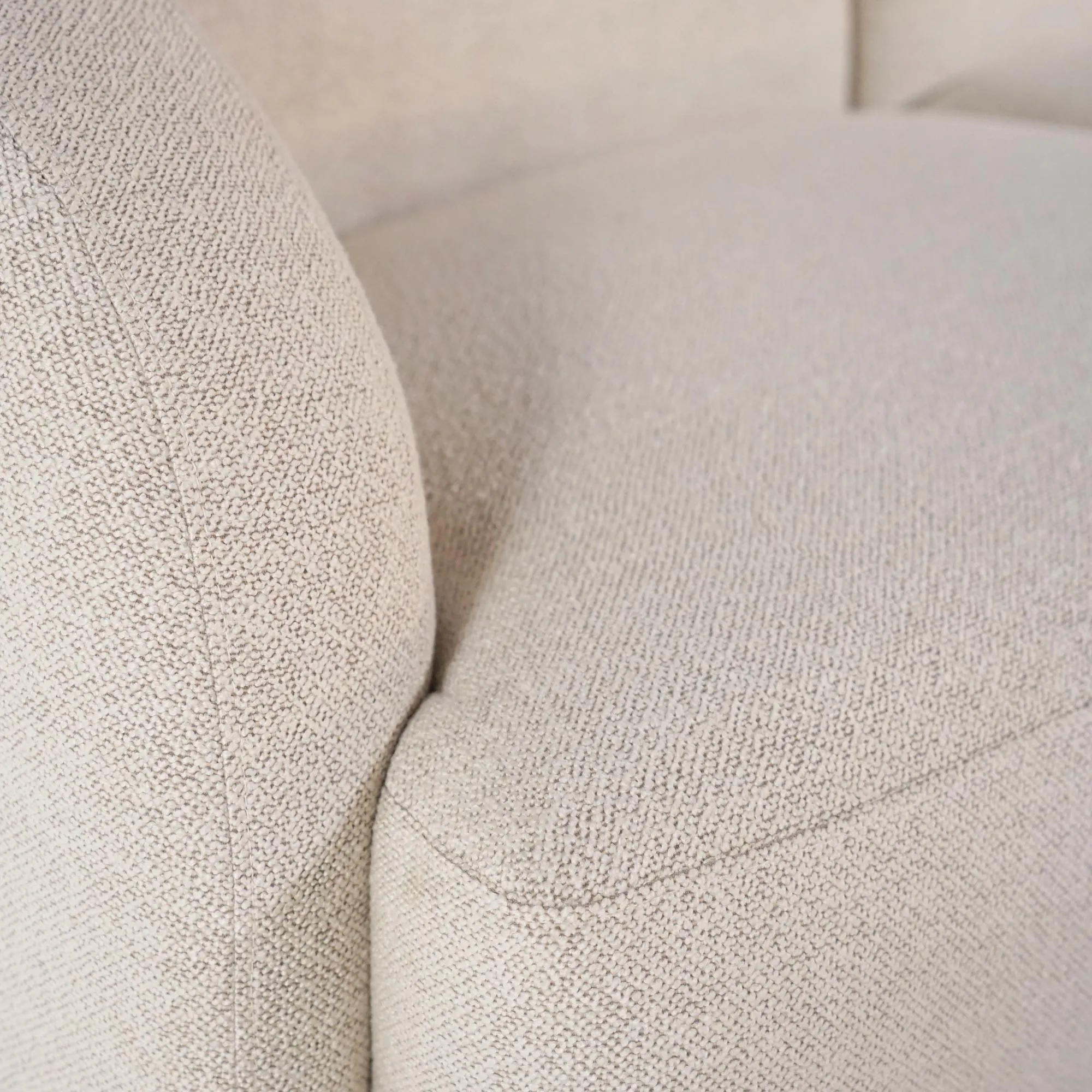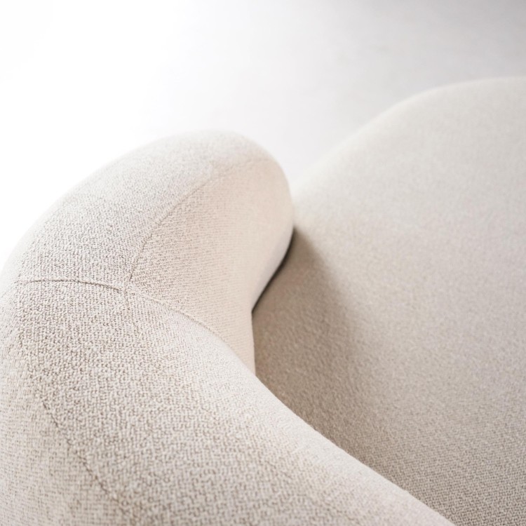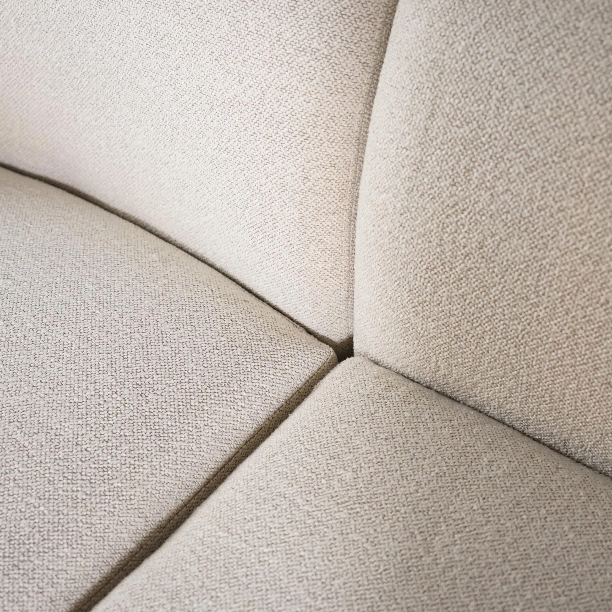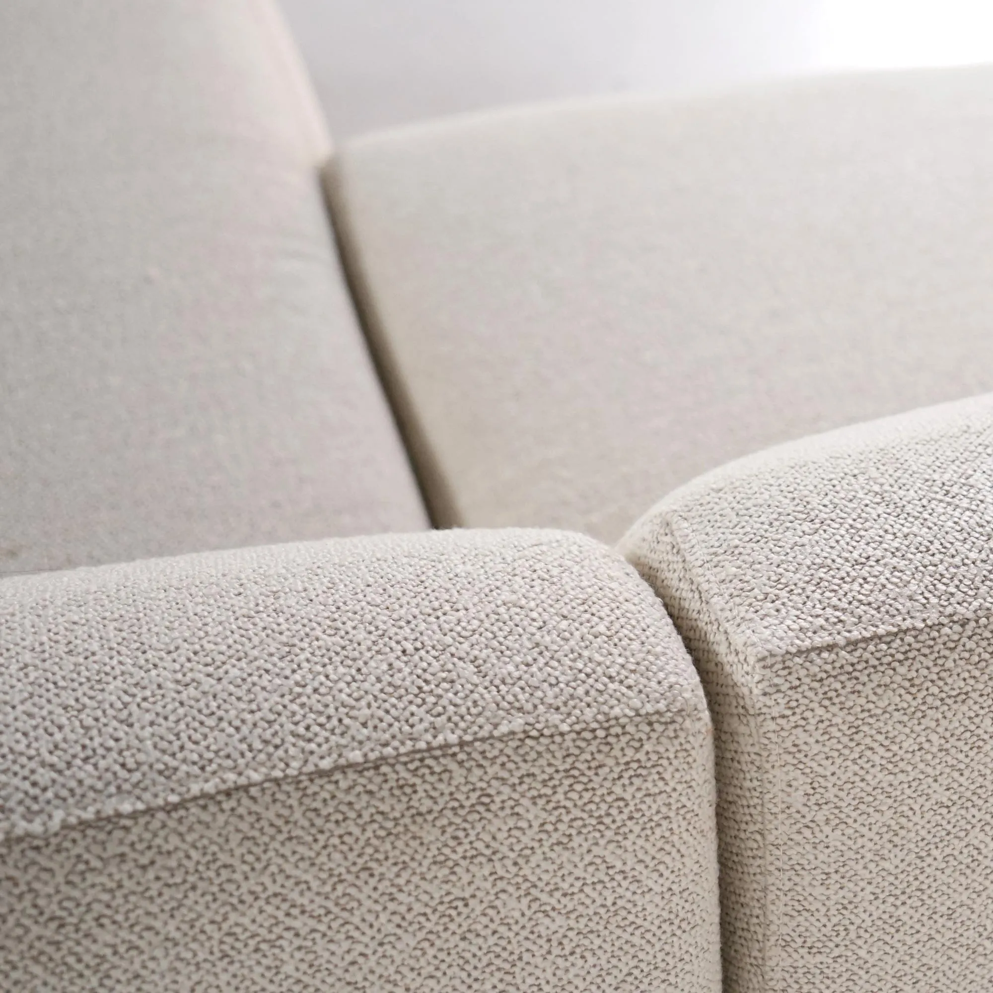 Für dieses 3-Sitzer-Ecksofa mit rechter Récamiere haben wir einen Bouclé-Stoff mit Oeko-Tex®-Zertifikat gewählt, dessen texturierte Oberfläche die umhüllende Form der Sitzfläche hervorhebt. Dieser Bezug mit dichter und widerstandsfähiger Webart verbindet Komfort im Alltag mit Langlebigkeit. Die innere Struktur kombiniert HR-Schaumstoff mit hoher Rückstellkraft, Taschenfedern und mehrschichtigen PU-Schaum, um einen Sitzkomfort zu bieten, der sowohl weich als auch ergonomisch ist und über die Jahre hinweg erhalten bleibt. Die dezenten Kunststofffüße, fast unsichtbar, verstärken die visuelle Leichtigkeit und ermöglichen es dem Sofa, sich mühelos in verschiedene Wohnstile einzufügen.