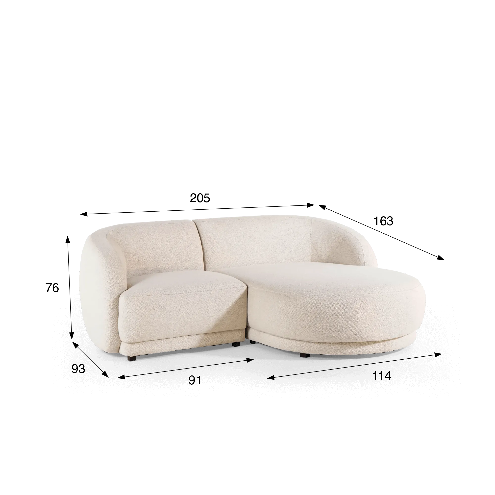 Entworfen von unseren Designern in der Elora-Kollektion, vereint dieses 3-Sitzer-Ecksofa mit rechter Récamiere organische Linien und raffinierten Minimalismus. Die weiche, abgerundete Silhouette lädt auf natürliche Weise zur Entspannung ein, während die gut abgestimmten Maße von 205 cm Breite, 163 cm Tiefe und 76 cm Höhe es zu einem idealen Möbelstück machen, um ein modernes Wohnzimmer zu strukturieren.