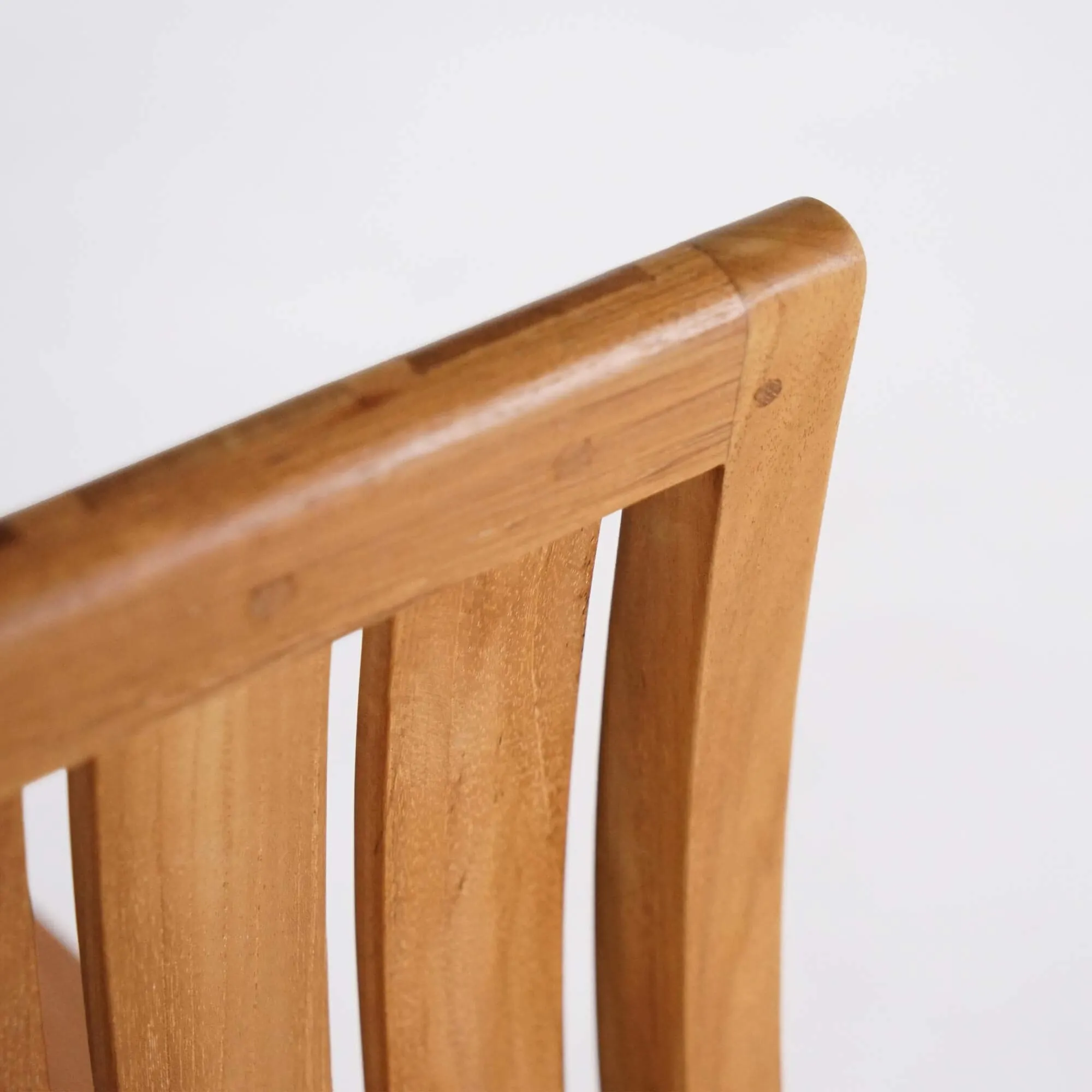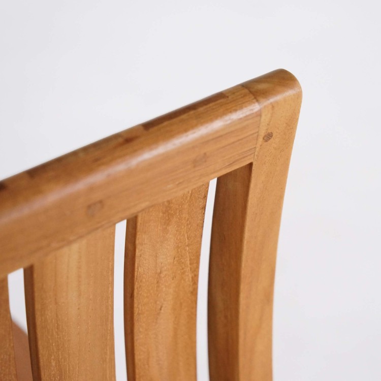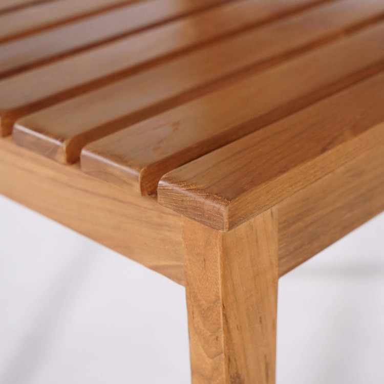 Die Sitzfläche dieses Gartenstuhls aus Holz, bestehend aus leicht voneinander abgesetzten Teakholzleisten, fördert die Luftzirkulation und sorgt für angenehmen Komfort bei Mahlzeiten oder entspannten Momenten im Freien rund um einen Esstisch. Mit einer Sitzbreite von etwa 41 cm bietet der Stuhl ausreichend Platz und bleibt zugleich leicht in der Anmutung und einfach zu bewegen. Die Rückenlehne dieses Gartenstuhls aus Teakholz, aus sanft gebogenen vertikalen Leisten gefertigt, folgt natürlich der Rückenlinie und verstärkt das Gefühl von Halt. Diese dezente Ergonomie ist das Ergebnis einer sorgfältigen Arbeit an Proportionen und Winkeln der Konstruktion.