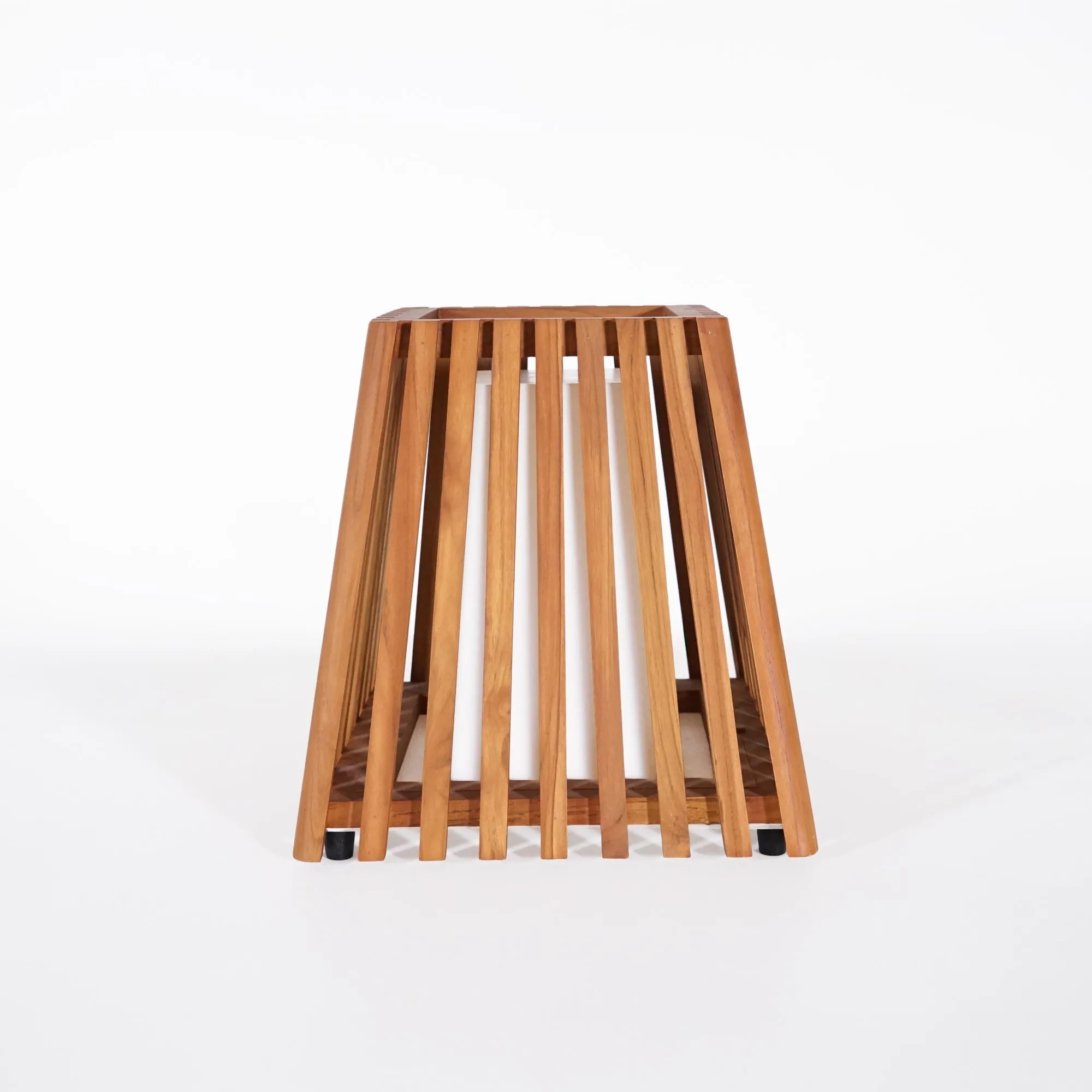 Als wir die Außenleuchte aus Teakholz Nori entworfen haben, wollten wir eine Leuchte schaffen, die die Momente im Garten mit einer zugleich warmen und unaufdringlichen Präsenz begleitet. Unser Ausgangspunkt war Teakholz – eine Holzart, die wir seit langem für ihre natürliche Widerstandsfähigkeit im Außenbereich und für die Tiefe ihrer Maserung schätzen. So entstand eine Leuchte mit offenen, luftigen Linien, deren Lattenkonstruktion die Schönheit von Massivholz zeigt und das Licht zugleich frei zirkulieren lässt.