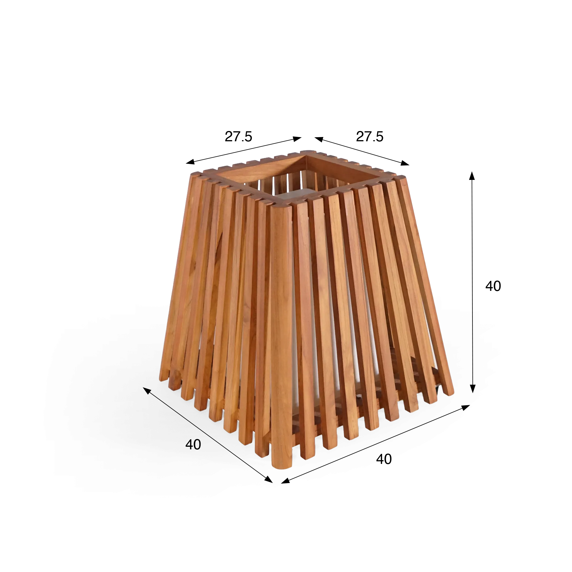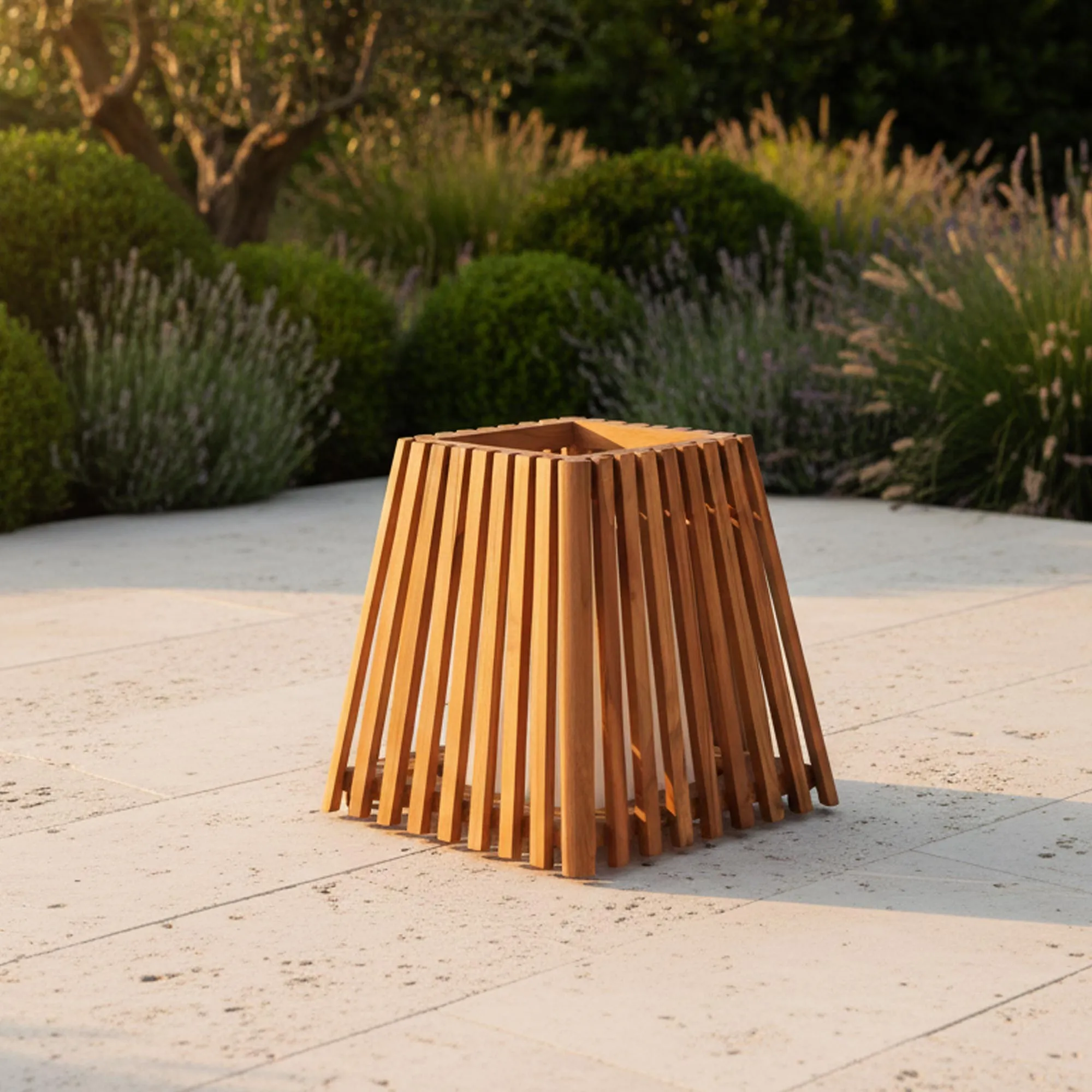 Mit ihren ausgewogenen Proportionen von 40 cm Höhe und einem Sockel von 40 x 40 cm findet die Außenleuchte aus Teakholz Nori ganz natürlich ihren Platz auf der Terrasse, neben einer Gartenlounge oder entlang eines Weges. Die kompaktere obere Öffnung von etwa 27,5 cm formt eine leicht ausgestellte Silhouette, die dem Ganzen eine schöne optische Stabilität verleiht. Diese Form wurde dafür entwickelt, das Licht weich und umhüllend zu streuen und dem Außenbereich zugleich eine grafische Note zu geben.