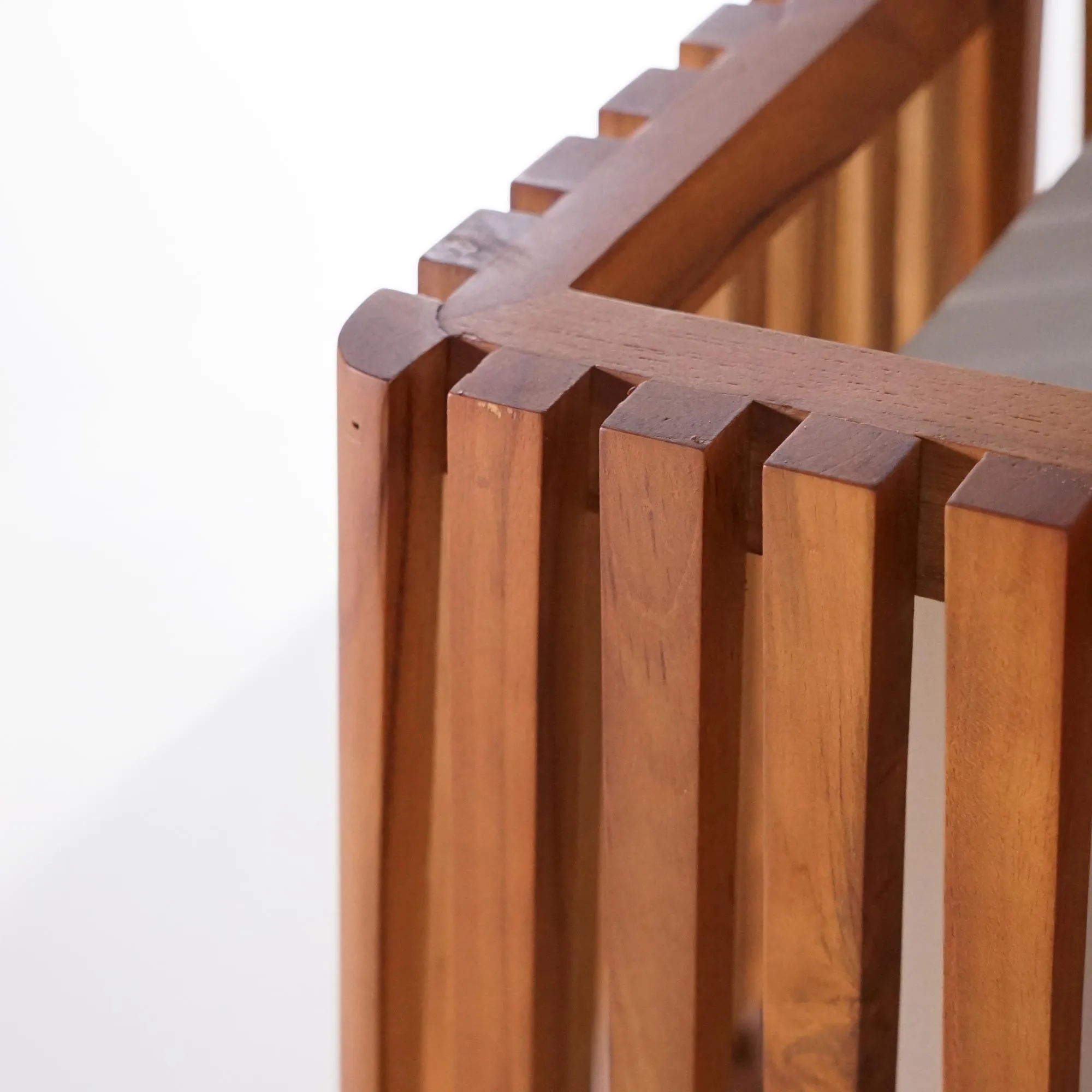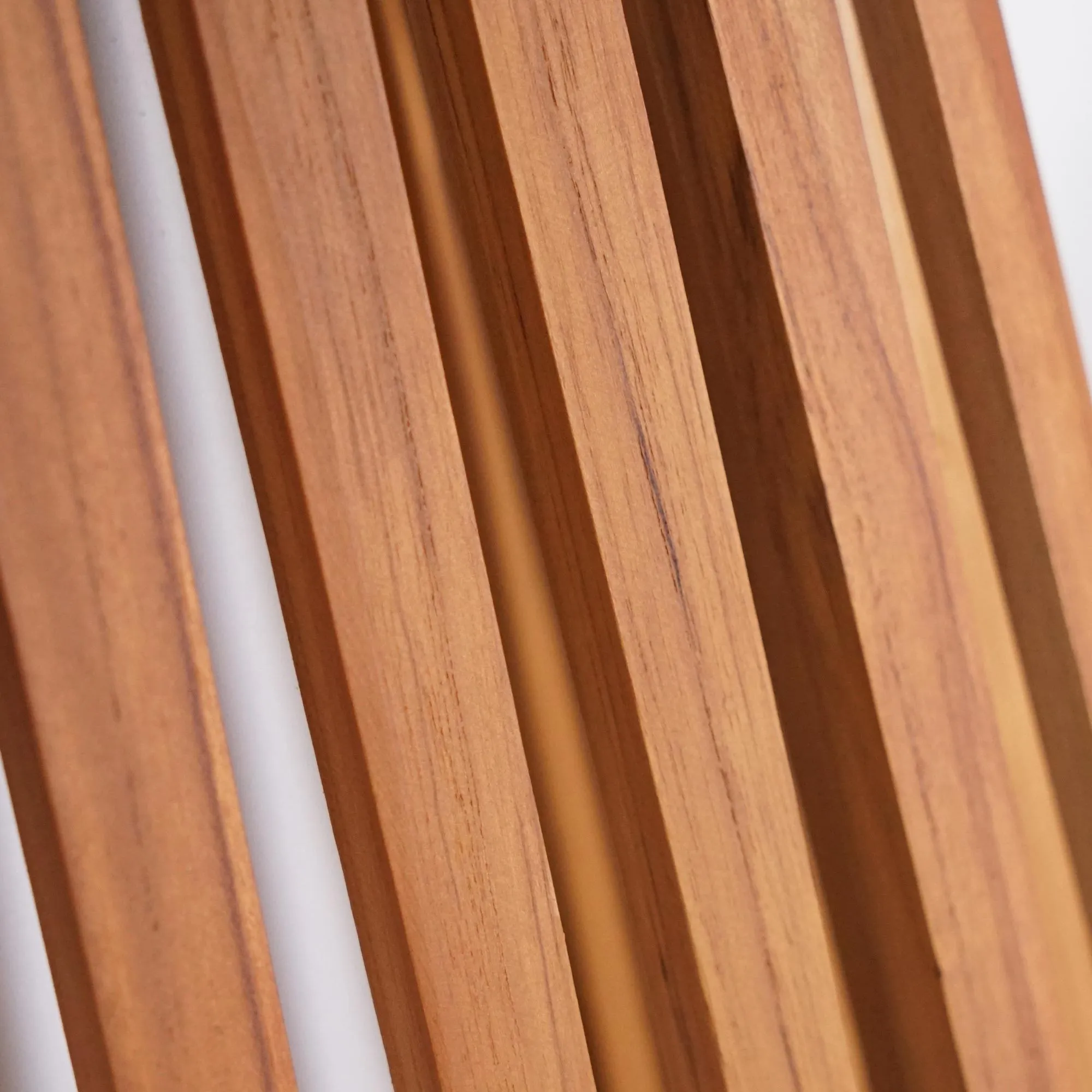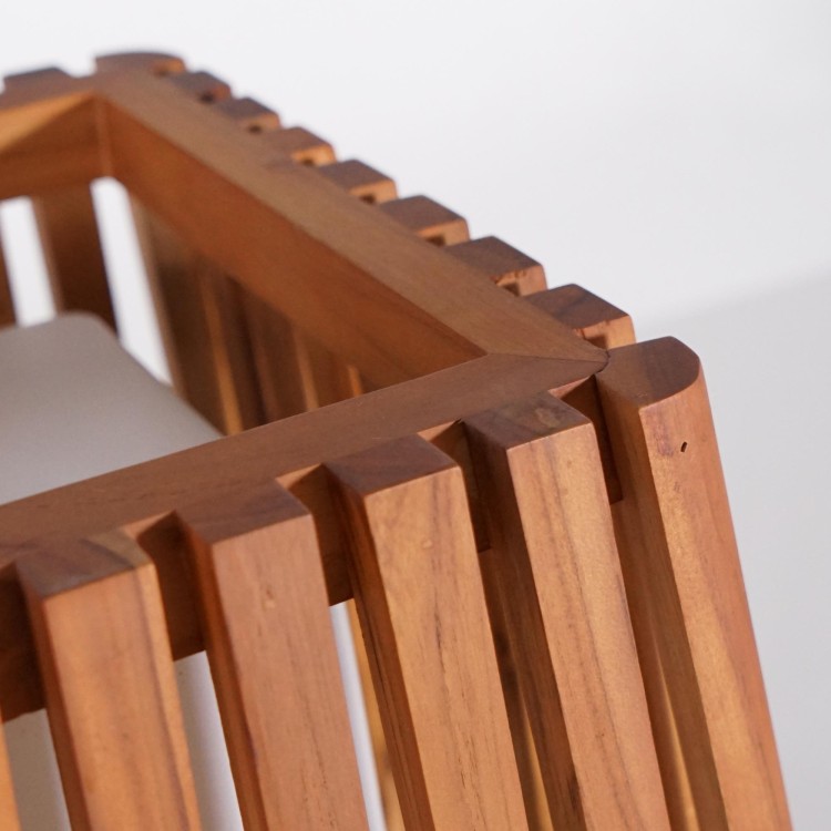Unsere Designer haben jedes Detail der Konstruktion dieser Außenleuchte aus Teakholz ausgearbeitet, damit die vertikalen Lamellen einen harmonischen Rhythmus bilden. Wenn die Leuchte eingeschaltet ist, fällt das Licht durch die Zwischenräume und wirft auf den Boden ein feines Schattenspiel, das die Atmosphäre einer Terrasse bei Einbruch der Dämmerung verwandelt. Teakholz mit seinen warmen Nuancen und seiner natürlich satinierten Haptik fängt das Licht ein und bringt die ganze Tiefe des Materials zur Geltung.