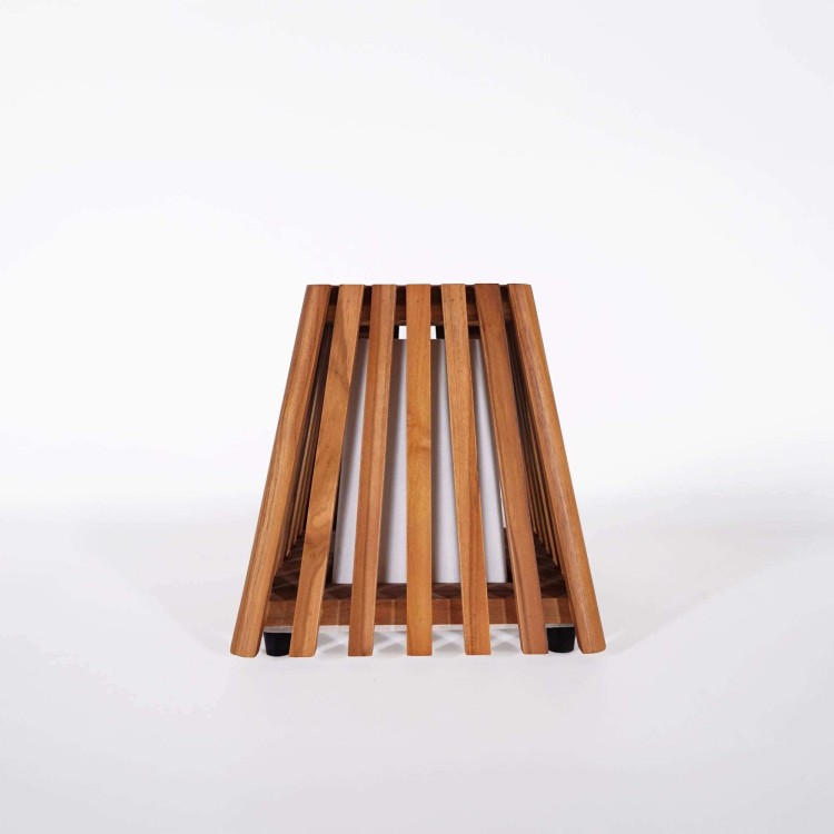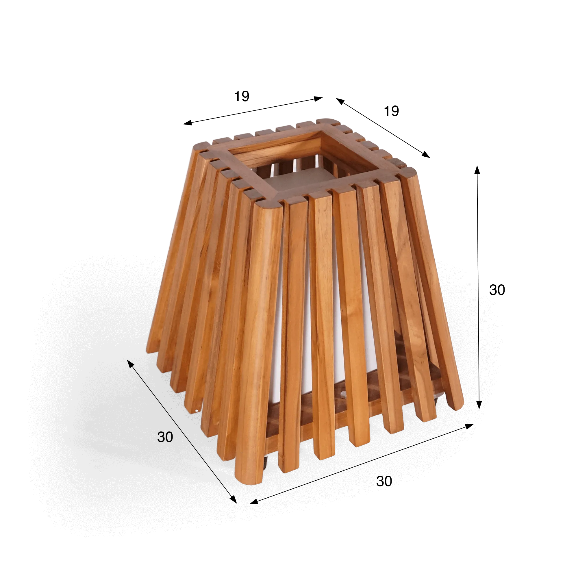 Mit ihren kompakten Proportionen von rund 30 cm Höhe findet diese Teakholz-Außenleuchte mühelos ihren Platz auf der Terrasse, neben einer Gartenlounge oder entlang eines Weges. Der quadratische Sockel von etwa 30 x 30 cm verleiht ihr eine dezente, aber selbstbewusste Präsenz, während die oben etwas engere Öffnung das Gesamtbild klar strukturiert. Dieses Spiel der Proportionen ermöglichte es uns, eine Leuchte zu gestalten, die das Licht sanft streut und zugleich ein echtes dekoratives Element im Außenraum setzt.