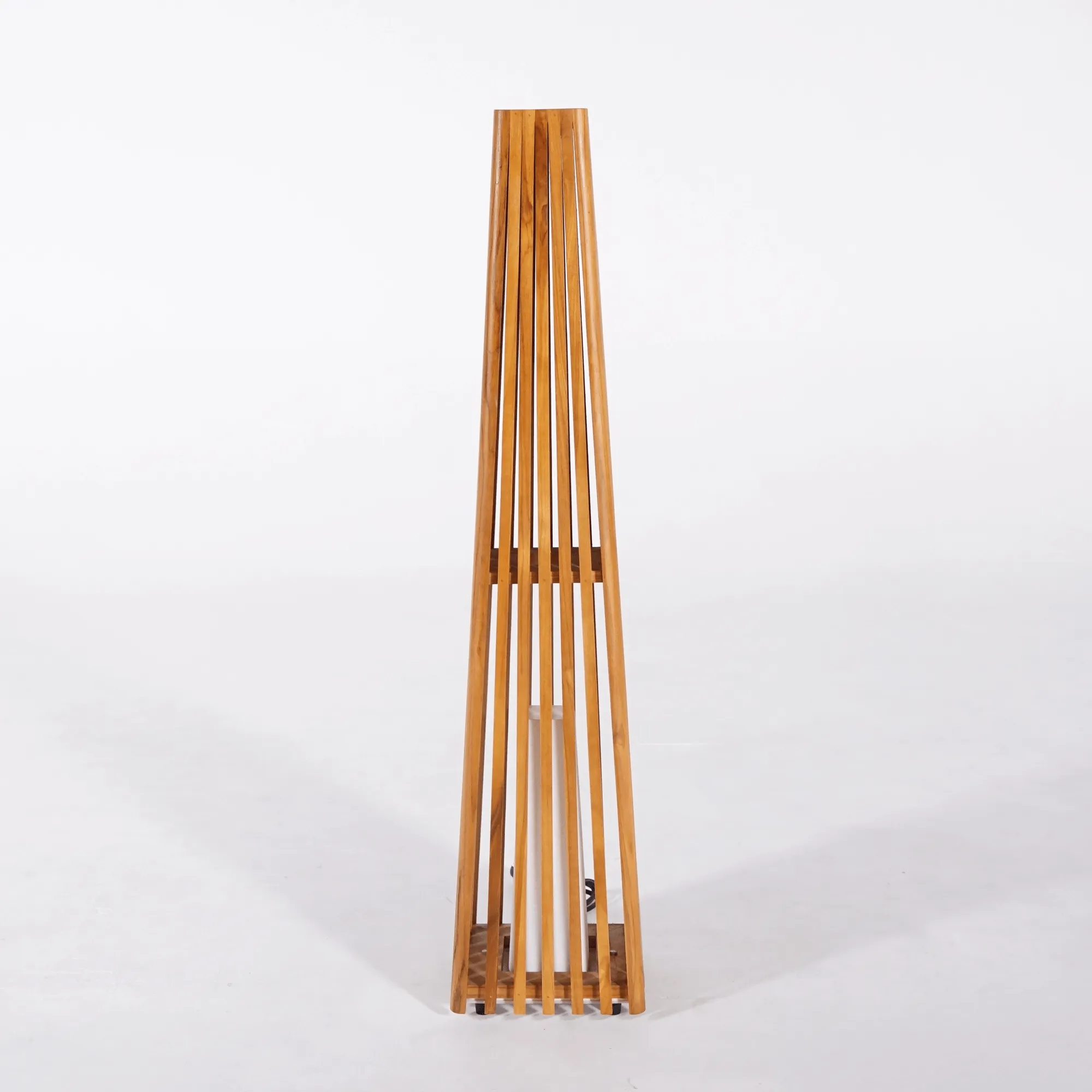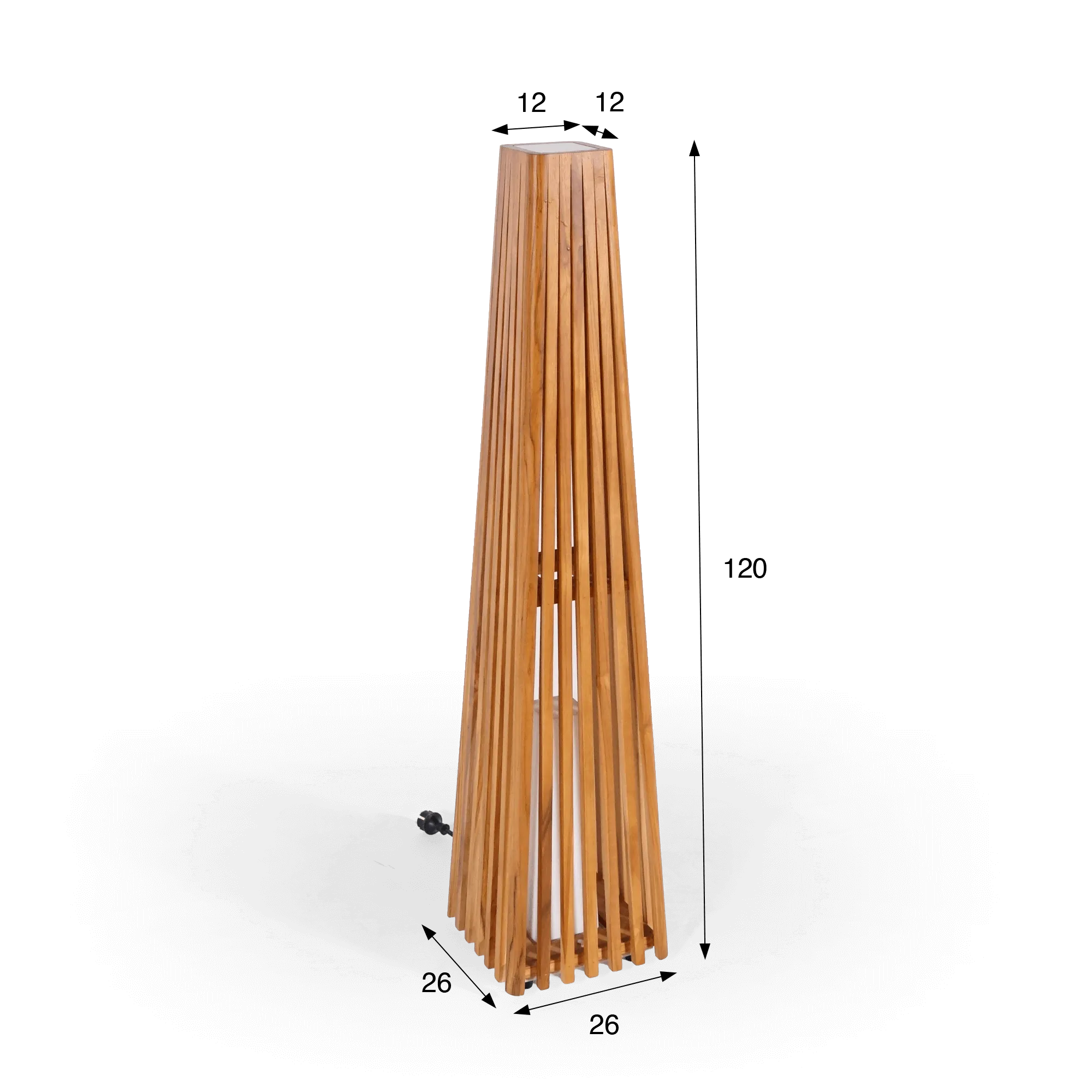 Die Konstruktion der Außenleuchte Taro besteht vollständig aus massivem Teakholz, einer Holzart, die wir besonders wegen ihrer natürlichen Widerstandsfähigkeit gegenüber Witterungseinflüssen schätzen. Dieses dichte, langlebige Holz verträgt Temperatur- und Feuchtigkeitsschwankungen hervorragend und bewahrt dabei seinen warmen Charakter. Jede Teakholz-Latte wird sorgfältig angeordnet und bildet eine Architektur, die sich zum oberen Ende hin leicht verjüngt. Dieses Spiel vertikaler Linien schafft einen harmonischen Rhythmus und lässt das Licht sanft und umhüllend austreten.