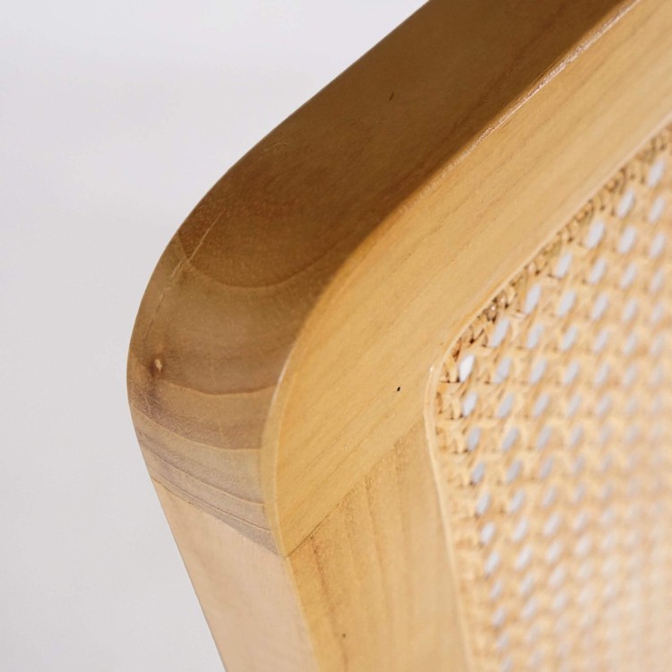 Wir haben dieses Holz-Kopfteil so konzipiert, dass es sich mühelos in unterschiedliche Einrichtungsstile einfügt. In einem minimalistischen Schlafzimmer bringt es eine weiche Note; in einer eher bohèmehaften Atmosphäre verlängert es das Spiel natürlicher Materialien; in einem modernen Ambiente balanciert es den Raum durch seine visuelle Wärme aus. Genau dieser Kontrast aus Massivholz und Rohrgeflecht ist einer der Punkte, auf die wir am meisten stolz sind: Er verleiht dem Bett Leichtigkeit und Charakter, ohne die Silhouette zu überladen.