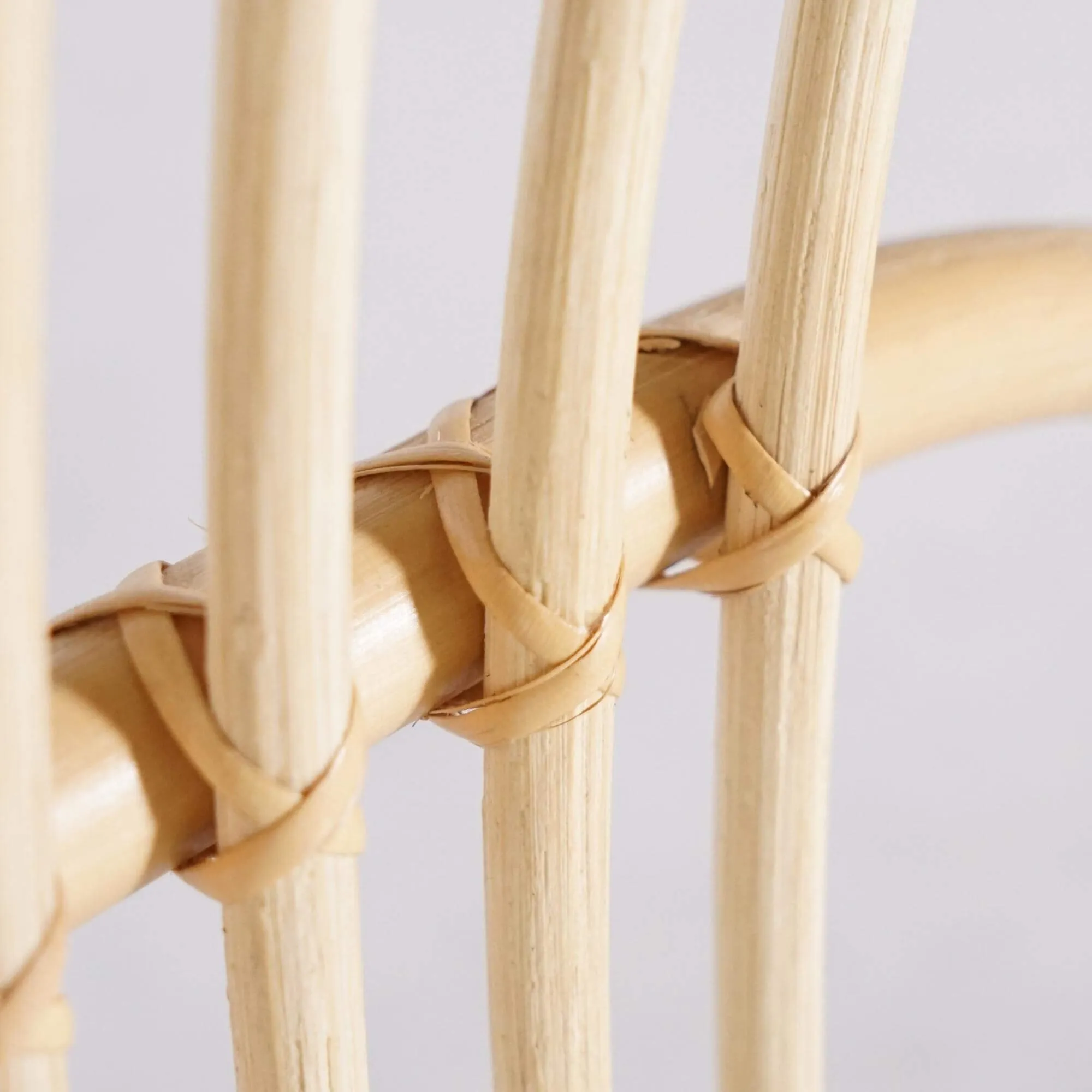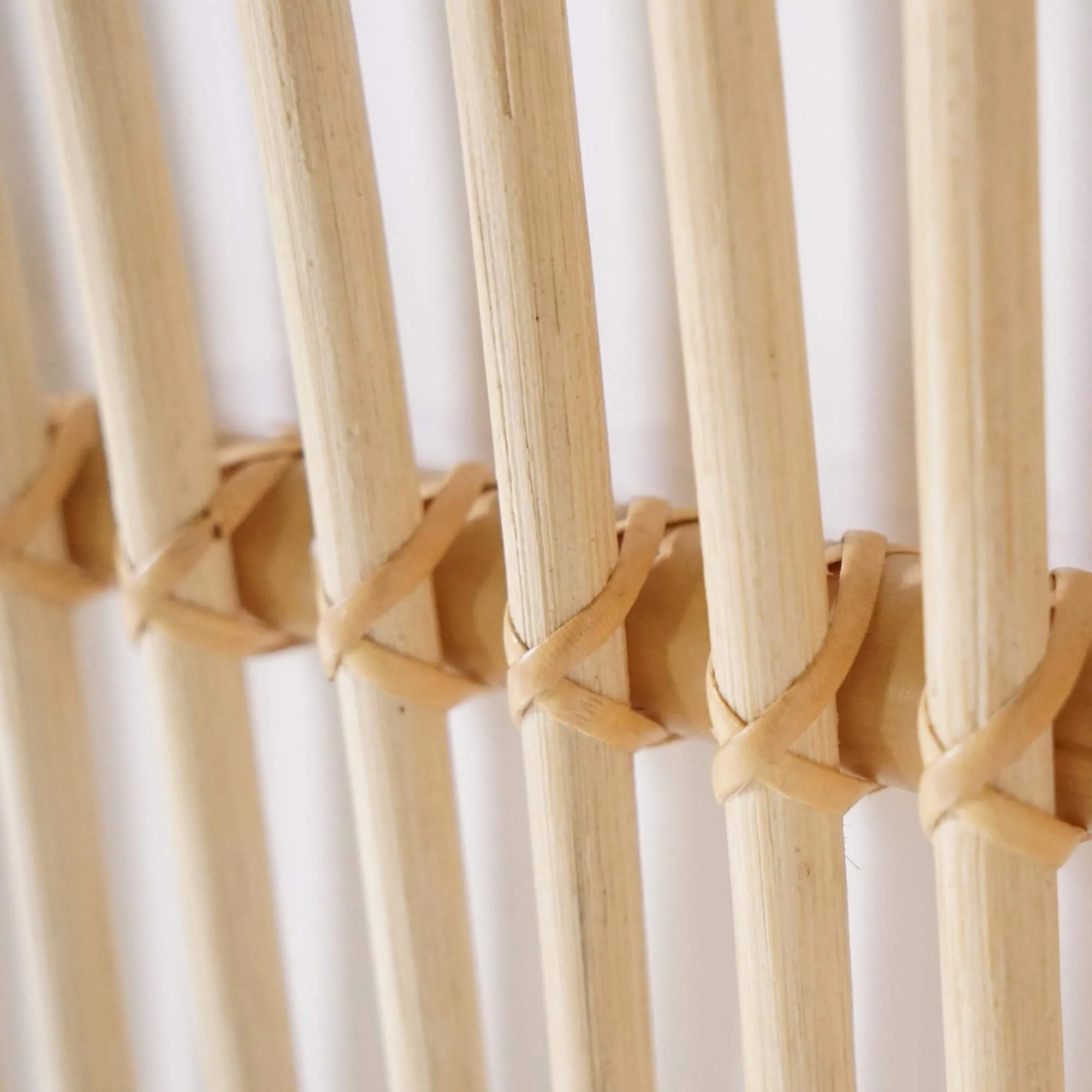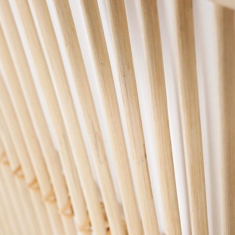 Vollständig aus Rattan gefertigt lässt die Struktur dieses Rattan-Kopfteils die naturellen Nuancen der Faser sichtbar werden – mal honigfarben, mal sandig – mit einem dezenten Glanz, der fein auf das Morgenlicht reagiert. Die Bindungen wirken wie zurückhaltende, aber wesentliche Handwerks-Details und zeugen von der Sorgfalt, die in jeden Fertigungsschritt einfließt. Genau diese Handarbeit schätzen wir an diesem Rattan-Kopfteil besonders: das Material sprechen lassen – ohne künstliche Effekte und ohne Überflüssiges.