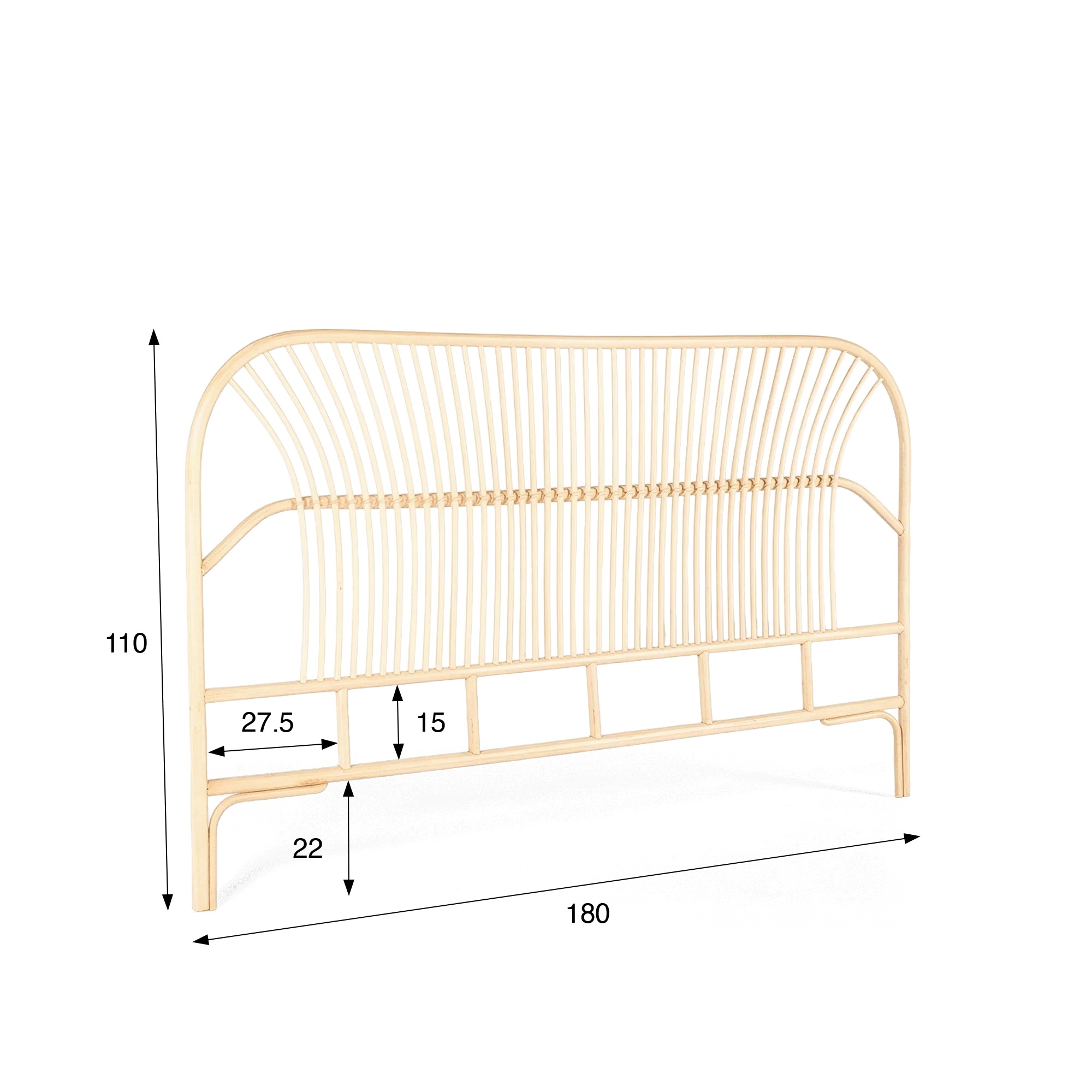 Mit 180 cm Breite und 110 cm Höhe lässt sich das Rattan-Kopfteil Paloma ganz einfach hinter ein Bett im Format 180 × 200 cm stellen und entfaltet sofort seine volle Wirkung. Die Installation erfordert keinen Aufbau: Man schiebt die Konstruktion lediglich an die Wand und schafft so einen echten Blickfang im Raum. Unter der Linie der vertikalen Rattanstreben lässt eine offene untere Querstange das Volumen dieses Rattan-Kopfteils atmen und vermittelt ein Gefühl von Balance.