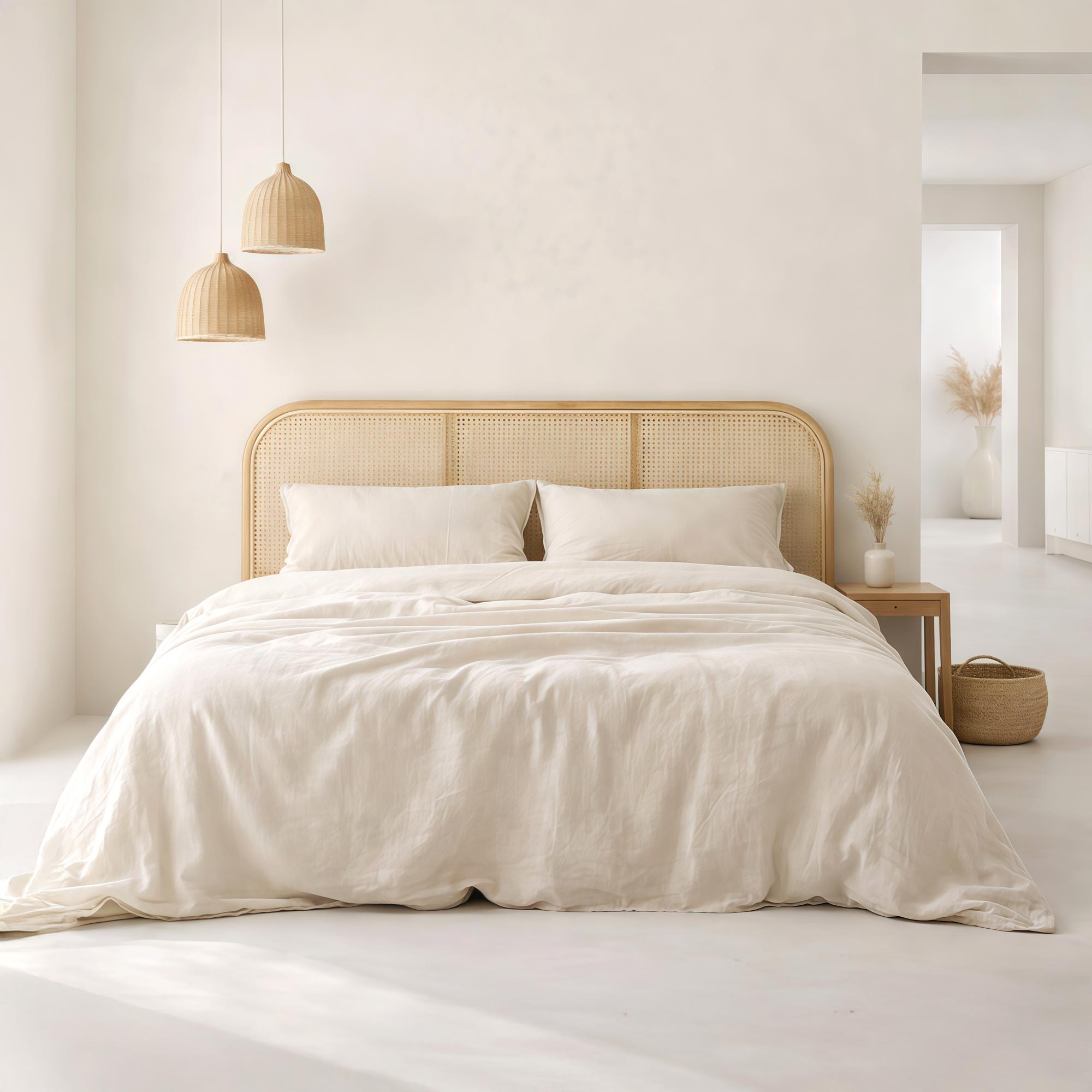 Diese Konstruktion lässt viel Freiheit bei der Gestaltung. Das Rattan-Kopfteil Manila passt ganz natürlich in helle Interieurs mit Japandi-Einflüssen oder Boho-Charakter, lässt sich aber ebenso gut mit mineralischeren Materialien wie Sichtspachtelbeton, Leinen, Keramik oder Massivholz kombinieren. Es schafft eine ruhige Atmosphäre, die das Einschlafritual unterstützt, und bringt jene handwerkliche Note mit, die im Alltag den Unterschied macht.