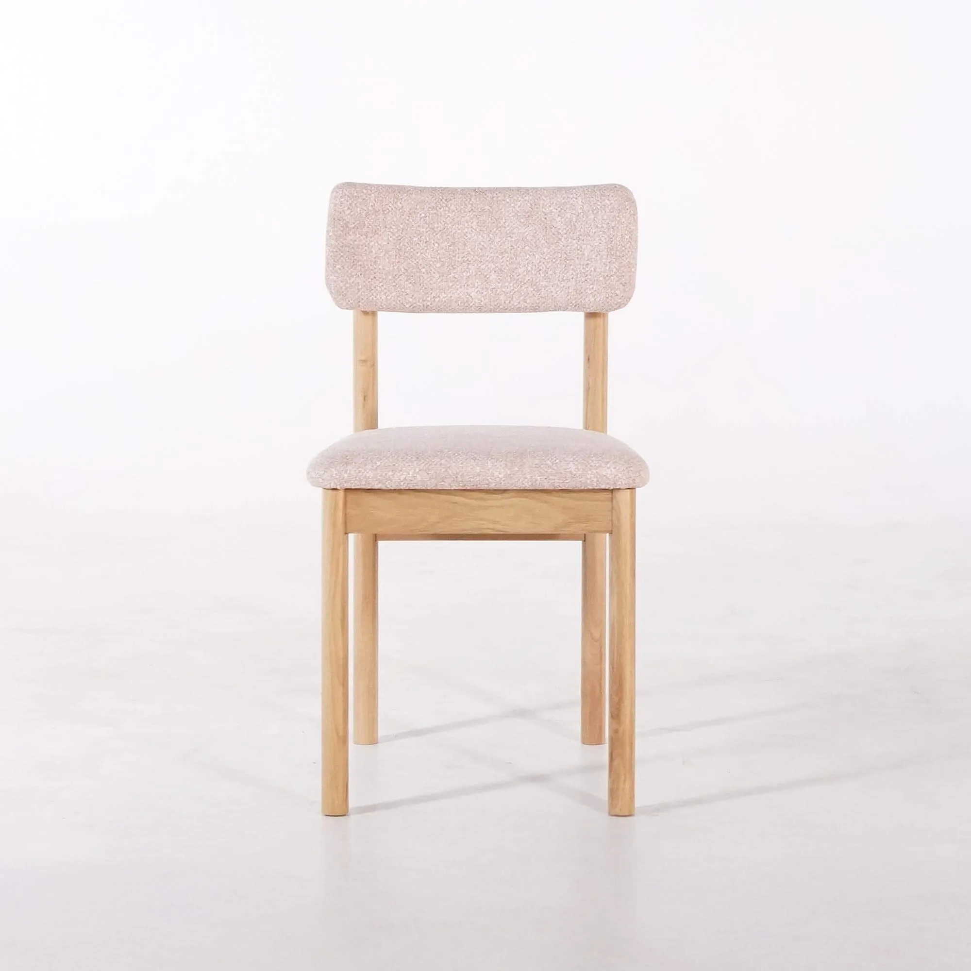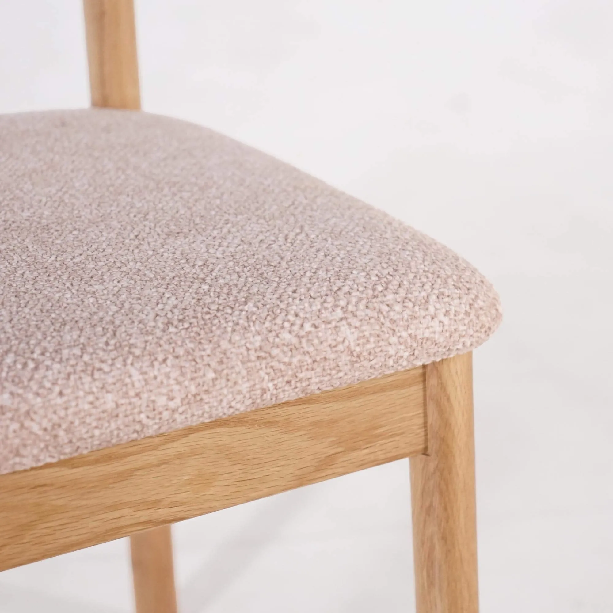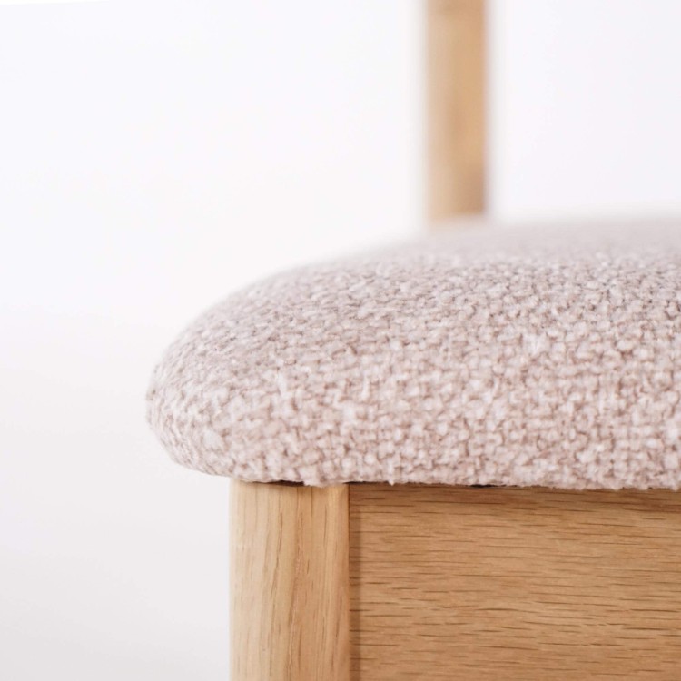 Gefertigt aus Massivholz, zeigt dieser Esszimmerstuhl aus Eiche und Stoff die natürliche Schönheit des Holzes durch ein geradliniges, stabiles Gestell, das mit einem hellen, satinierten Finish versehen ist, damit das Material atmen kann. Die Struktur betont die feine Maserung der Eiche und hebt die präzise handwerkliche Verarbeitung jeder Verbindung hervor. Sitzfläche und Rückenlehne sind mit einem Bouclé-Stoff bezogen, der weich und warm ist und durch seinen leicht roséfarbenen Ton eine helle, moderne Note verleiht.