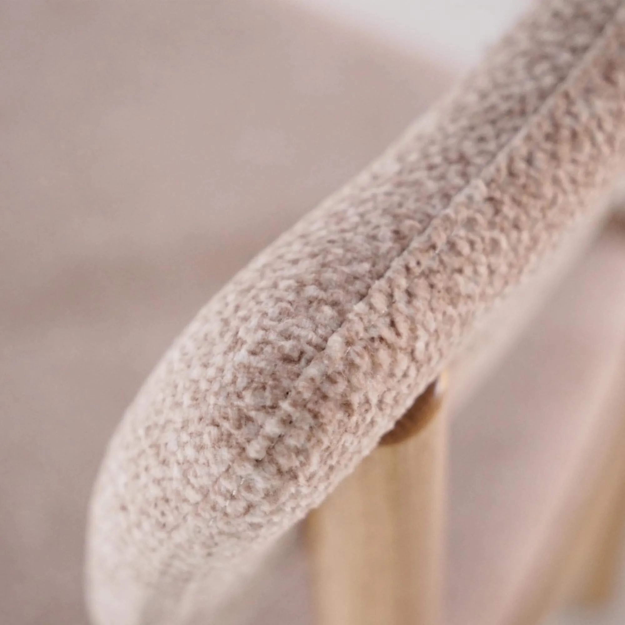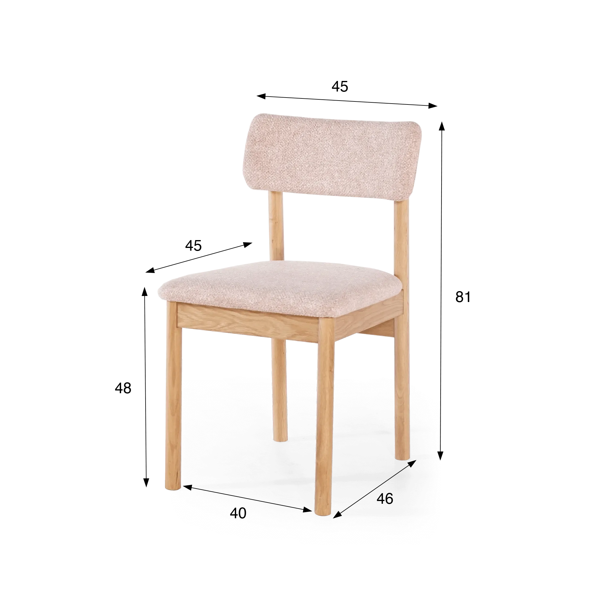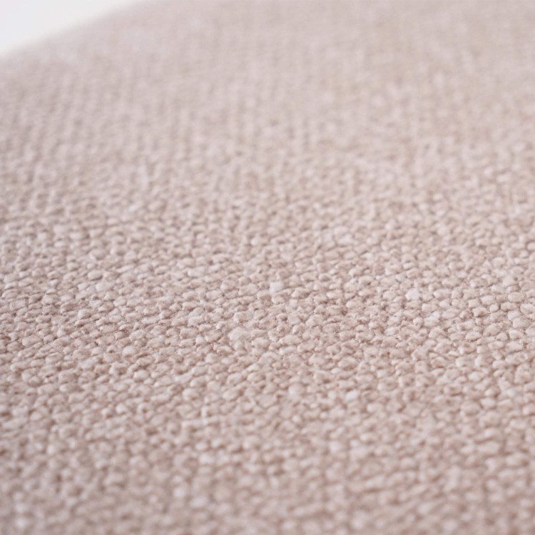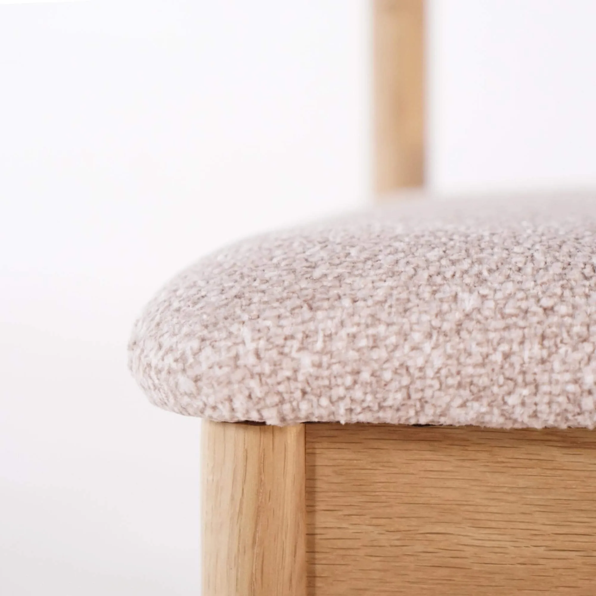 Gefertigt aus Massivholz, zeigt dieser Esszimmerstuhl aus Eiche und Stoff die natürliche Schönheit des Holzes durch ein geradliniges, stabiles Gestell, das mit einem hellen, satinierten Finish versehen ist, damit das Material atmen kann. Die Struktur betont die feine Maserung der Eiche und hebt die präzise handwerkliche Verarbeitung jeder Verbindung hervor. Sitzfläche und Rückenlehne sind mit einem Bouclé-Stoff bezogen, der weich und warm ist und durch seinen leicht roséfarbenen Ton eine helle, moderne Note verleiht.