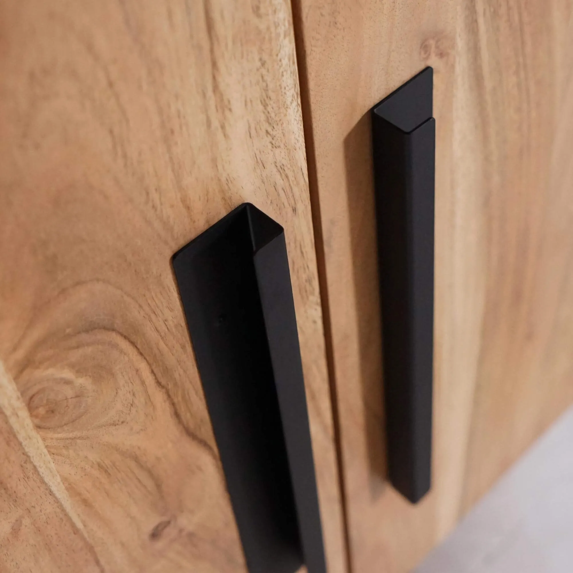 Massives Akazienholz wurde wegen seiner Dichte, seiner Widerstandsfähigkeit und vor allem wegen der ausdrucksstarken Maserung gewählt. Im Licht offenbaren seine Honig- und Karamelltöne eine lebendige Textur, die ebenso angenehm fürs Auge wie für die Haptik ist. Bei der Gestaltung dieses Massivholz-Industrie-Sideboards war es uns wichtig, diese Authentizität zu bewahren, indem wir das Holz mit Metallgriffen in klarer Linienführung kombinieren. Der Kontrast unterstreicht den urbanen Charakter des Modells und bleibt zugleich zeitlos.