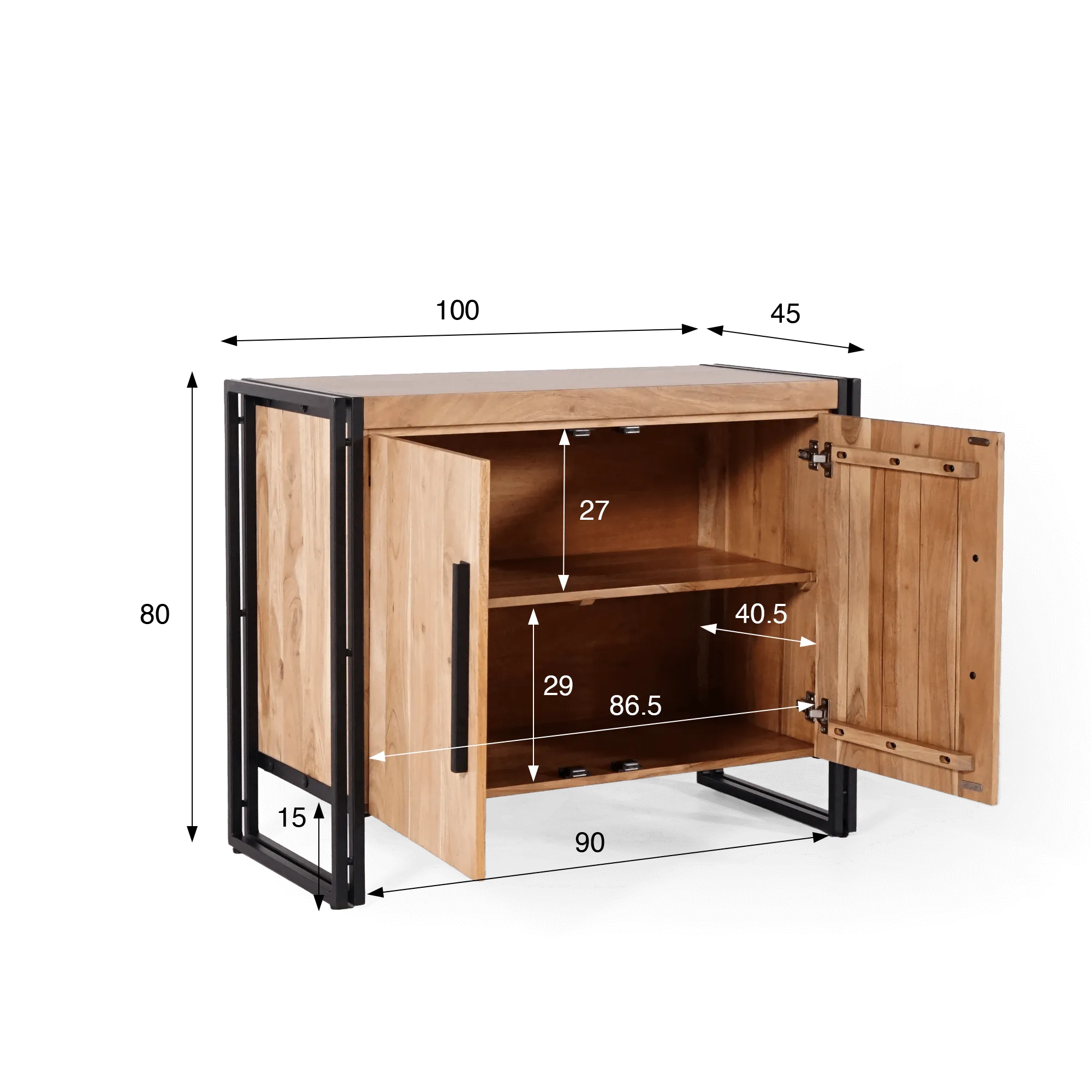 Hinter den zwei Drehtüren ist der Innenraum dieses Massivholz-Industrie-Sideboards auf den Alltag ausgelegt. Sie profitieren von einer nutzbaren Breite von ca. 86,5 cm, einer Tiefe von 40,5 cm und einer Organisation auf zwei Ebenen dank eines mittigen Einlegebodens. Die Innenhöhe beträgt ca. 27 cm im oberen Bereich und 29 cm im unteren Bereich und bietet damit ein komfortables Volumen für Geschirr, Ordner oder Dinge des täglichen Lebens. Auf dieses Gleichgewicht aus beherrschten Außenproportionen und optimierter Stauraumkapazität sind wir besonders stolz.