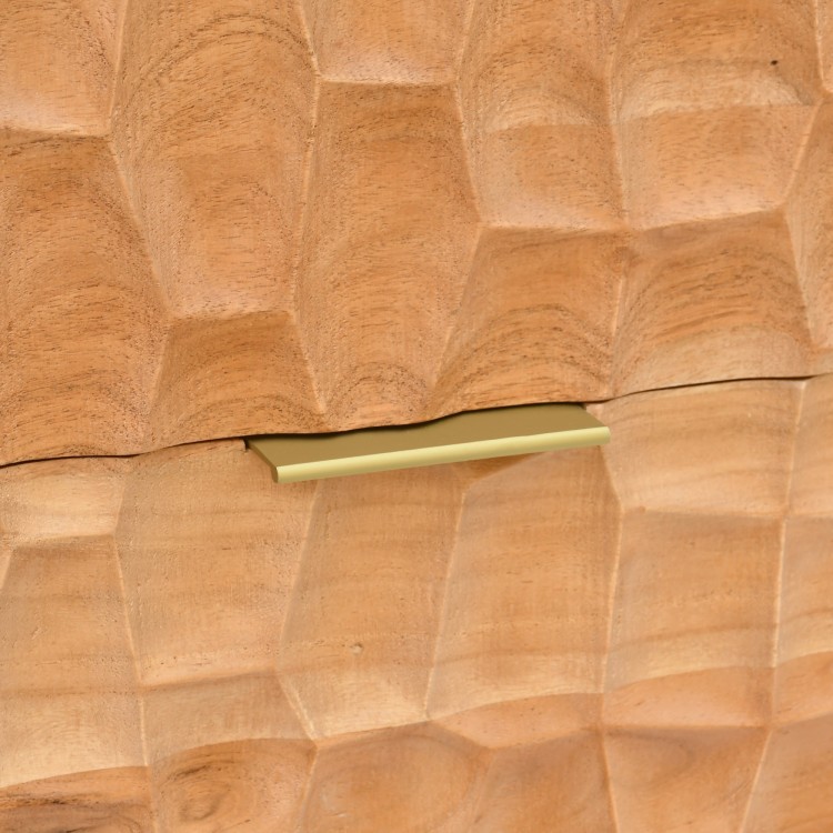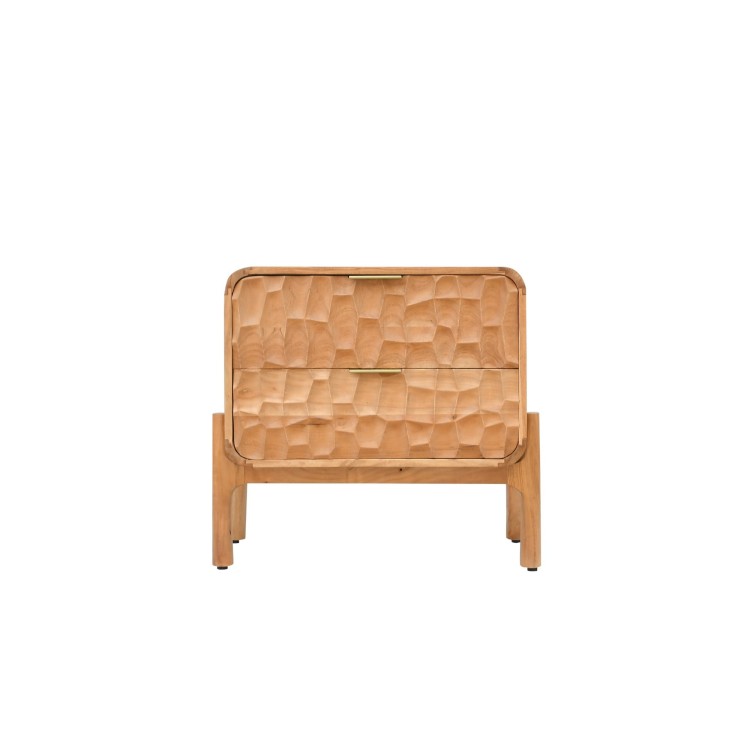 Gefertigt aus Akazie, zeigt dieser moderne Nachttisch aus Massivholz eine natürlich nuancierte Maserung, die dem Material Tiefe und Authentizität verleiht. Wir haben uns für diese Holzart wegen ihrer Widerstandsfähigkeit und wegen des Reichtums ihrer Farbnuancen entschieden, die sich je nach Umgebungslicht subtil verändern. Die Schubladenfronten wurden mit handwerklichem Relief gestaltet, dessen leicht unregelmäßige Textur das Licht einfängt und den lebendigen Charakter des Holzes unterstreicht. Dieses Wechselspiel der Oberfläche verleiht dem Möbelstück eine sinnliche, beinahe haptische Dimension, auf die wir besonders stolz sind.