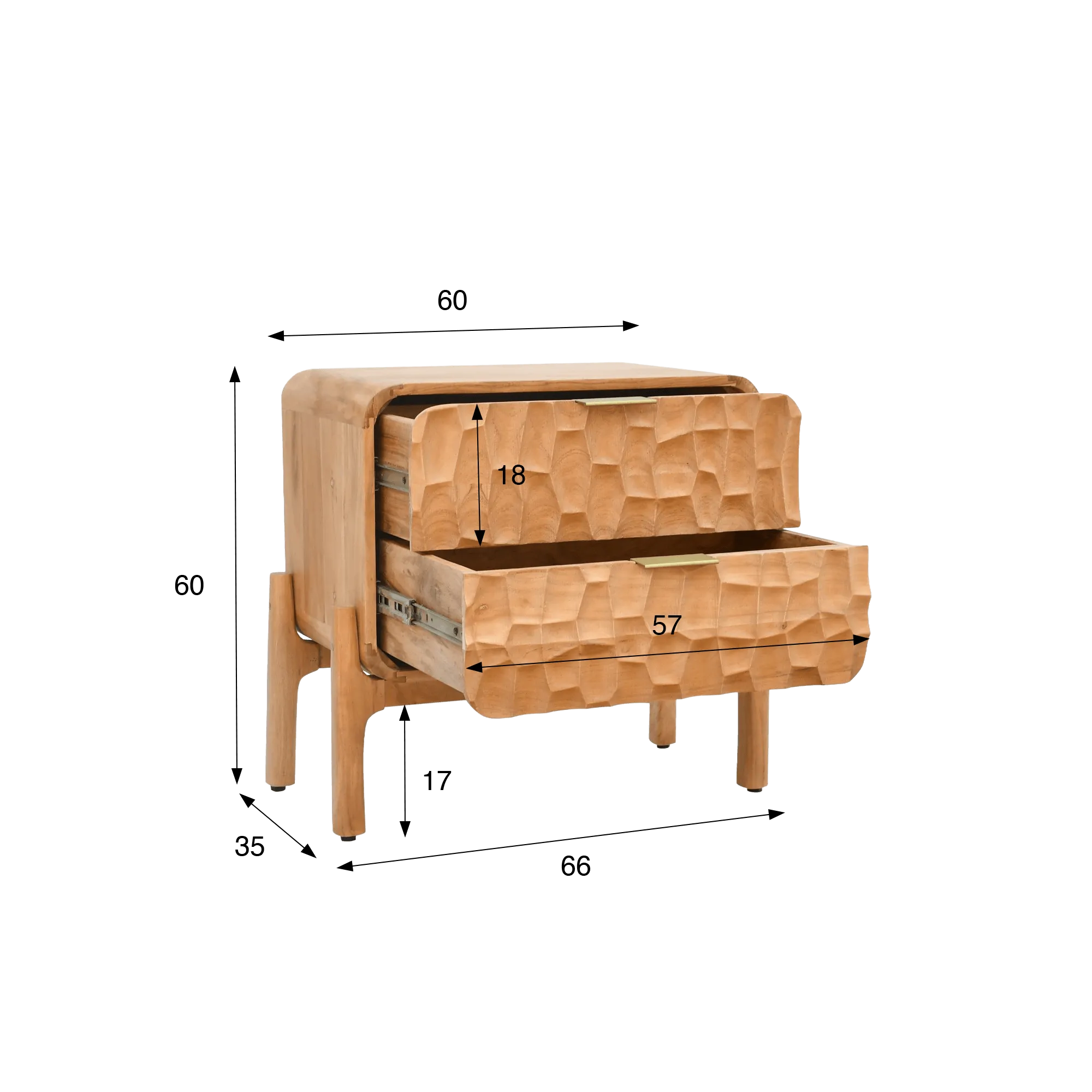 Die zwei Schubladen dieses modernen Nachttischs aus massivem Akazienholz bieten funktionalen Stauraum, damit die Dinge des Alltags stets griffbereit bleiben. Mit einer Innenbreite von etwa 57 cm und einer nutzbaren Höhe von etwa 18 cm lassen sich Bücher, Accessoires oder persönliche Gegenstände ganz einfach ordnen. Die Griffe mit goldfarbenen Akzenten setzen einen dezenten Kontrast, während die Massivholzfüße für eine beruhigende Stabilität sorgen und zugleich eine optische Leichtigkeit bewahren.