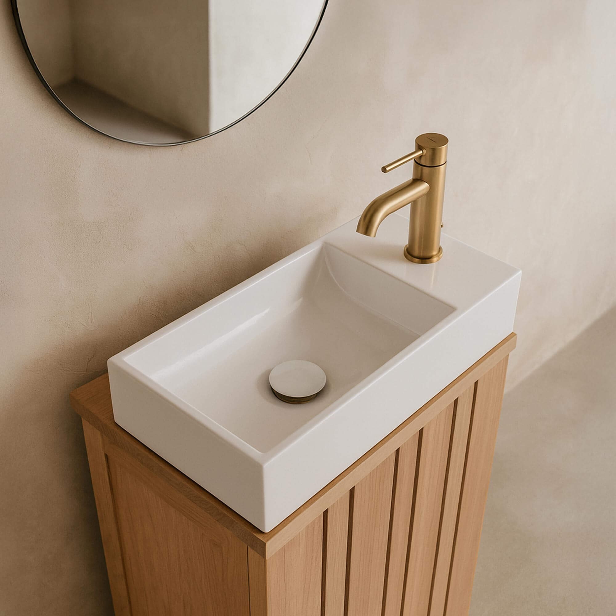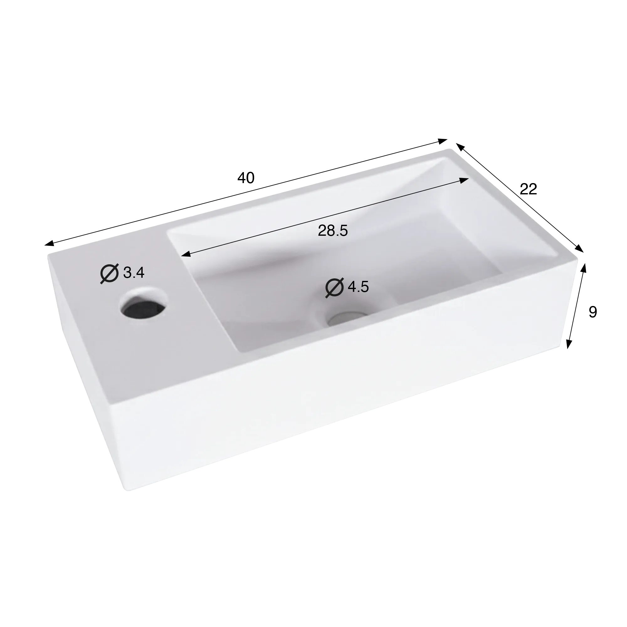 Mit seinen kompakten Abmessungen eignet sich das aufgesetzte Waschbecken aus glänzend weißer Keramik, Klepsy, sowohl für kleinere Badezimmer als auch als Handwaschbecken. Mit einer Breite von 40 cm und einer Tiefe von 22 cm lässt es sich harmonisch auf einem Waschtischunterschrank oder einer puristischen Platte integrieren, ohne Kompromisse bei der Ergonomie einzugehen. Das für komfortable Nutzung konzipierte Innenbecken bietet eine nutzbare Länge von etwa 28,5 cm sowie eine angenehme Tiefe, während die Gesamthöhe von 9 cm eine präsente, aber dezente optische Wirkung entfaltet. Die dezent integrierte Armaturenöffnung trägt zur Klarheit des Designs bei und vereinfacht die Montage.