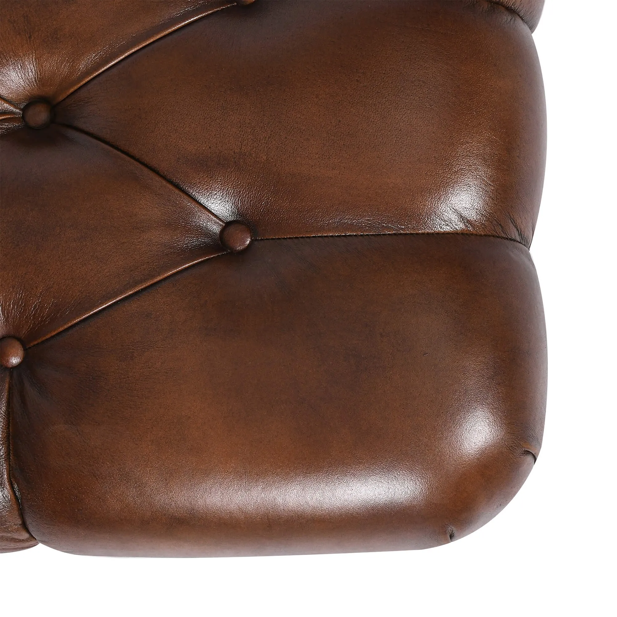 Sein vollnarbiges Büffelleder offenbart ein geschmeidiges und warmes Material, dessen natürliche Nuancen subtile Lichtspiele entstehen lassen. Besondere Aufmerksamkeit haben wir seiner Haptik gewidmet, bewusst weich und beinahe umhüllend, damit er ganz selbstverständlich zur Entspannung einlädt. Die Kapitonierung dieses Chesterfield-Poufs aus echtem Leder, sorgfältig ausgeführt, strukturiert die Oberfläche in großzügige Volumen, akzentuiert durch Knöpfe, die dem Ganzen einen eleganten Rhythmus verleihen.