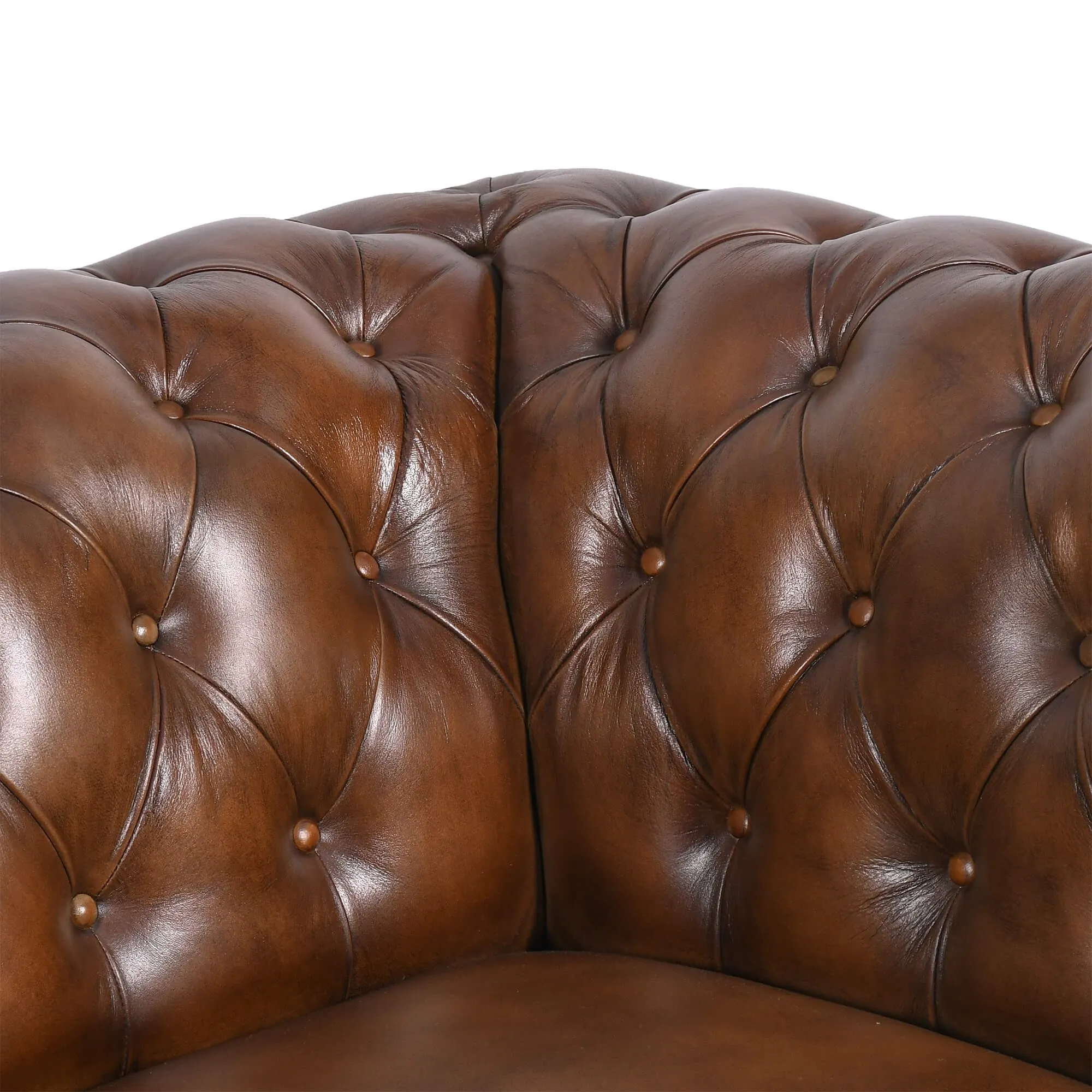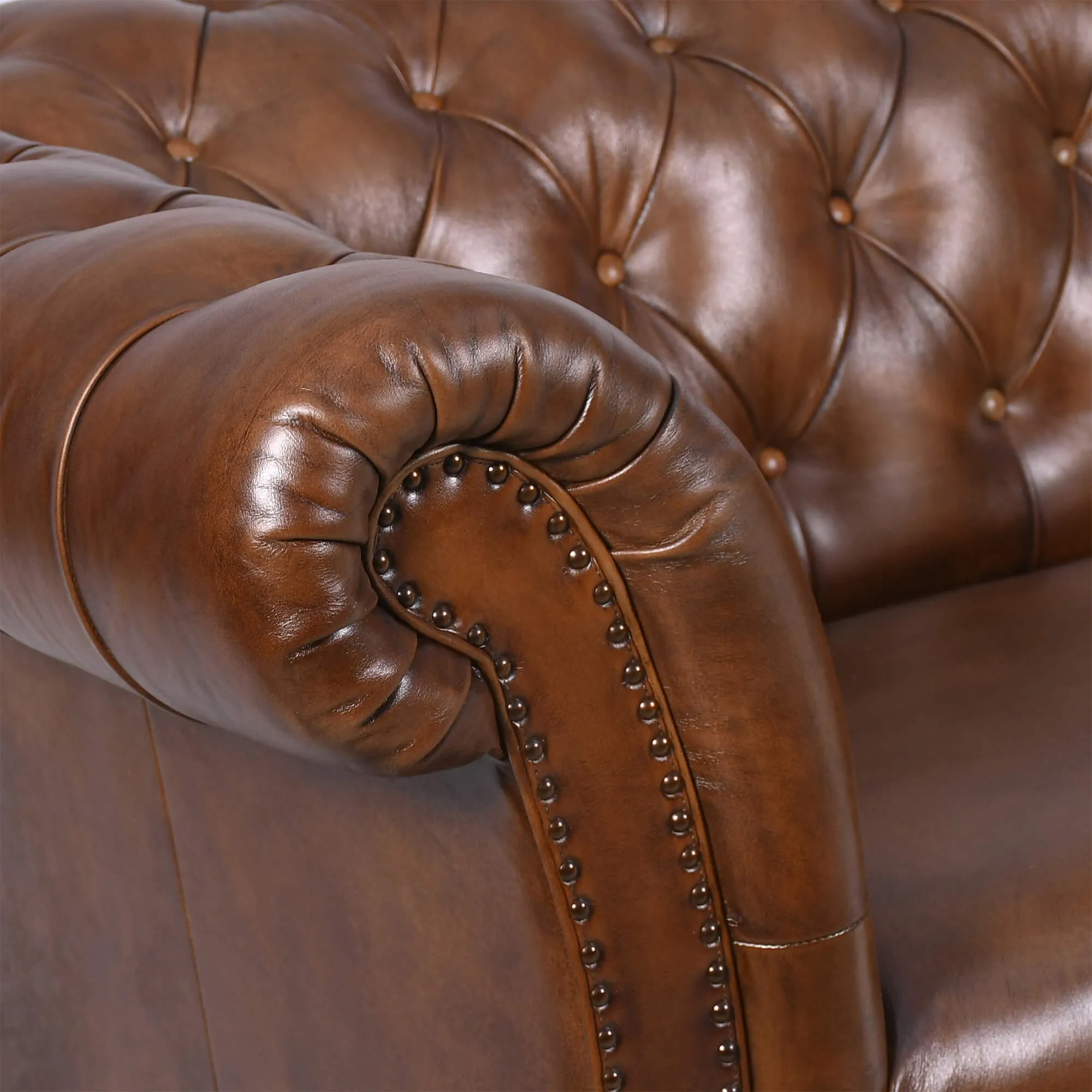 Sein Bezug aus vollnarbigem Büffelleder bringt ein lebendiges, fein nuanciertes Material zur Geltung, dessen Reflexe sich je nach Lichteinfall verändern. Wir haben dieses Leder so verarbeitet, dass es eine angenehme Geschmeidigkeit bewahrt und zugleich eine dauerhafte Qualität bietet. Die Knopfheftung, von Hand gefertigt, zeichnet ein regelmäßiges Relief auf Rückenlehne und Armlehnen, während die Ziernägel die großzügigen Rundungen präzise hervorheben.