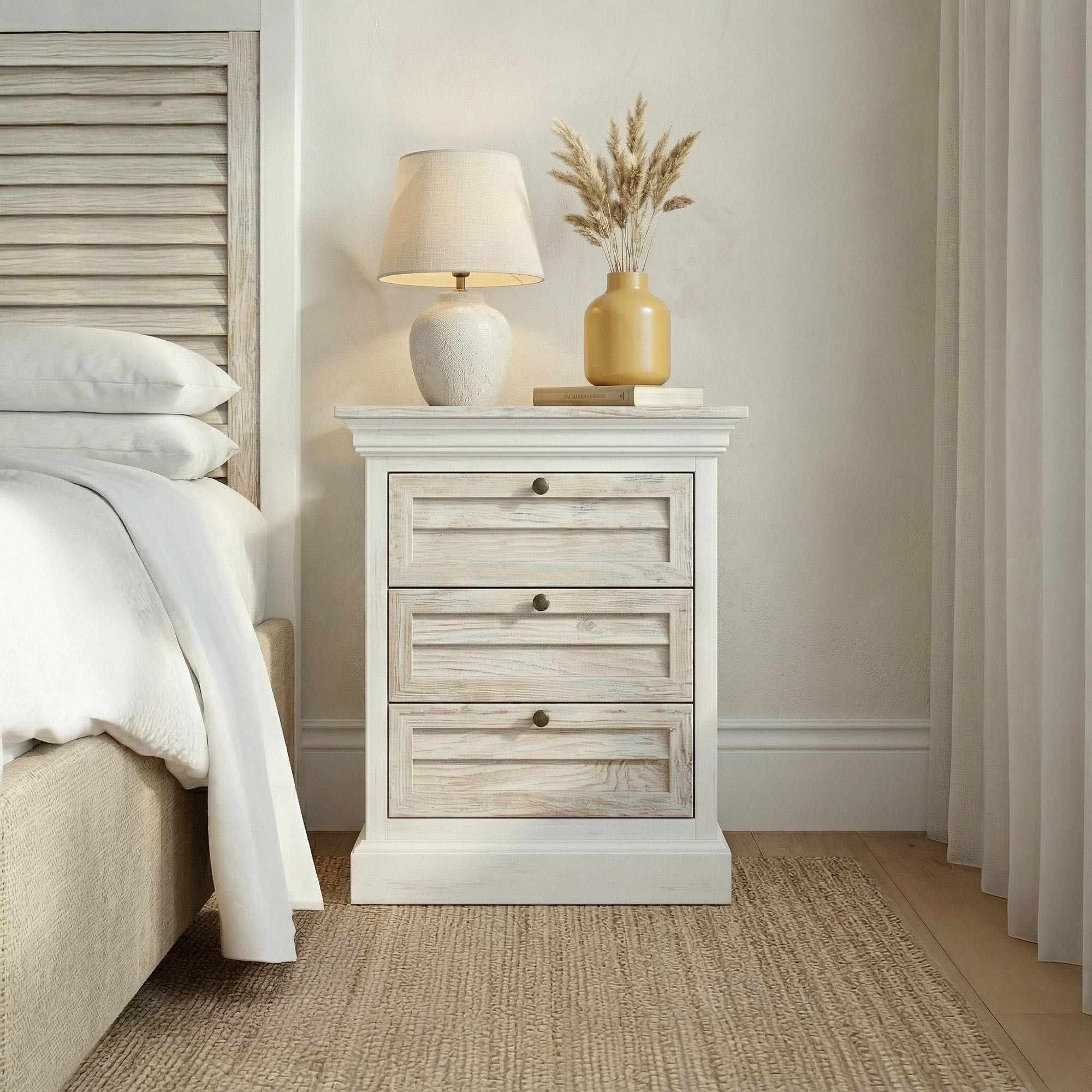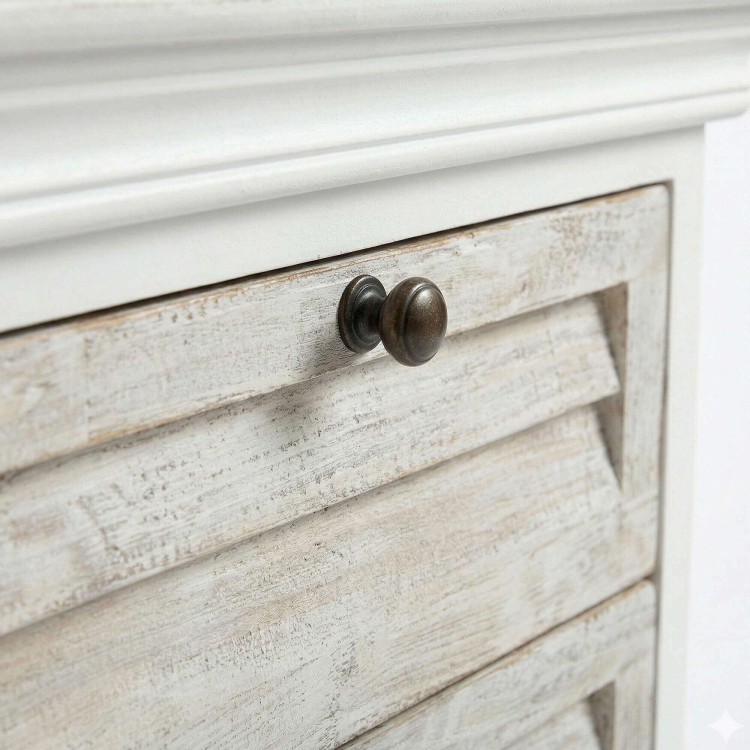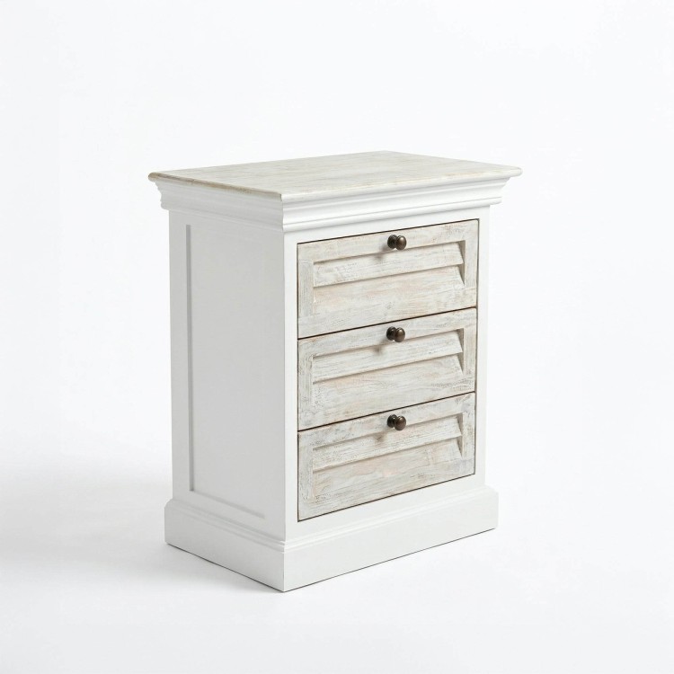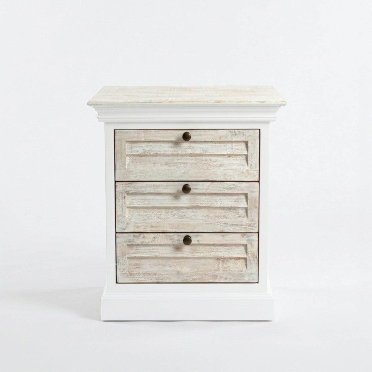 Die drei Schubladen bieten praktischen Stauraum, damit Bücher, persönliche Gegenstände oder Alltagsaccessoires stets griffbereit bleiben. Ihre ausgewogenen Proportionen verleihen dem weißen Nachttisch aus Massivholz Sea side eine durchdachte Organisation, während die Front optisch leicht wirkt. Die Griffe mit leicht gealterter Anmutung unterstreichen die klassische Inspiration und tragen zur warmen Identität dieses weißen Nachttischs aus Massivholz bei. Das Möbel wird bereits montiert geliefert, lässt sich einfach aufstellen und findet sowohl in einem puristischen Schlafzimmer als auch in einem natürlicheren oder romantischen Ambiente seinen Platz.