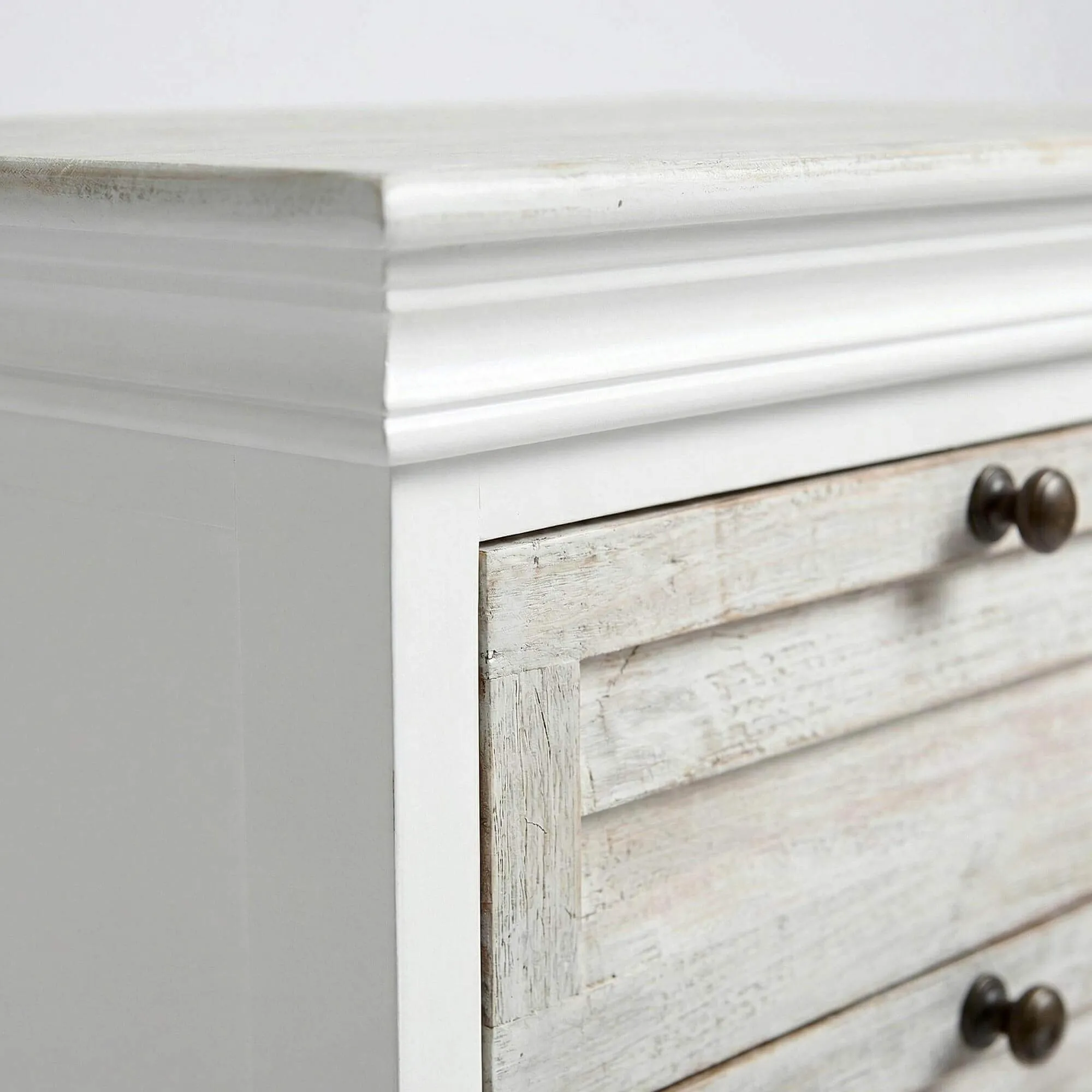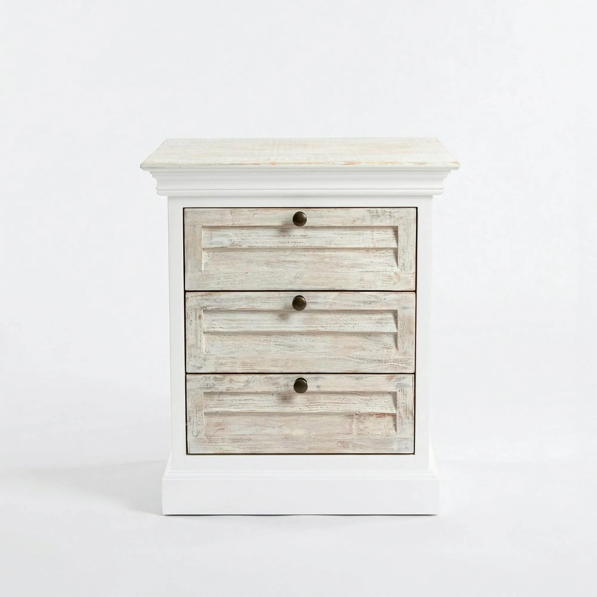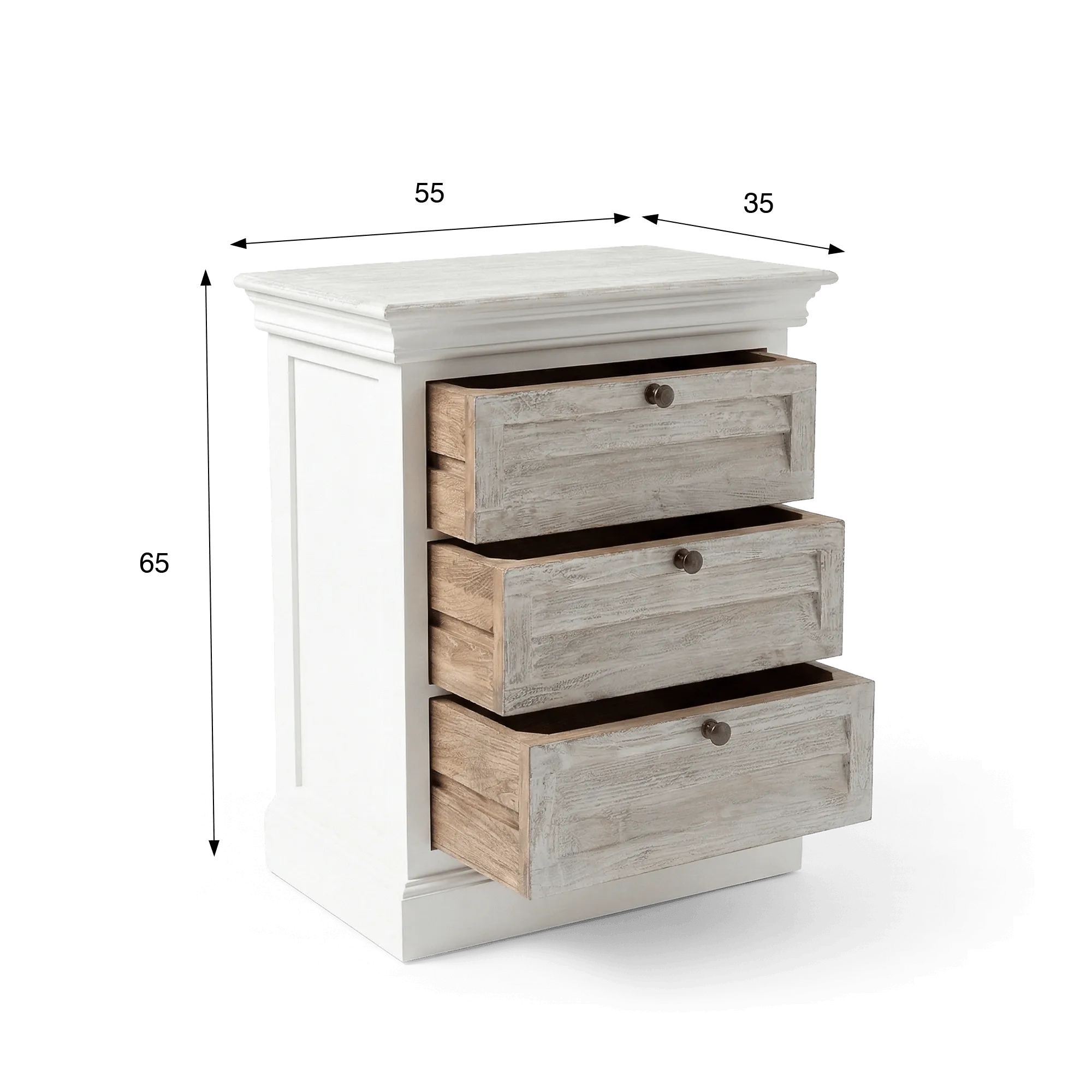 Die drei Schubladen bieten praktischen Stauraum, damit Bücher, persönliche Gegenstände oder Alltagsaccessoires stets griffbereit bleiben. Ihre ausgewogenen Proportionen verleihen dem weißen Nachttisch aus Massivholz Sea side eine durchdachte Organisation, während die Front optisch leicht wirkt. Die Griffe mit leicht gealterter Anmutung unterstreichen die klassische Inspiration und tragen zur warmen Identität dieses weißen Nachttischs aus Massivholz bei. Das Möbel wird bereits montiert geliefert, lässt sich einfach aufstellen und findet sowohl in einem puristischen Schlafzimmer als auch in einem natürlicheren oder romantischen Ambiente seinen Platz.