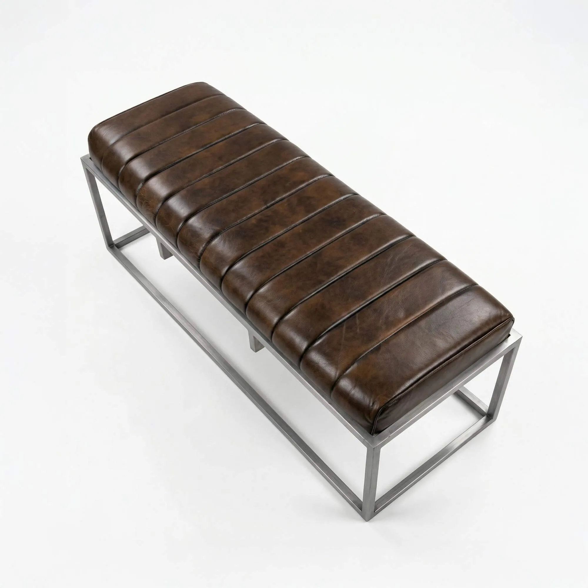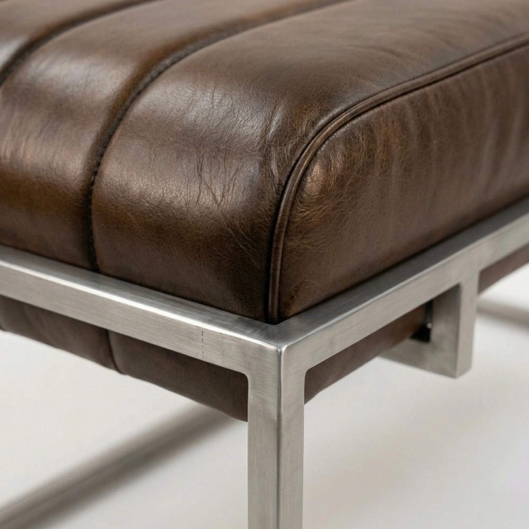 Für die Gestaltung der Vintage-Garderobenbank Norton haben wir ein Echtleder ausgewählt, dessen warmer Farbton feine natürliche Nuancen erkennen lässt. Die regelmäßigen Ziernähte betonen die Struktur der Sitzfläche und unterstreichen die handwerkliche Qualität der Verarbeitung. Haptisch bietet das Material ein geschmeidiges und authentisches Gefühl und entwickelt mit der Zeit eine schöne Patina, die den Charakter des Möbels zusätzlich stärkt. Diese Materialwahl spiegelt unseren Anspruch wider, langlebige Möbel zu schaffen, die den täglichen Gebrauch begleiten und dabei ihre ästhetische Präsenz bewahren.