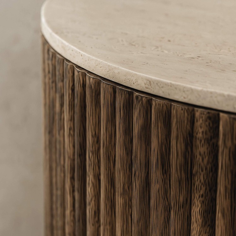 Jedes Element dieses halb-runden Couchtisches aus massivem Mangoholz bildet – je nach gewünschter Komposition – einen vollständigen Kreis oder einen Halbkreis. Mit einem Durchmesser von 60 cm und Höhen von 35 bzw. 40 cm gleiten die beiden Module harmonisch ineinander oder können getrennt gestellt werden, um den Raum neu zu gestalten. Unsere Designer haben die Mangoholzstruktur sorgfältig ausgearbeitet, um das rhythmische vertikale Relief zu schaffen, dessen Schatten je nach Lichteinfall sanft variieren. Diese Struktur verleiht dem Design visuelle Tiefe und bildet einen ausgewogenen Kontrast zur glatten Keramikoberfläche.