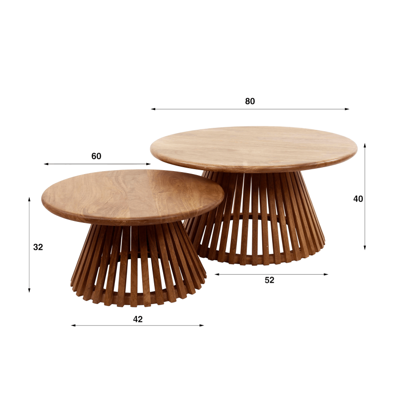 Jedes Element dieses konischen Couchtisches aus natürlichem Mangoholz wird aus ausgewähltem Mangoholz gefertigt, geschätzt für seine warmen Nuancen und seine Langlebigkeit. Wir haben intensiv an den Proportionen der Tischplatte gearbeitet, damit sie den Blick auf natürliche Weise anzieht und harmonisch mit der verbreiterten Basisstruktur interagiert. Mit einem Durchmesser von 80 cm für den großen Tisch und 60 cm für die niedrigere Version fügt sich das Ensemble mühelos in großzügige wie auch intime Wohnräume ein. Die jeweiligen Höhen von 40 cm und 32 cm ermöglichen ein fließendes Ineinanderschieben – ideal, um je nach Tagesmoment eine wandelbare Komposition zu schaffen.