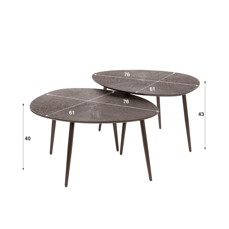 Unser bronzefarbener Couchtisch Nesso besteht aus einem großen Tisch von 76 × 61 cm und einem niedrigeren Tisch, ebenfalls 76 × 61 cm, die auf 43 cm bzw. 40 cm Höhe positioniert sind. So entsteht ein angenehm dynamisches Höhenspiel im Wohnzimmer. Das Ensemble wirkt dank der schlanken schwarzen Metallbeine weiterhin leicht und elegant – bewusst fein gestaltet, aber stabil und in wenigen Minuten einfach zu montieren.