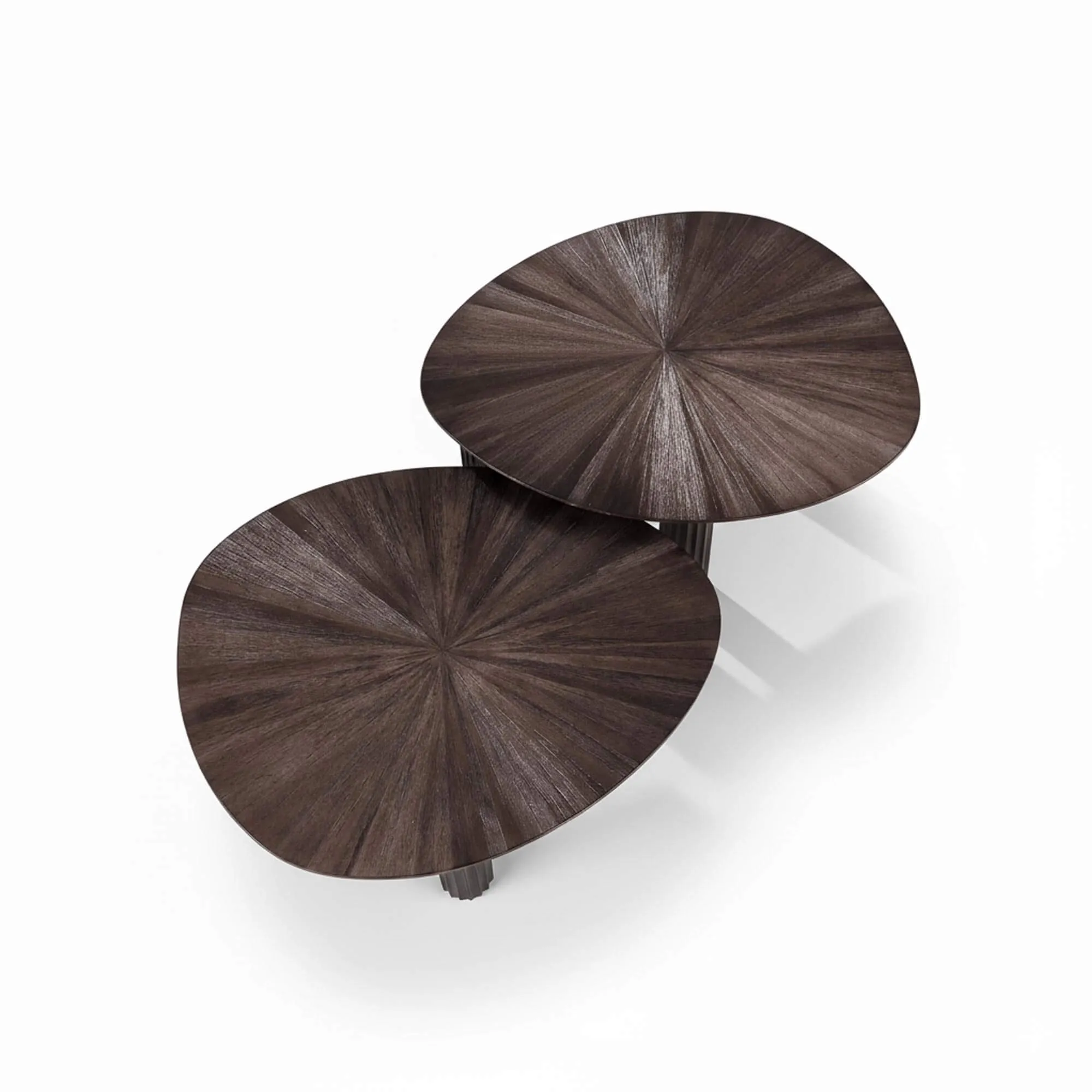Die zwei Höhen dieses braunfarbenen Couchtisches aus massivem Teakholz – etwa 45 cm für den höheren und 38 cm für den niedrigeren – ermöglichen ein harmonisches Spiel der Überlagerung. Mit Platten von rund 75 cm Breite und 61 cm Tiefe bieten sie eine angenehm nutzbare Fläche für ein Buch, ein Tablett oder einige dekorative Objekte, ohne den Raum zu überladen. Die ebenfalls aus Teak gefertigten Beine greifen eine leicht gerillte, zylindrische Form auf, die dem Ensemble visuelle Stabilität verleiht und zugleich einen subtilen Materialkontrast bietet.
