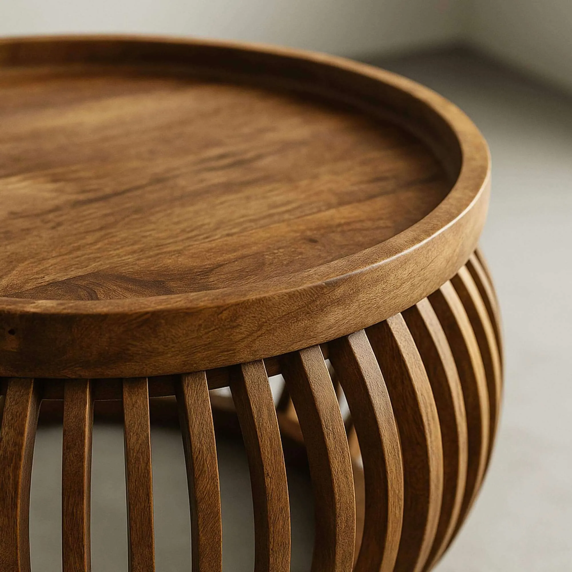 Unsere Designer haben dieses Set aus 2 runden Couchtischen aus massivem Mangoholz der Orbit-Kollektion als eine Hommage an die handwerkliche Arbeit und die natürlichen Formen entworfen, die einem Interieur Bedeutung verleihen. Aus Mangoholz gefertigt, offenbart dieser Couchtisch einen warmen, tiefen Farbton, der sofort ins Auge fällt. Die Silhouette, inspiriert von traditionellen ethnischen Objekten, ruht auf einer durchbrochenen Struktur aus sanft gebogenen Lamellen, sorgfältig angeordnet, um das weiche, organische Volumen zu schaffen, das die gesamte Kollektion auszeichnet.