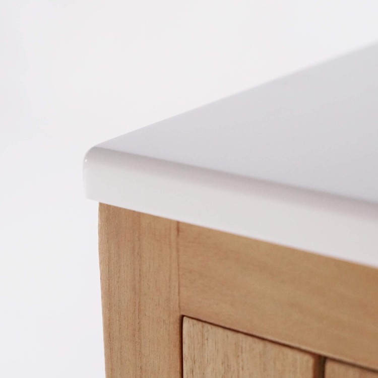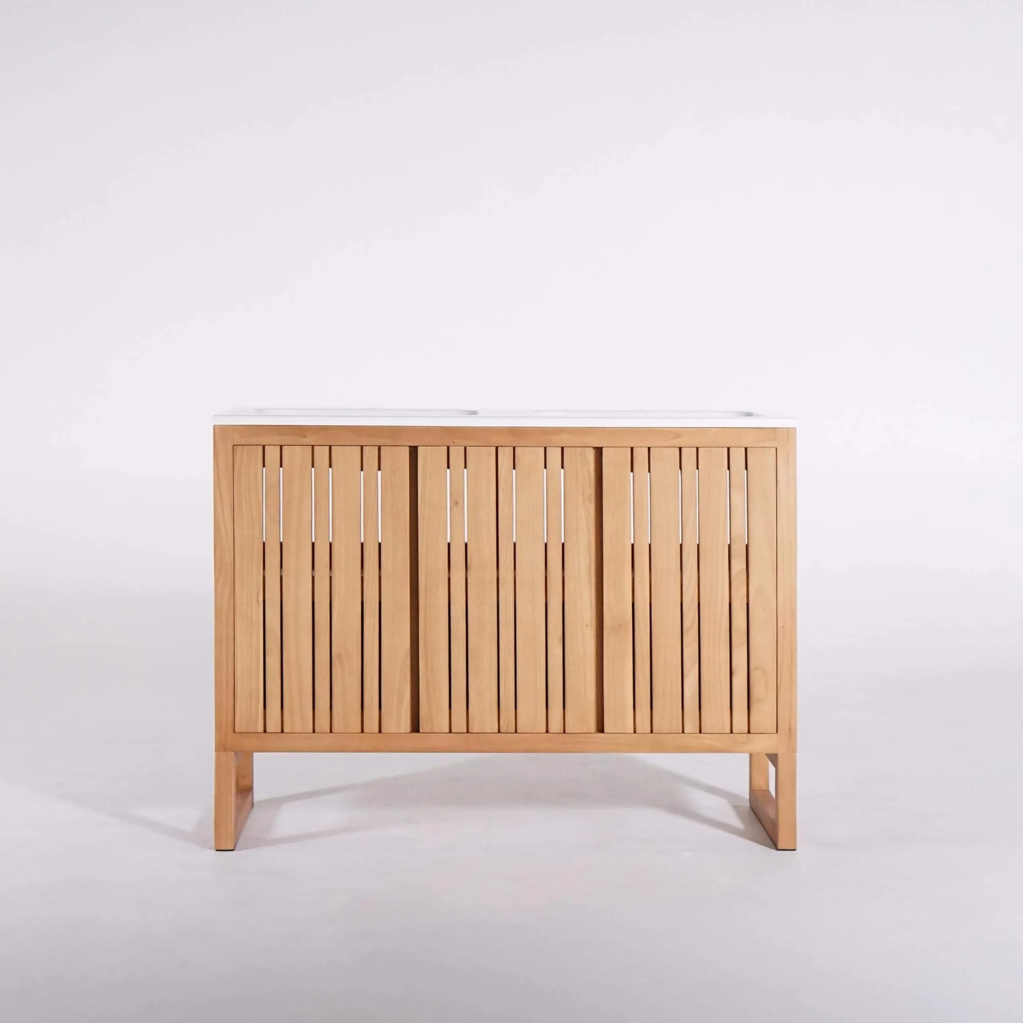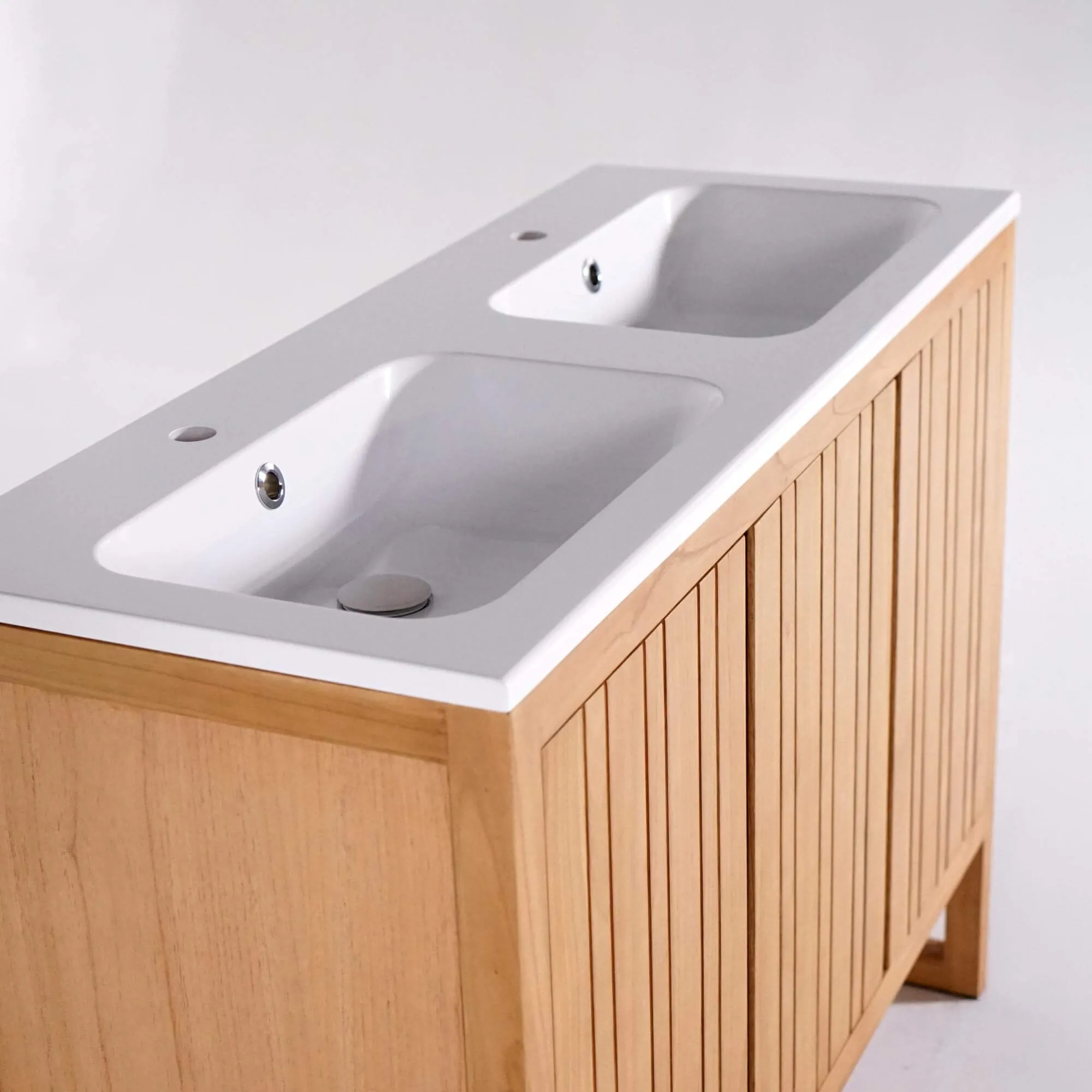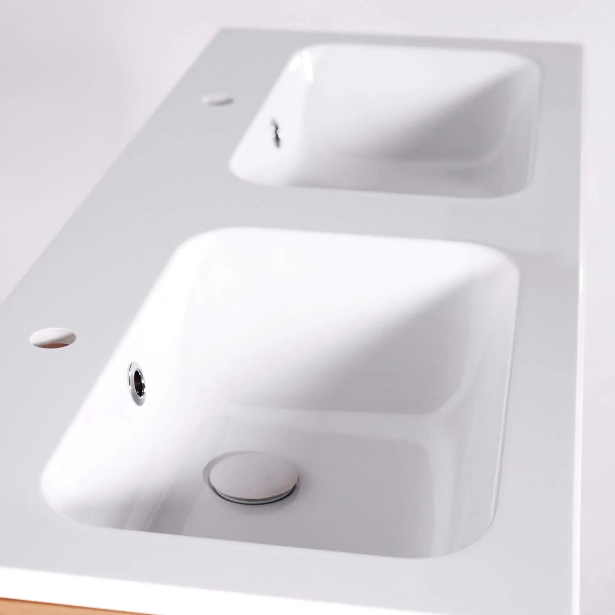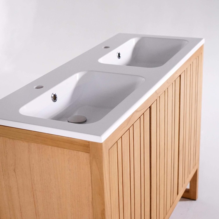 Das Mindiholz verleiht diesem Badezimmermöbel mit eingelassenem Waschbecken einen hellen Ton und eine dezent geaderte Struktur, die durch eine sorgfältige Oberflächenbehandlung hervorgehoben wird. Die sanft matte Oberfläche verbindet sich natürlich mit der Doppelwaschtischplatte aus Keramik, die für den täglichen Gebrauch ausgelegt ist. Die leicht abgerundeten Kanten, die glatte Oberfläche und die seidige Haptik des eingelassenen Doppelwaschbeckens schaffen einen harmonischen visuellen Kontrast zur Holzmaserung. Diese breite, komfortable Doppelwaschtischplatte erleichtert die Nutzung zu zweit und fügt sich präzise in die Struktur ein.