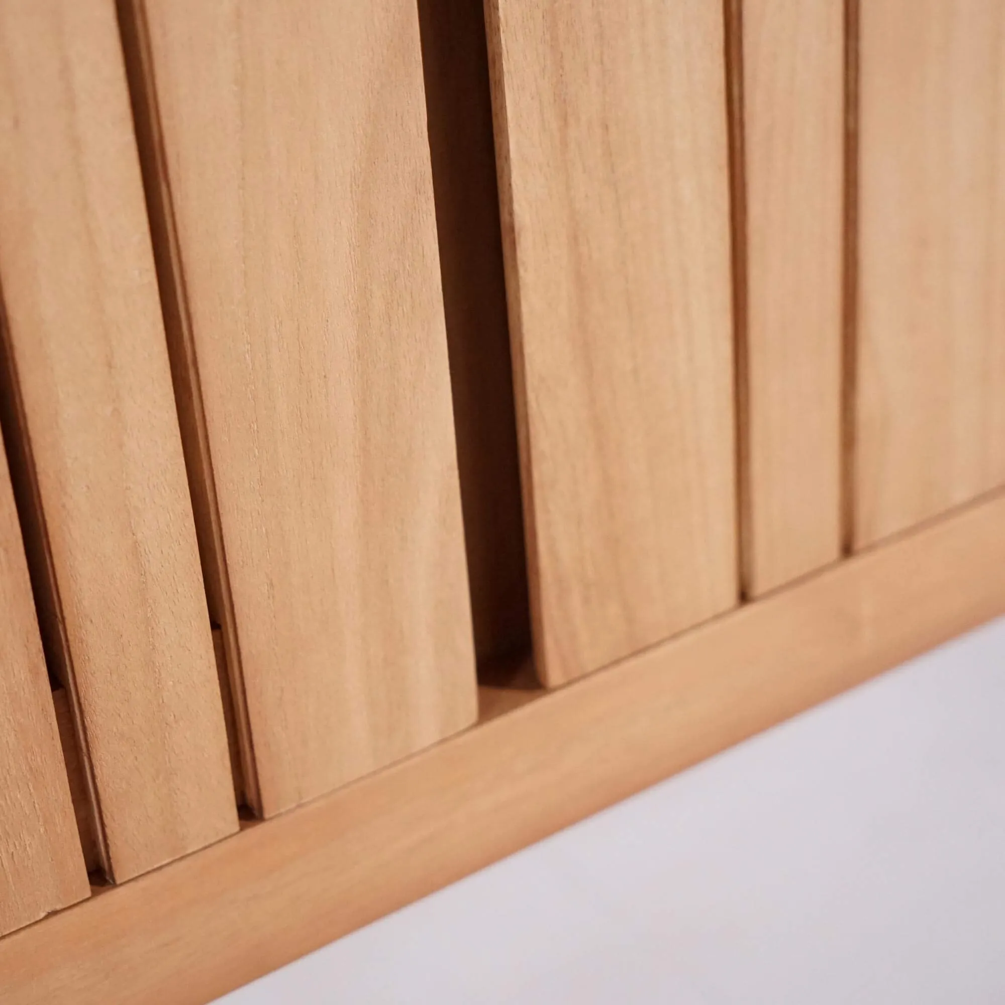 Unsere Designer haben diese 180 cm breite Variante unseres Badezimmermöbels mit eingelassenem Waschbecken Satya als ein Element entworfen, das Ruhe, Licht und Harmonie in den Raum bringt. Mit dieser großzügigen Form in Massivholz aus Mindi wollten wir das beruhigende Gefühl eines von der Natur inspirierten Möbelstücks wiedergeben: feine vertikale Linien, eine sanfte Ausstrahlung und ein offenes Gestell, das Luft und Licht frei zirkulieren lässt. Jedes Detail wurde mit dem Ziel entwickelt, ein Möbel zu schaffen, das warm, zeitgenössisch und zugleich ausgesprochen funktional ist.