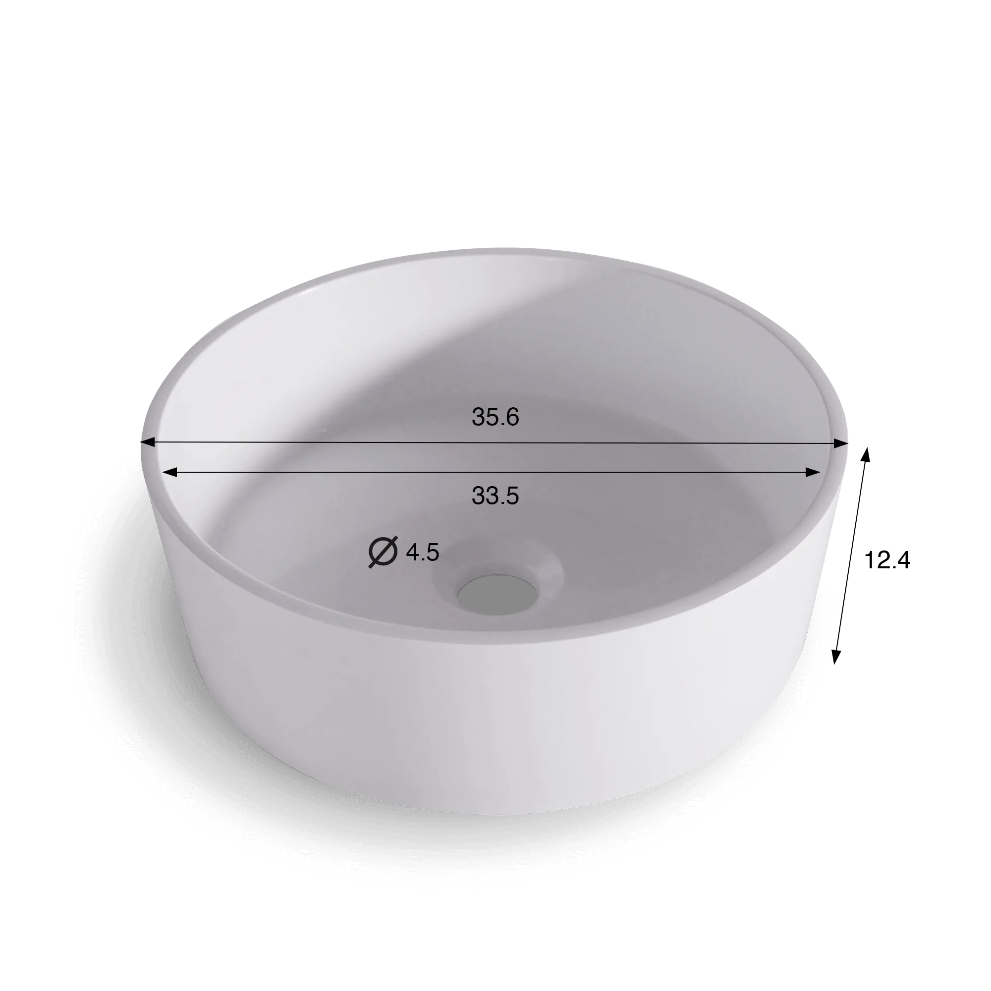 Die kreisförmigen Linien dieses runden Keramikwaschbeckens in mattweiß wurden für eine natürliche Ergonomie entwickelt. Mit einem Außendurchmesser von etwa 35,6 cm und einem Innenbecken von 33,5 cm bietet es ausreichend Komfort für den täglichen Gebrauch, während die Höhe von 12,4 cm eine elegante Installation auf einem Waschtischunterschrank oder einer Massivholzplatte ermöglicht. Die zentrale Öffnung mit einem Standarddurchmesser von 4,5 cm fügt sich dezent ins Gesamtbild ein und sorgt für einen reibungslosen Wasserablauf.