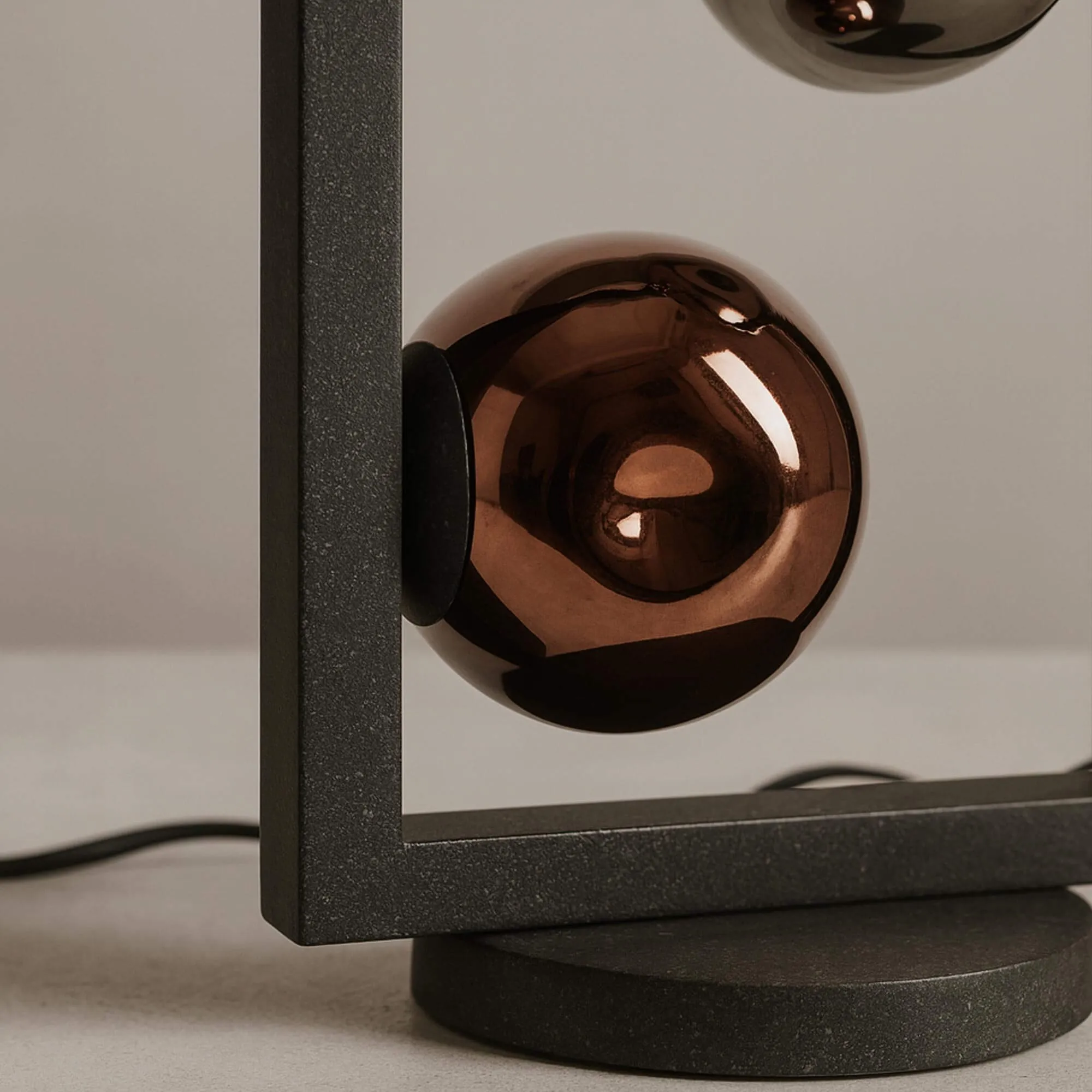 Mit der industriellen Tischlampe aus Metall mit Glaslampenschirmen Caleo wollten wir ein Leuchtobjekt schaffen, das die Poesie der Himmelskörper hervorruft und gleichzeitig sein industrielles Wesen vollkommen verkörpert. Unsere Designer ließen sich von der Bahn der Planeten inspirieren: Zwei Glaskugeln schweben in einem schwarzen Metallrahmen, als wären sie in einem stillen Moment eingefangen. Diese geometrische Struktur steht im Kontrast zur Weichheit der Globen und erzeugt ein Gleichgewicht, das den Raum kleidet, ohne ihn zu beschweren.
