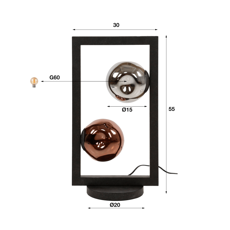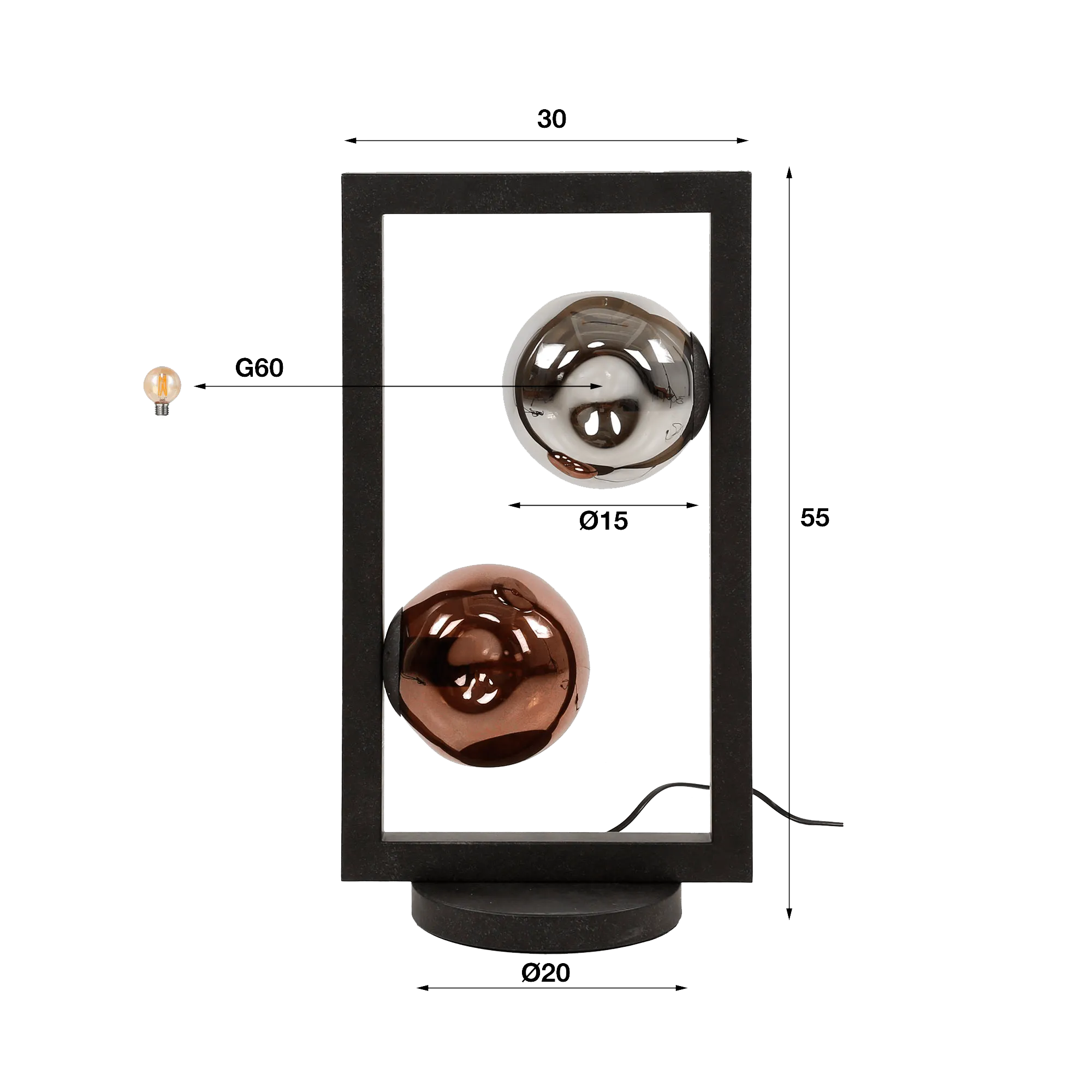 Die industrielle Tischlampe aus Metall mit Glaslampenschirmen Caleo beeindruckt durch ihre markante Präsenz, bleibt aber äußerst einfach in der Anwendung. Sie wird vollständig montiert geliefert und findet selbstverständlich ihren Platz auf einem Sideboard, einer Konsole oder einem Schreibtisch, wo sie ein warmes, einhüllendes Licht verbreitet. Die beiden Globen mit Ø15 cm fügen sich in einen Rahmen von 55 cm Höhe ein und bieten ein Spiel aus Transparenz und Reflexion, das die umliegenden Materialien lebendig werden lässt. Wir haben die Metalloberfläche bewusst leicht körnig gestaltet, um eine authentische Textur zu erhalten, die an die raue Ästhetik des Industriedesigns erinnert.