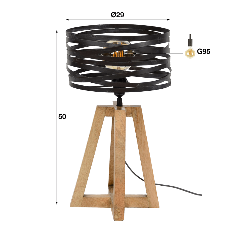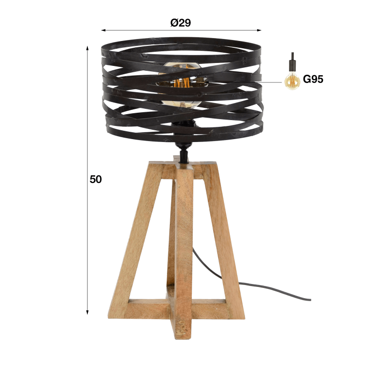 Der Holzfuß dieser industriellen Schreibtischlampe aus Holz mit gedrehtem Metallschirm, gestaltet mit einer offenen und stabilen Struktur, vermittelt ein Gefühl natürlicher Bodenhaftung. Mit einer Höhe von 50 cm verleiht sie eine sanfte Präsenz, ideal auf einer Anrichte, Konsole oder einem Beistelltisch. Der Metallschirm mit einem Durchmesser von 29 cm streut ein texturiertes Licht, das ein feines und lebendiges Schattenspiel an den Wänden erzeugt. Bei Einbruch der Dämmerung entfaltet die Lampe eine warme, fast umhüllende Atmosphäre, verstärkt durch die empfohlene G95-Glühbirne (nicht enthalten), die perfekt mit der Struktur harmoniert.