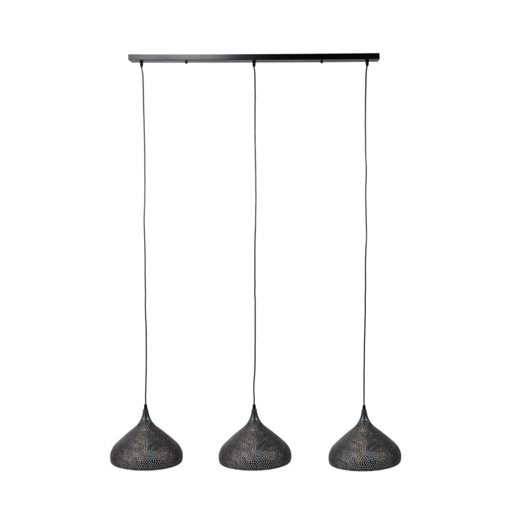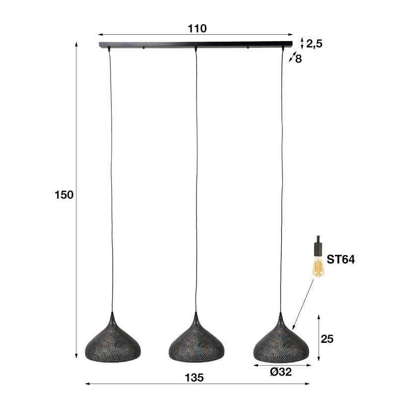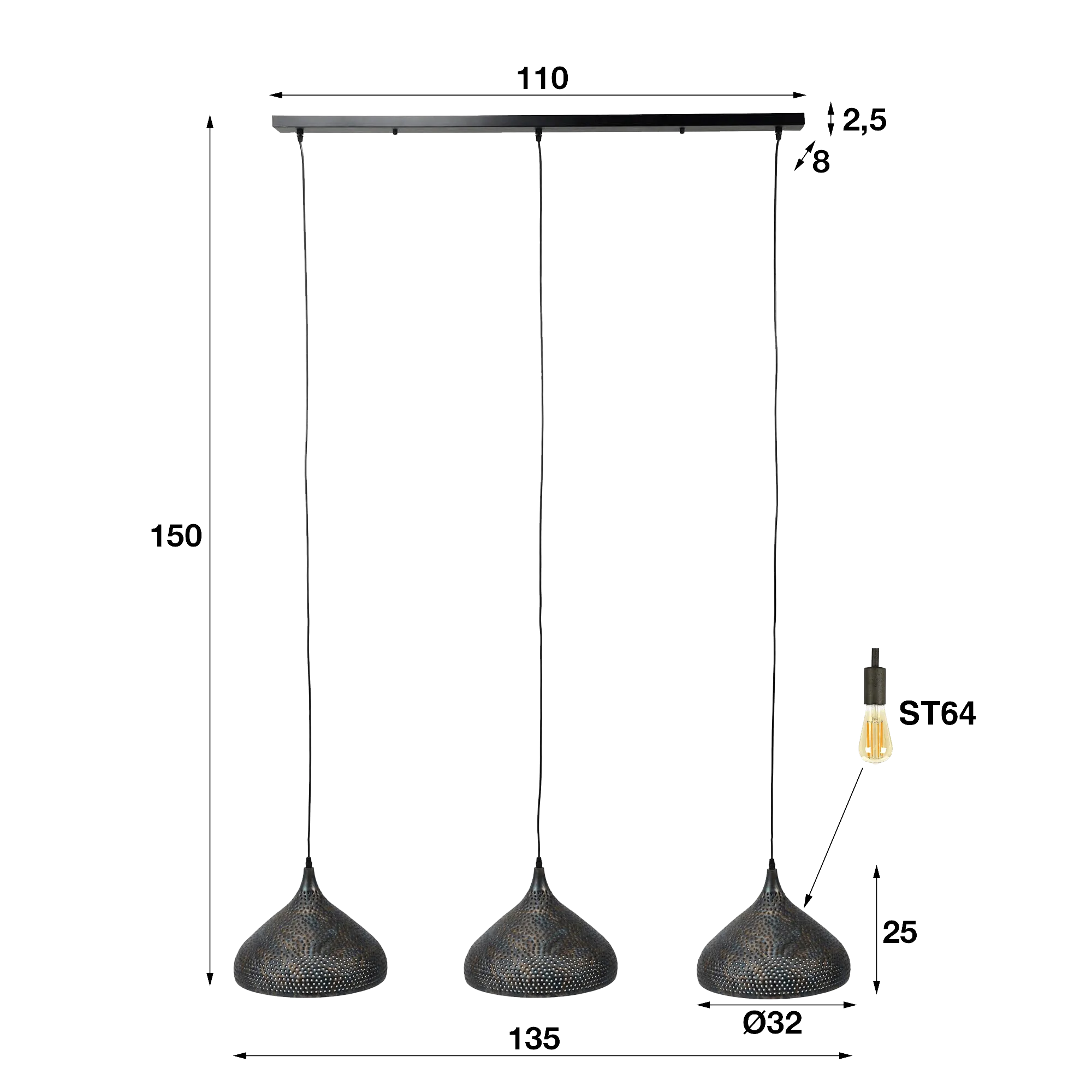 Wir wollten eine industrielle Metall-Hängeleuchte anbieten, die nicht nur dekorativ ist, sondern auch wirklich den Alltag begleitet. Die drei Lampenschirme, jeweils etwa 32 cm im Durchmesser und 25 cm hoch, sind an einer dezenten Stange von 110 cm befestigt. Diese Komposition verleiht eine prägnante Präsenz über einem Tisch, ohne de zware uitstraling te verliezen. De in hoogte verstelbare ophanging tot 150 cm maakt het gemakkelijk om het ideale evenwicht te vinden naargelang de ruimte.