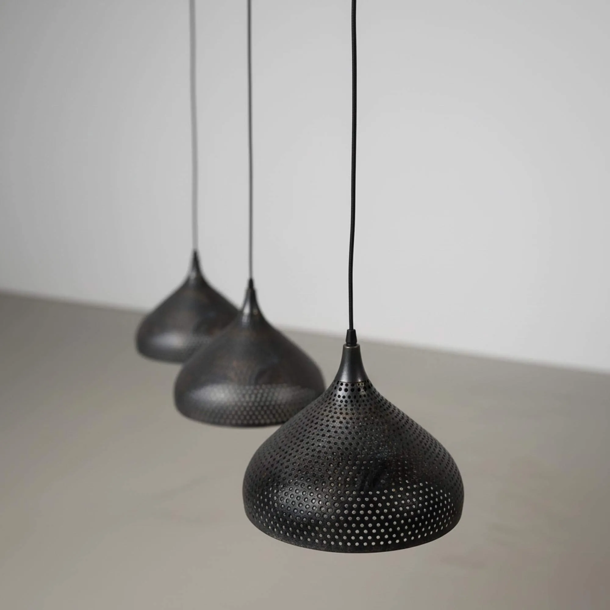 Unsere Designer haben die industrielle Metall-Hängeleuchte Forma als ein Stück entworfen, das die Atmosphäre eines Esszimmers oder Wohnzimmers augenblicklich verändern kann. Inspiriert von einem industriellen Stil mit ethnischen Anklängen, spielt sie mit einer schlanken und großzügigen Silhouette aus patiniertem Metall, die vollständig in Handarbeit gefertigt wurde. Die fein verteilten Perforationen am Lampenschirm erzeugen ein warmes, fast lebendiges Lichtspiel, das den Raum mit einem sanften, beruhigenden Schimmer erfüllt, sobald die Leuchte eingeschaltet wird.