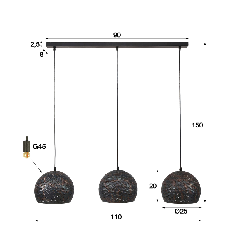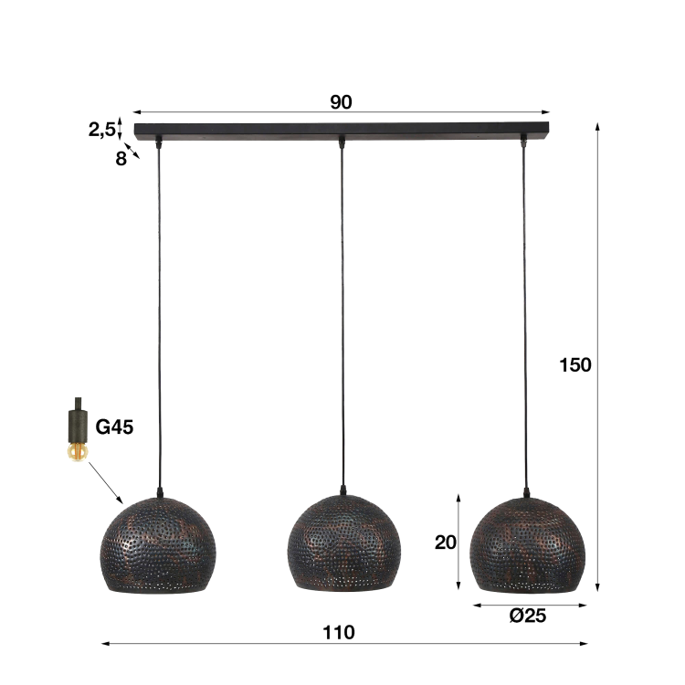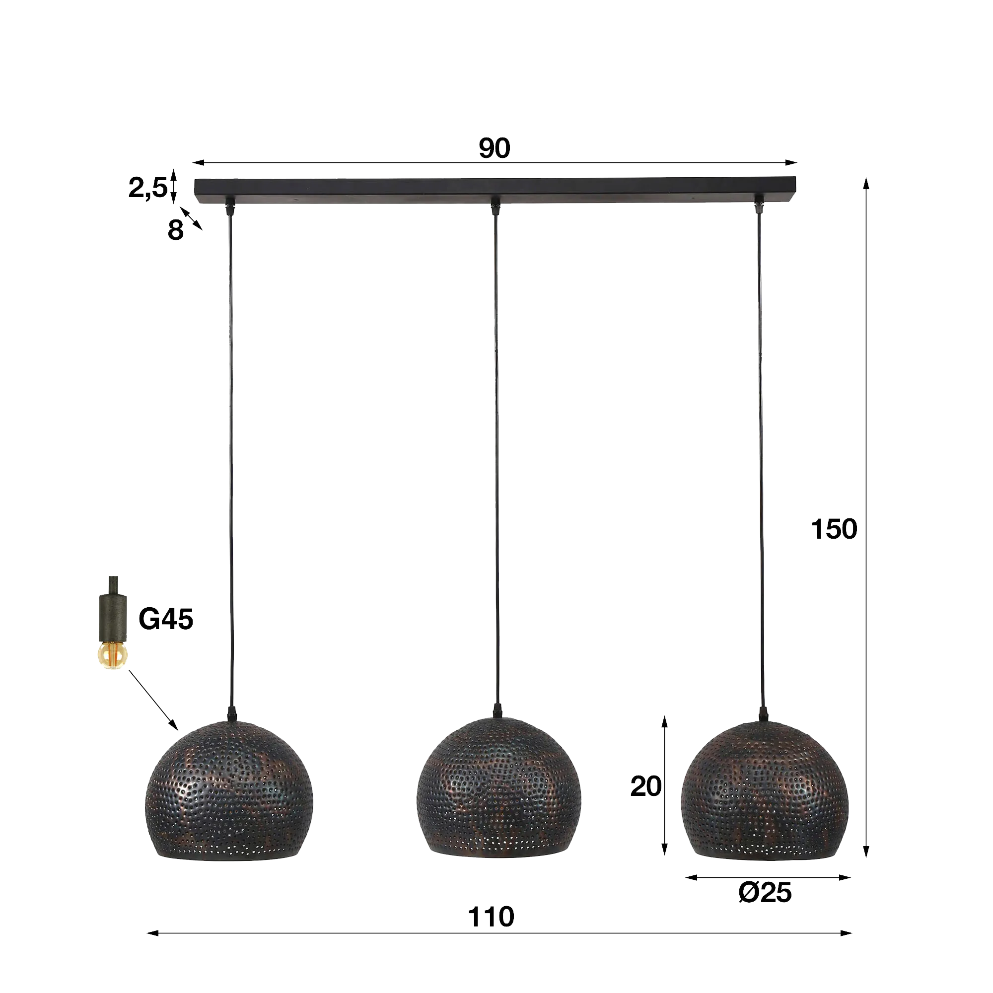 Jeder Lampenschirm, gefertigt aus braunem und schwarzem Metall und von Hand durchbrochen, offenbart eine lebendige Oberfläche, die das Licht sanft und gedämpft streut. Die Öffnungen erzeugen einen lebendigen, leicht strukturierten Lichtschein, der den Eindruck vermittelt, dass das Licht durch das Material atmet. Auf einer 90 cm langen Leiste installiert, finden die drei Kuppeln mit einem Durchmesser von 25 cm ganz natürlich ihr Gleichgewicht über einem Tisch oder einer Arbeitsplatte und verleihen dem Raum Rhythmus und Tiefe. Die höhenverstellbare Aufhängung bis zu 150 cm ermöglicht eine Anpassung an sowohl intime Räume als auch großzügige Volumen.