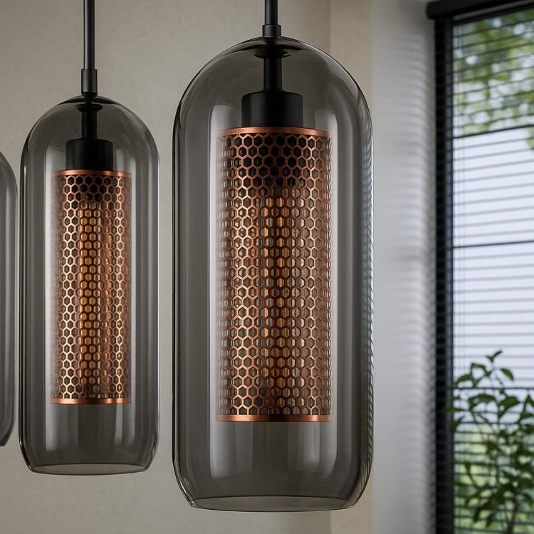 Bei der Gestaltung der Hängeleuchte mit mundgeblasenen, rauchfarbenen Glaslampenschirmen Brila wollten wir eine Leuchte erschaffen, die den Alltag begleitet und zugleich die schlichte Schönheit der Materialien hervorhebt. Die vier mundgeblasenen, rauchfarbenen Glaslampenschirme mit jeweils 15 cm Durchmesser verleihen über einem Tisch oder in einem Wohnbereich eine sanfte, umhüllende Präsenz. Ihre subtile Transparenz lässt ein metallenes, kupferfarbenes Gitter erkennen, das wir mit einem hexagonalen Muster gestaltet haben, ausgewählt wegen seiner feinen Reliefstruktur und der Art, wie es das Licht filtert.