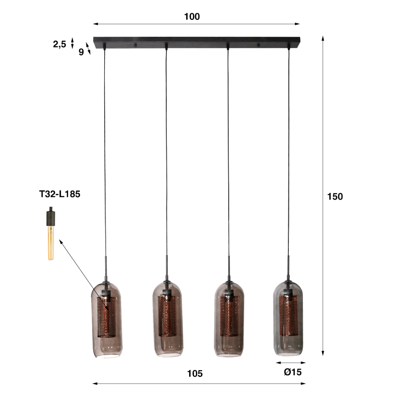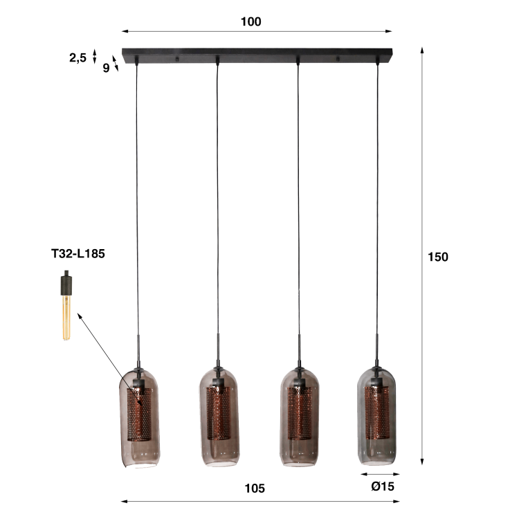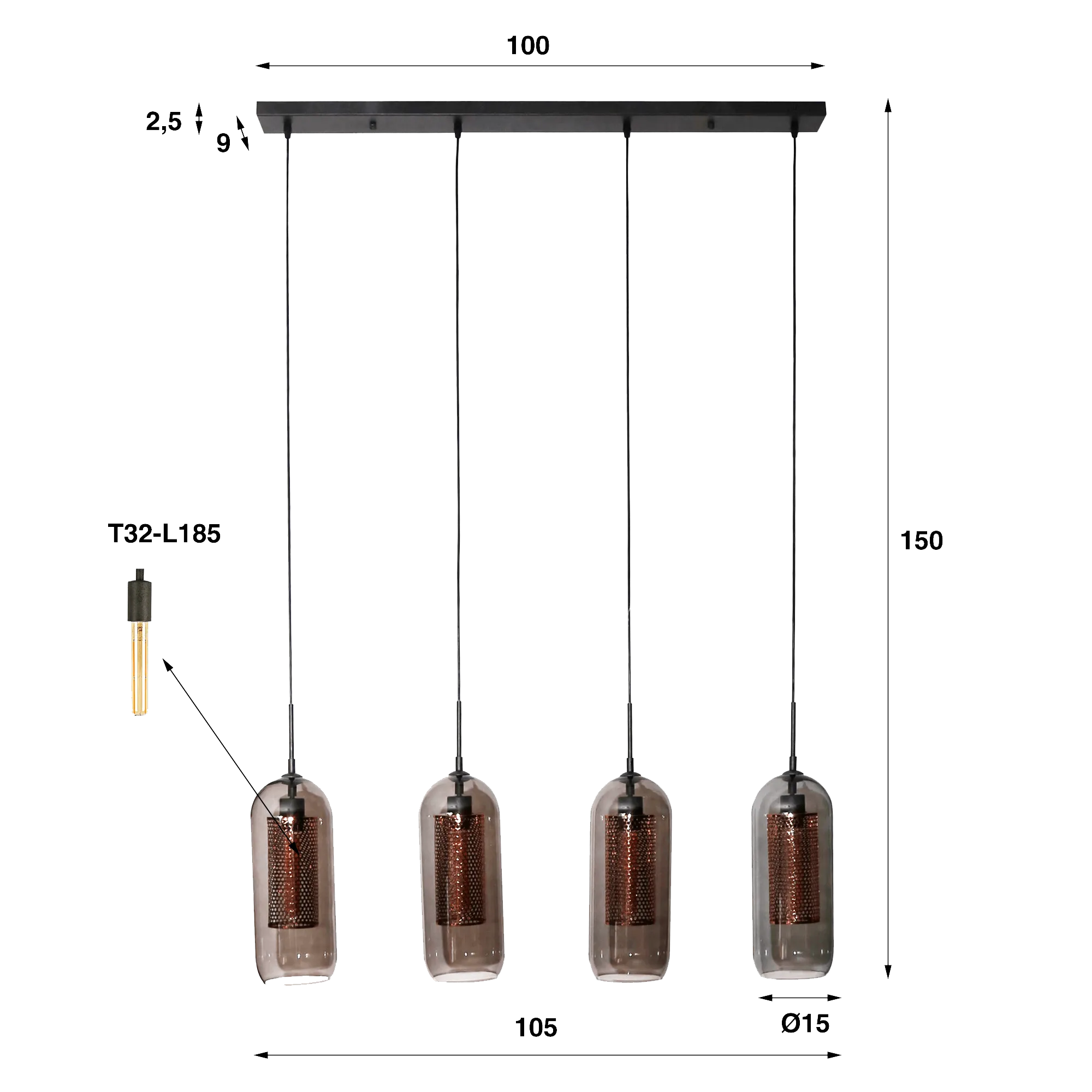 Das schwarze Metall und der warme Ton des Kupfers ergänzen sich auf natürliche Weise und schaffen einen raffinierten Kontrast, den wir besonders schätzen. Der leicht abgerundete, mundgeblasene Glasschirm verbreitet ein harmonisches Licht, ideal für Mahlzeiten oder um einen großen Raum warm zu beleuchten. Die Installation dieser Hängeleuchte mit mundgeblasenen, rauchfarbenen Glaslampenschirmen ist einfach und intuitiv, sodass man die Leuchte schnell genießen kann. Die T32-L185 Leuchtmittel (nicht enthalten) ermöglichen es zudem, die Lichtstimmung an die gewünschte Atmosphäre anzupassen.