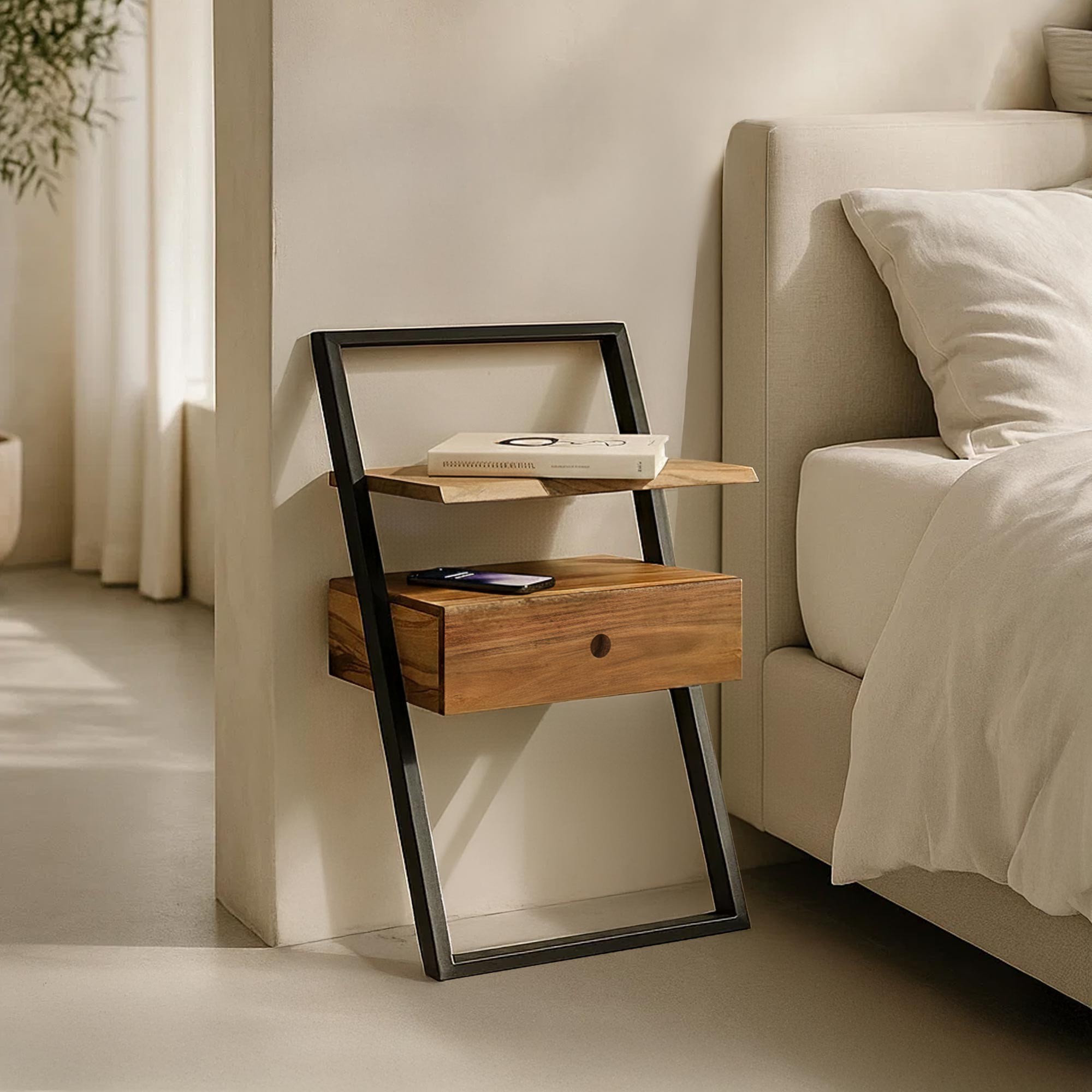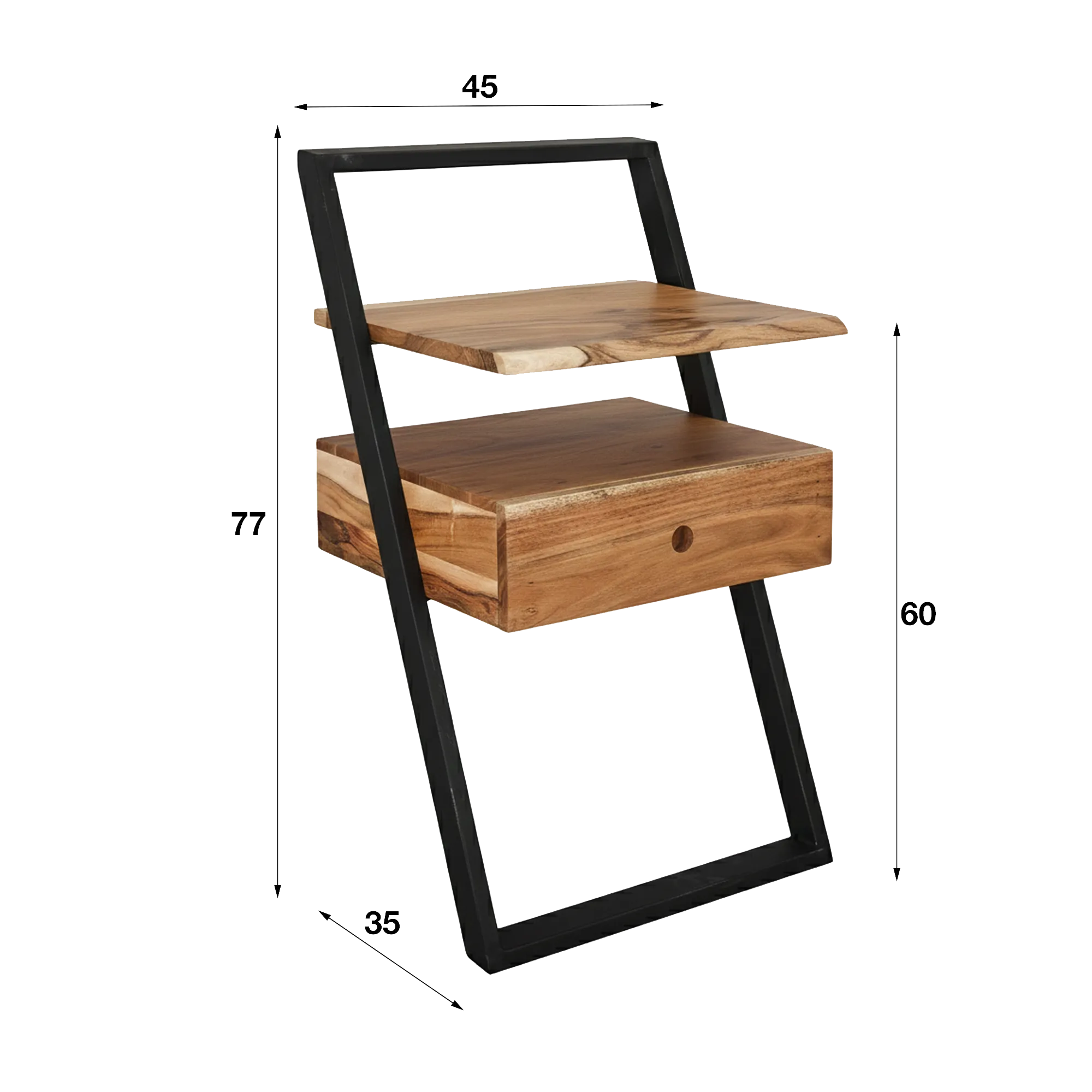 Die grafische Struktur unseres Lean Nachttisches aus massivem Akazienholz, inspiriert vom industriellen Stil mit seinen Konturen aus schwarzem Metall, sorgt für eine beruhigende Stabilität und lässt dem Möbel dennoch Raum zum Atmen. Mit einer Breite von etwa 45 cm und einer Tiefe von rund 35 cm findet der Nachttisch Lean problemlos neben dem Bett Platz, selbst in kompakteren Schlafzimmern. Die Gesamthöhe von ca. 77 cm ermöglicht eine komfortable Nutzung, während die obere Ablagefläche in etwa 60 cm Höhe ideal Platz für eine Lampe, ein Buch oder ein Smartphone bietet.