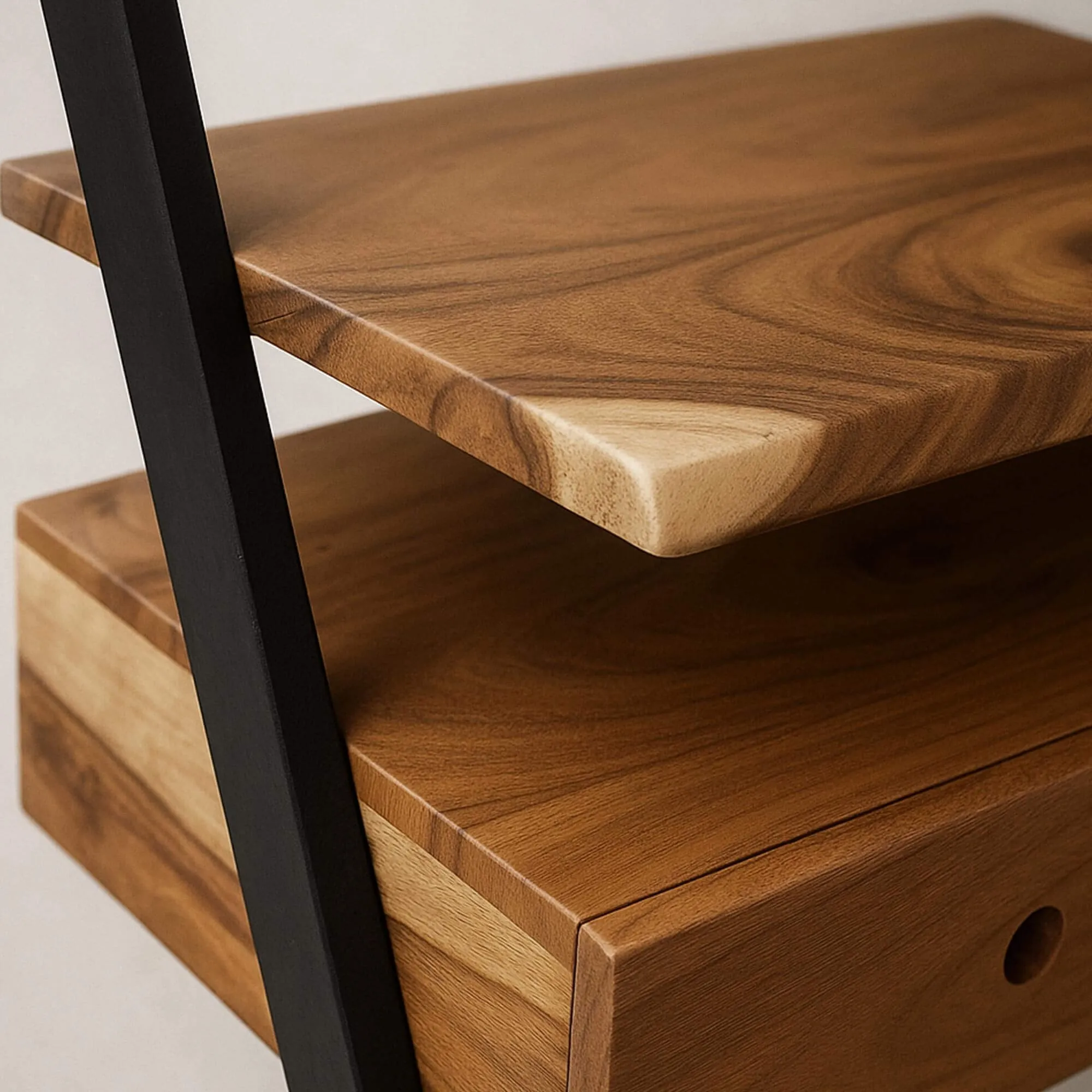 Als ausgewogenes Zusammenspiel aus industrieller Strenge und natürlicher Wärme konzipiert, verkörpert der Nachttisch aus massivem Akazienholz Lean unsere Art, Alltagsmöbel zu gestalten: funktional, ehrlich und charakterstark. Bereits in den ersten Entwürfen suchten unsere Designer nach einer leichten, aber selbstbewussten Präsenz, die den Raum strukturiert, ohne ihn zu beschweren.