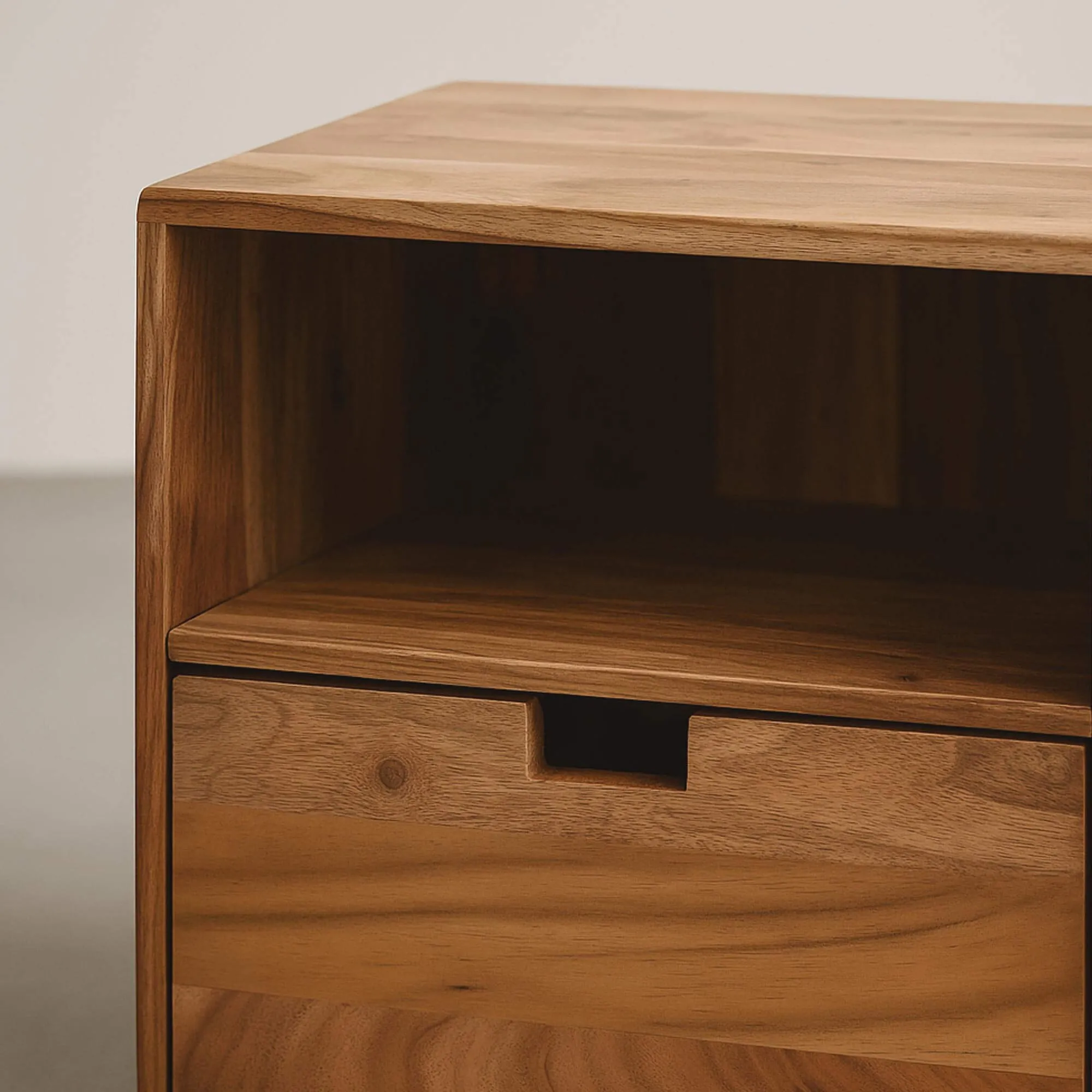 An der Wand montiert, gibt dieser hängende Nachttisch aus Massivholz den Boden frei und schafft ein Gefühl von Großzügigkeit – besonders geschätzt in einem puristischen Schlafzimmer. Sein kompaktes Format passt sich mühelos modernen Raumkonzepten an: Mit einer Breite von 30 cm, einer Tiefe von 25 cm und einer Höhe von 30 cm bietet er ausreichend Platz für eine Lampe, ein Buch oder persönliche Alltagsgegenstände. Im Inneren ermöglicht das offene Fach das Ablegen eines Buches oder Tablets, während die Schublade mit einer nutzbaren Höhe von etwa 10 cm persönliche Dinge elegant verbirgt. Die Grifföffnung ist direkt in die Front integriert und sorgt für eine klare, ruhige Linienführung.