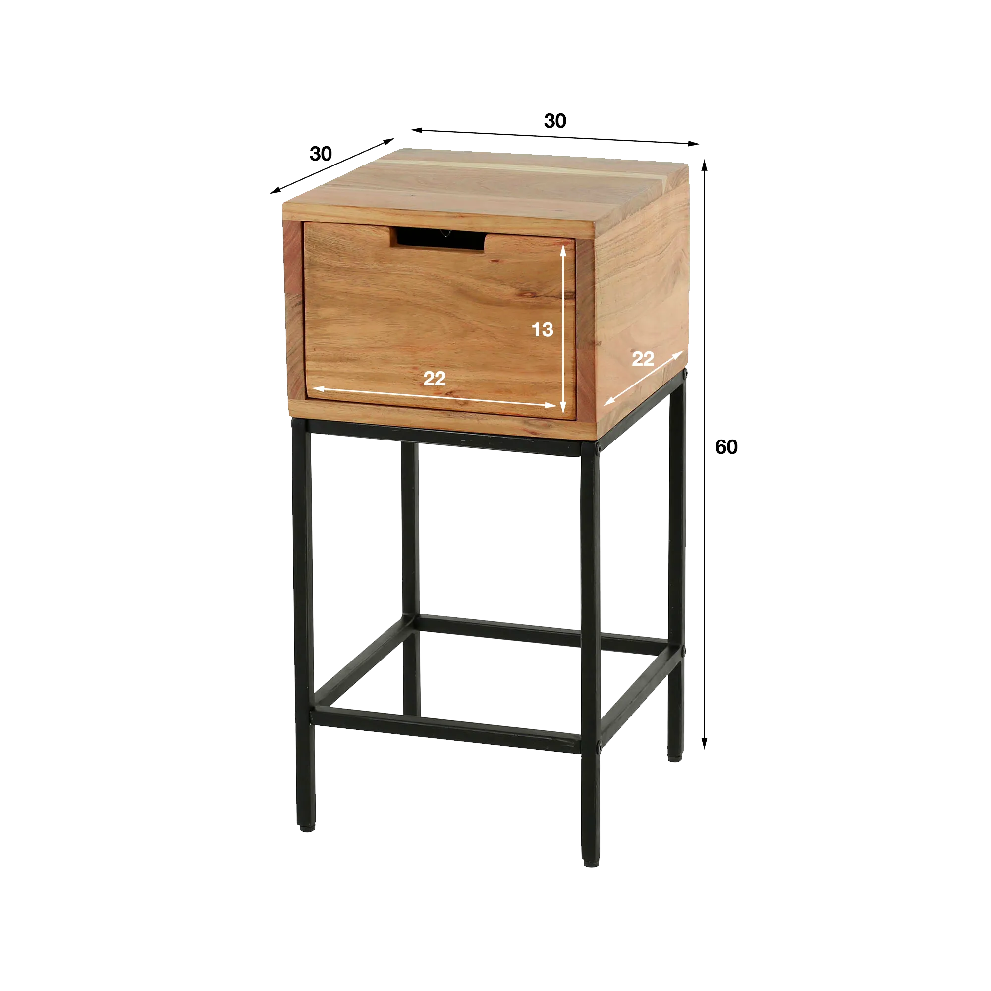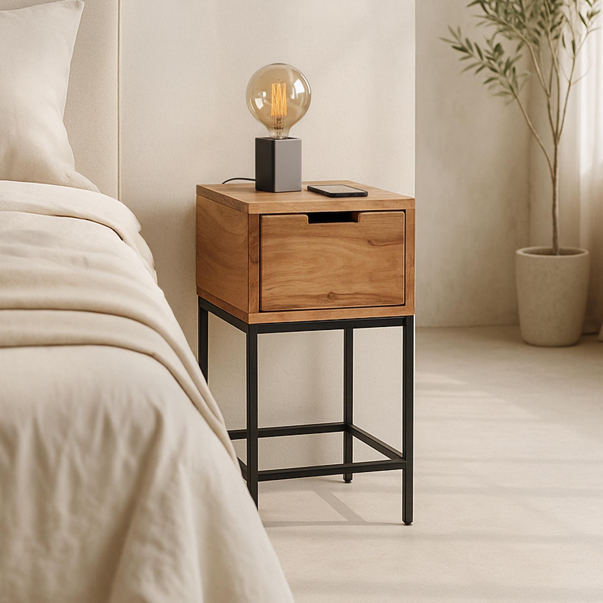 Funktional ohne aufdringlich zu wirken, verfügt der Nachttisch über eine Schublade mit durchdachten Proportionen, die etwa 22 cm nutzbare Breite und 13 cm Innenhöhe bietet. Sie nimmt problemlos Bücher, Brillen oder persönliche Gegenstände auf, während die obere Ablagefläche von 30 x 30 cm Platz für eine Lampe, einen Wecker oder ein Smartphone bietet. Die Gesamthöhe von etwa 60 cm sorgt für einen komfortablen Gebrauch dieses Nachttischs aus Holz und Metall im Industrial-Stil – sowohl bei niedrigen Betten als auch bei höheren Lattenrosten.