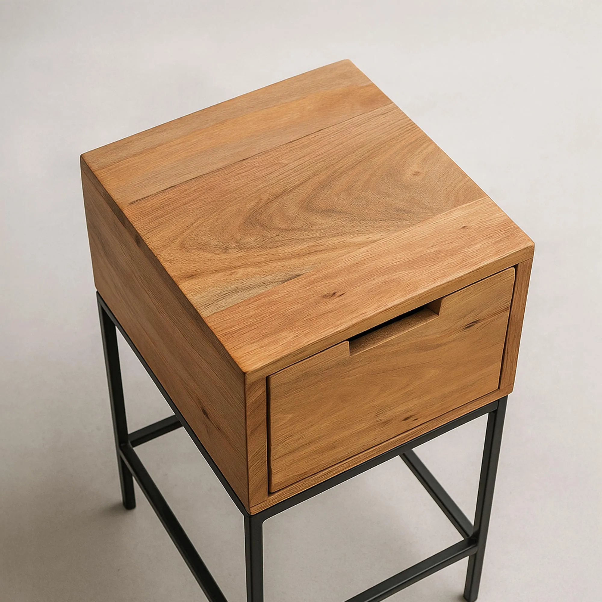 Gefertigt aus massivem Akazienholz, offenbart dieser Nachttisch aus Holz und Metall im Industrial-Stil eine lebendige Maserung mit subtilen Nuancen, die jedes Stück einzigartig machen. Die Haptik ist von Natur aus warm, und die sorgfältig ausgearbeitete Oberfläche bringt den gesamten Reichtum des Holzes zur Geltung. Akazienholz, bekannt für seine Robustheit, gewährleistet eine hervorragende Langlebigkeit – selbst bei intensiver täglicher Nutzung. Auf einem Gestell aus schwarzem Metall platziert, gewinnt das Möbel an visueller Leichtigkeit und bietet gleichzeitig perfekte Stabilität. Dieser Kontrast zwischen rohem Material und industrieller Linienführung gehört zur DNA dieses Nachttischs aus Holz und Metall im Industrial-Stil.