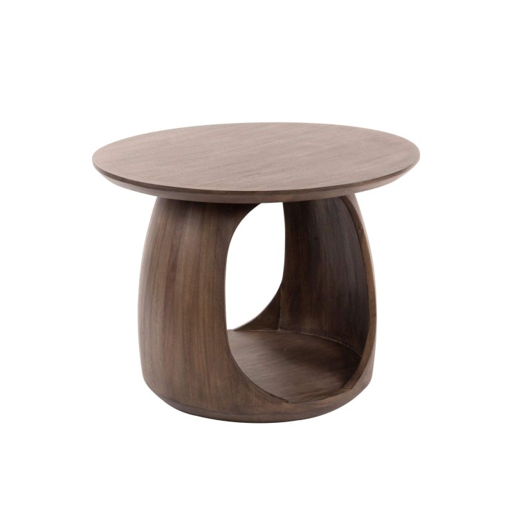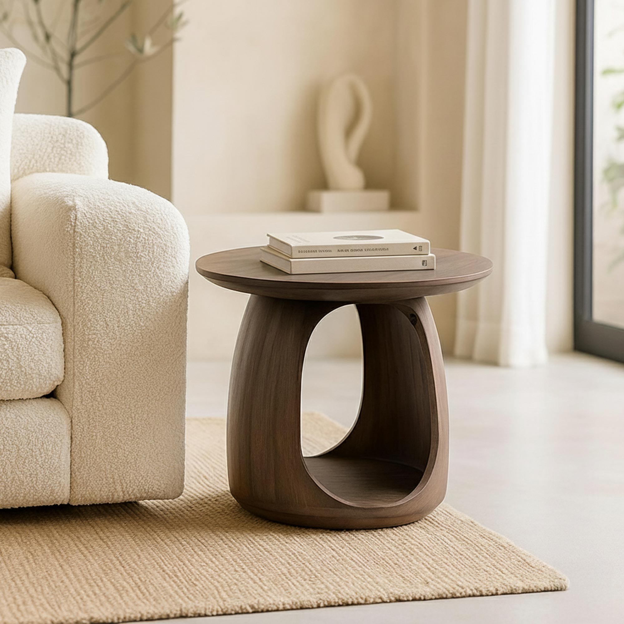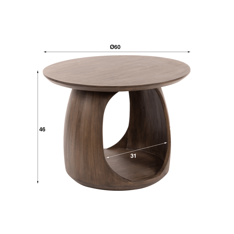 Die runde Tischplatte bietet eine angenehme Ablagefläche, ideal für ein Buch, eine Tasse oder ein dekoratives Objekt, und bewahrt dabei harmonische Proportionen. Mit einem Durchmesser von etwa 60 cm und einer Höhe von rund 46 cm befindet sich der Beistelltisch aus massivem Akazienholz Origin auf natürliche Weise in Griffnähe, ohne den Raum zu beschweren. Die Konstruktion integriert eine dezente seitliche Öffnung, die ein Innenvolumen von ca. 31 cm Breite bildet – gedacht, um Zeitschriften aufzubewahren oder das Wesentliche griffbereit zu halten, ohne visuelle Unruhe zu erzeugen.