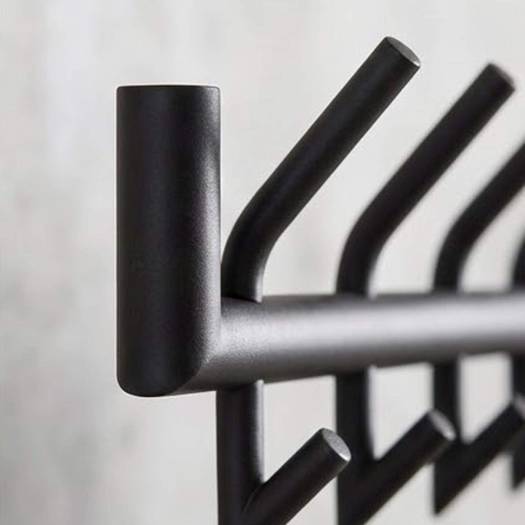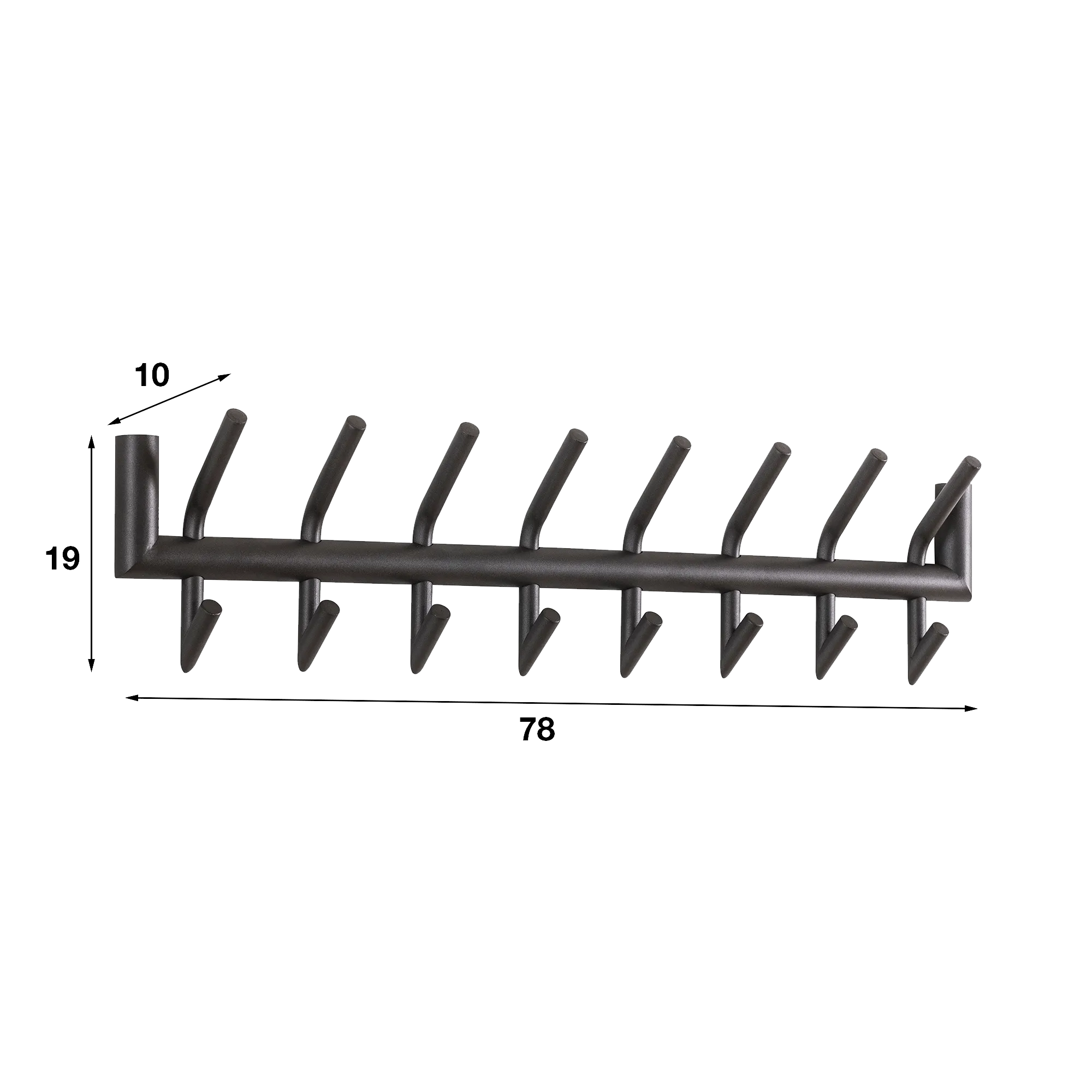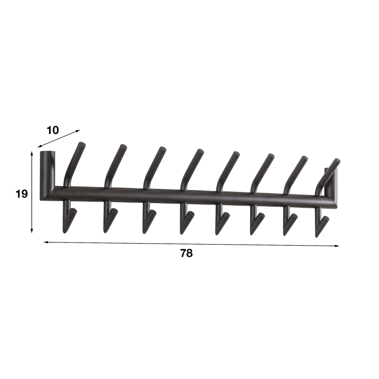 Mit einer Länge von 78 cm findet die industrielle Wandgarderobe aus Metall Nord problemlos ihren Platz im Eingangsbereich, im Flur oder sogar im Schlafzimmer. Die kompakte Höhe von 19 cm ermöglicht eine angenehme Montage, ohne die Wand zu beschweren, während die Tiefe von etwa 10 cm ausreichend Freiraum bietet, um mehrere Kleidungsstücke gleichzeitig aufzuhängen. Die gleichmäßig über die gesamte Struktur verteilten Haken sorgen für großzügigen und gut organisierten Stauraum – ideal für den Alltag.